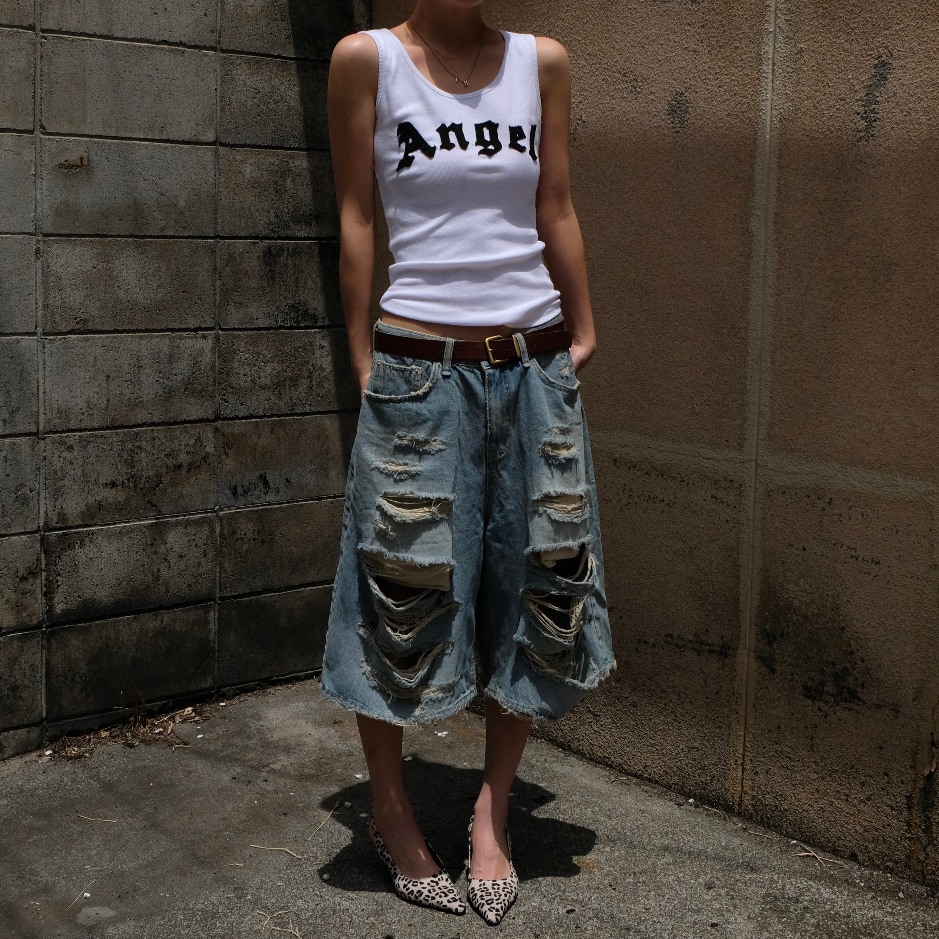 大胆なクラッシュ加工が目を惹く、存在感たっぷりのハーフデニム。
