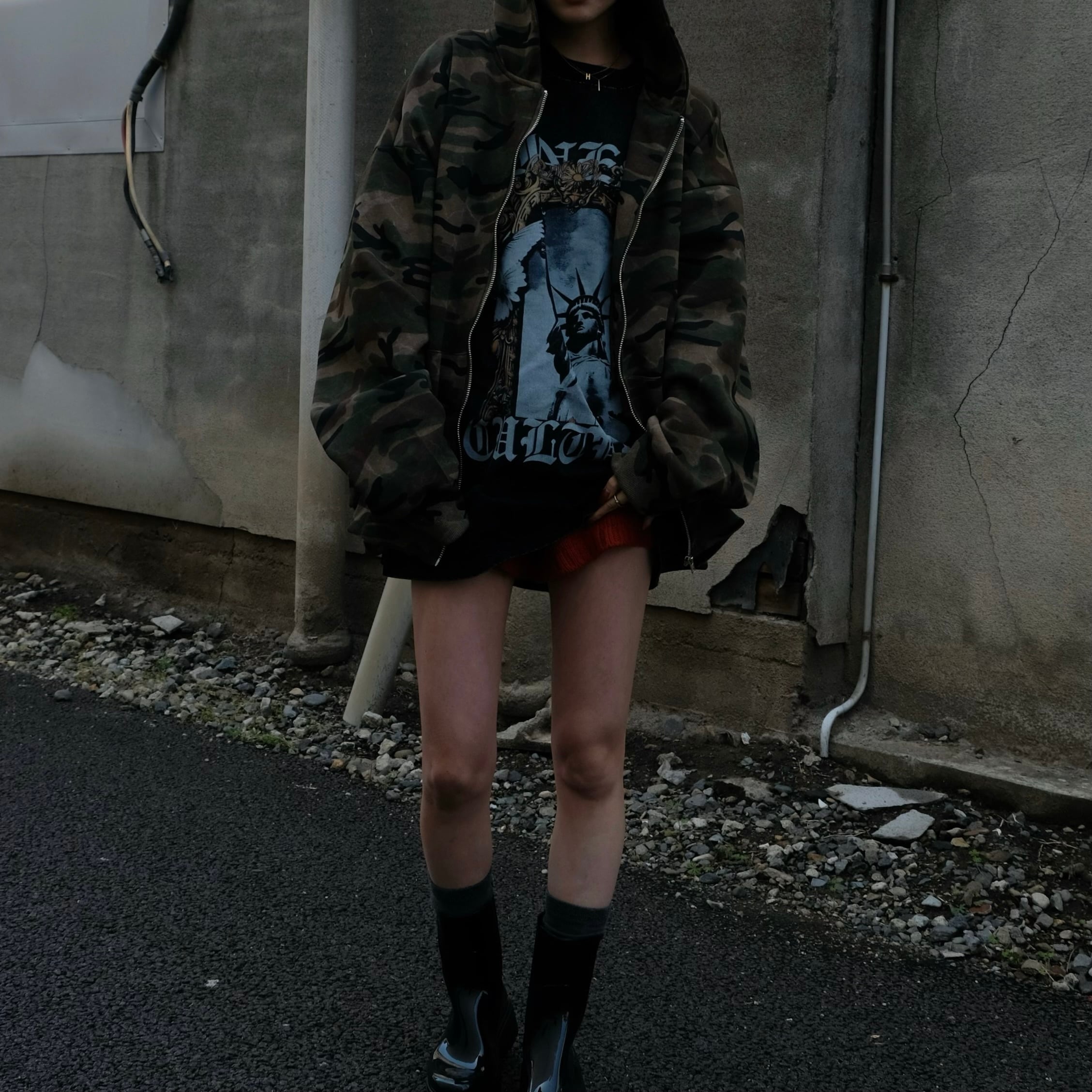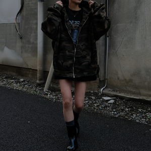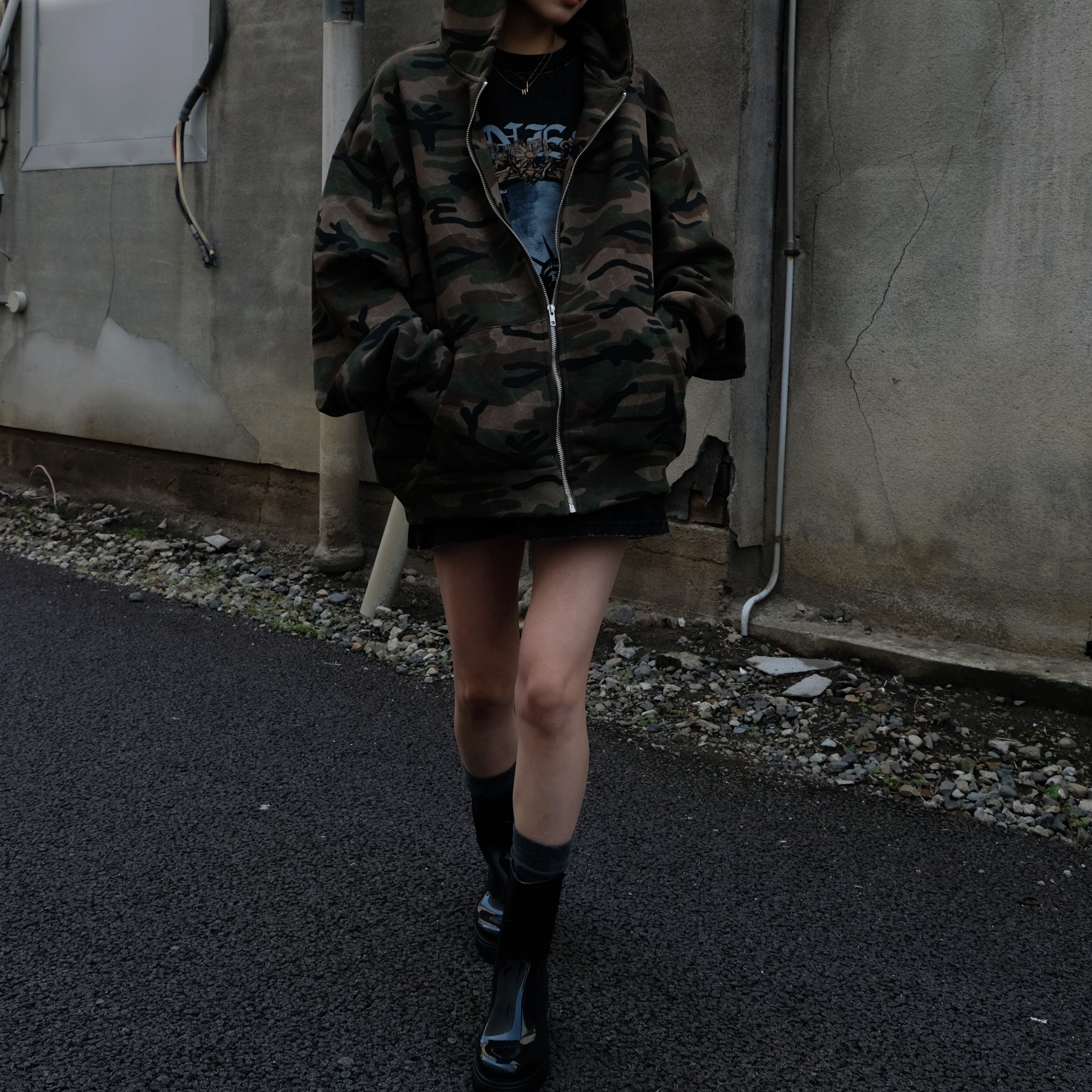 気取らず着られるのにちょっと差がつく、さりげない抜け感を添えたカモフラ柄のジップフーディ。