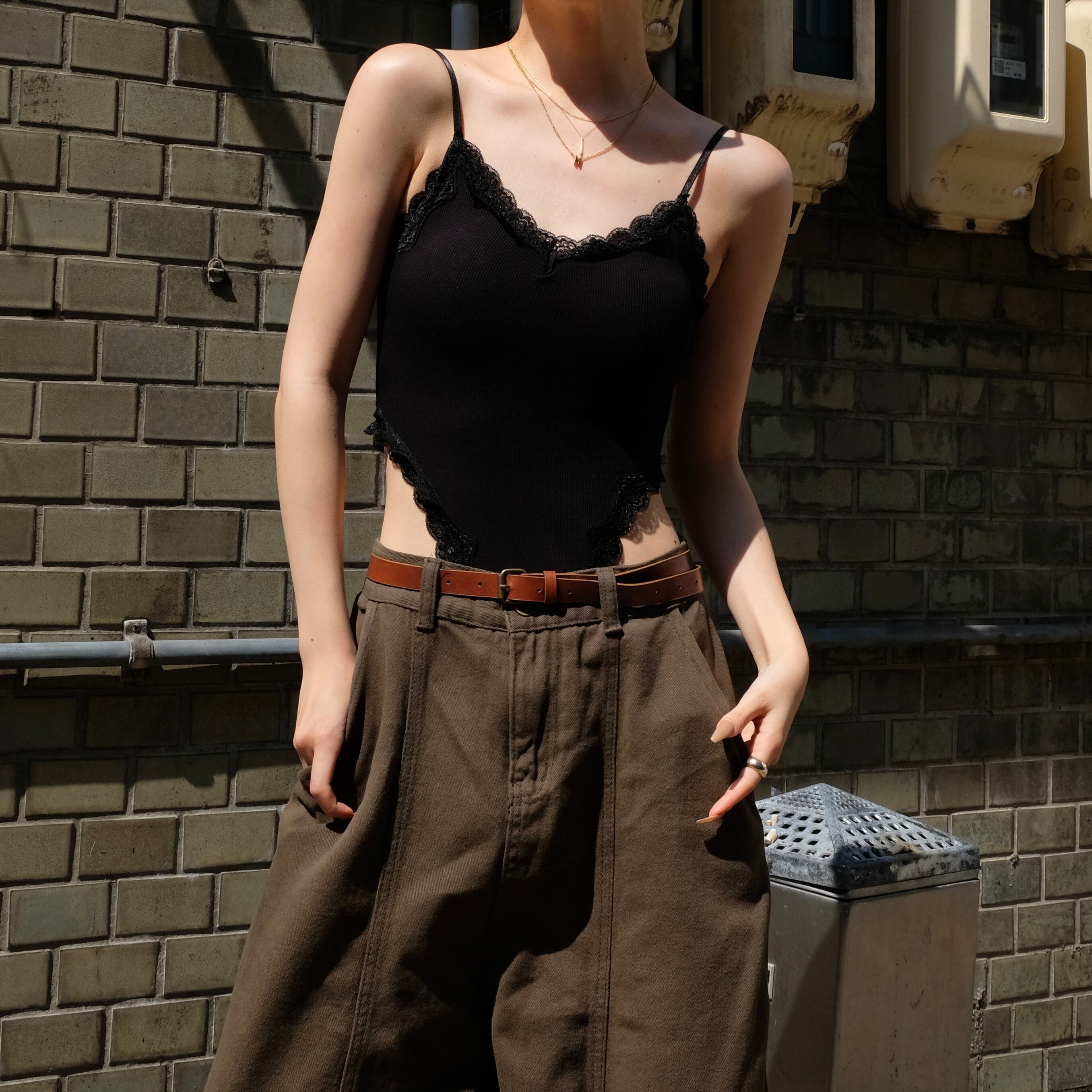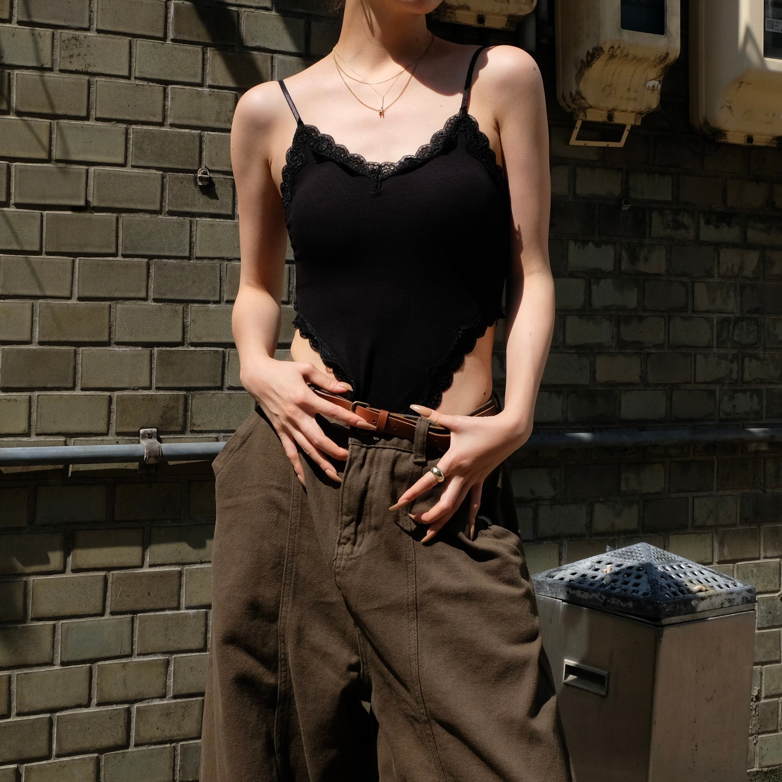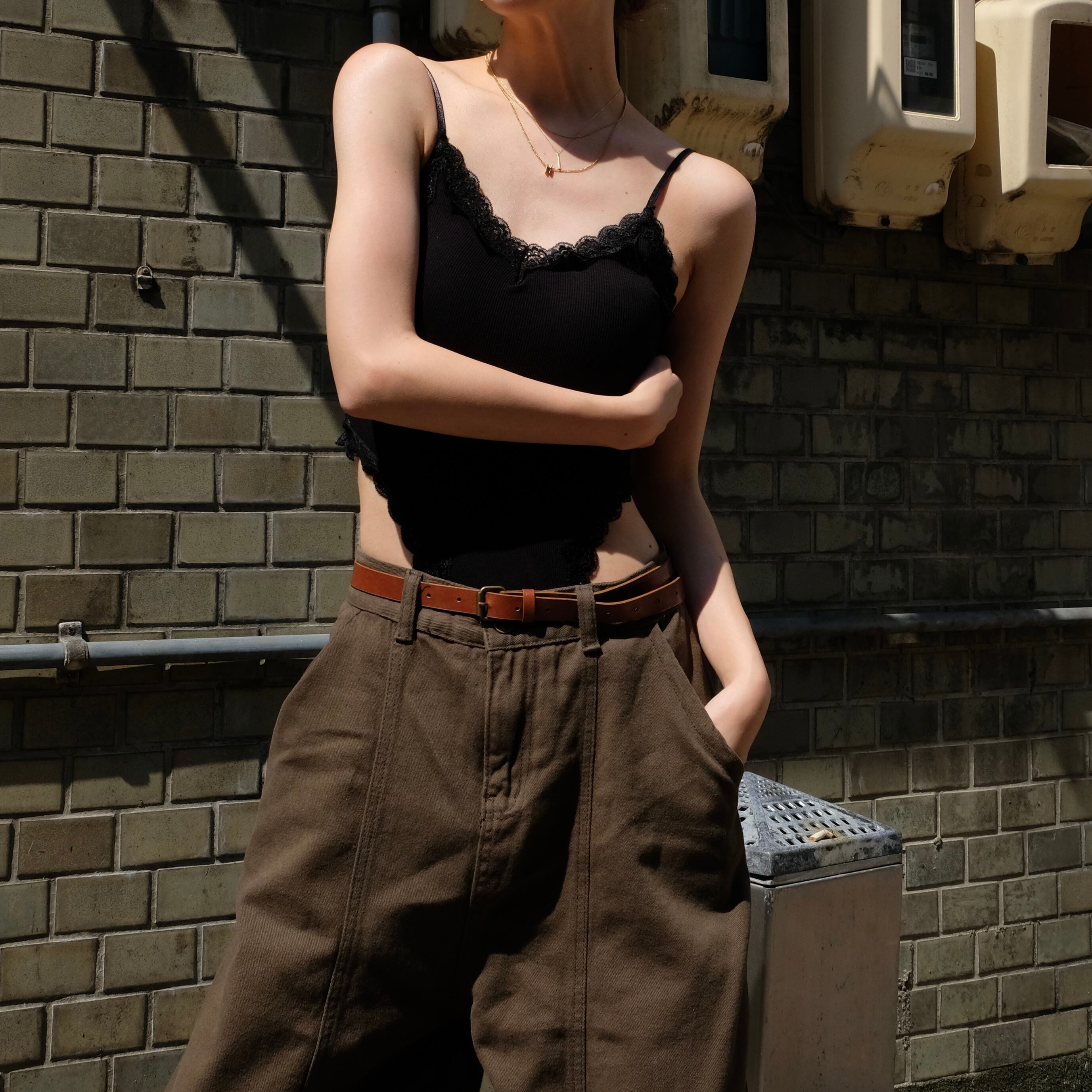 リブ素材の程よいフィット感にレースの縁取りが生み出す立体感が加わり、スタイリングに奥行きをプラス。