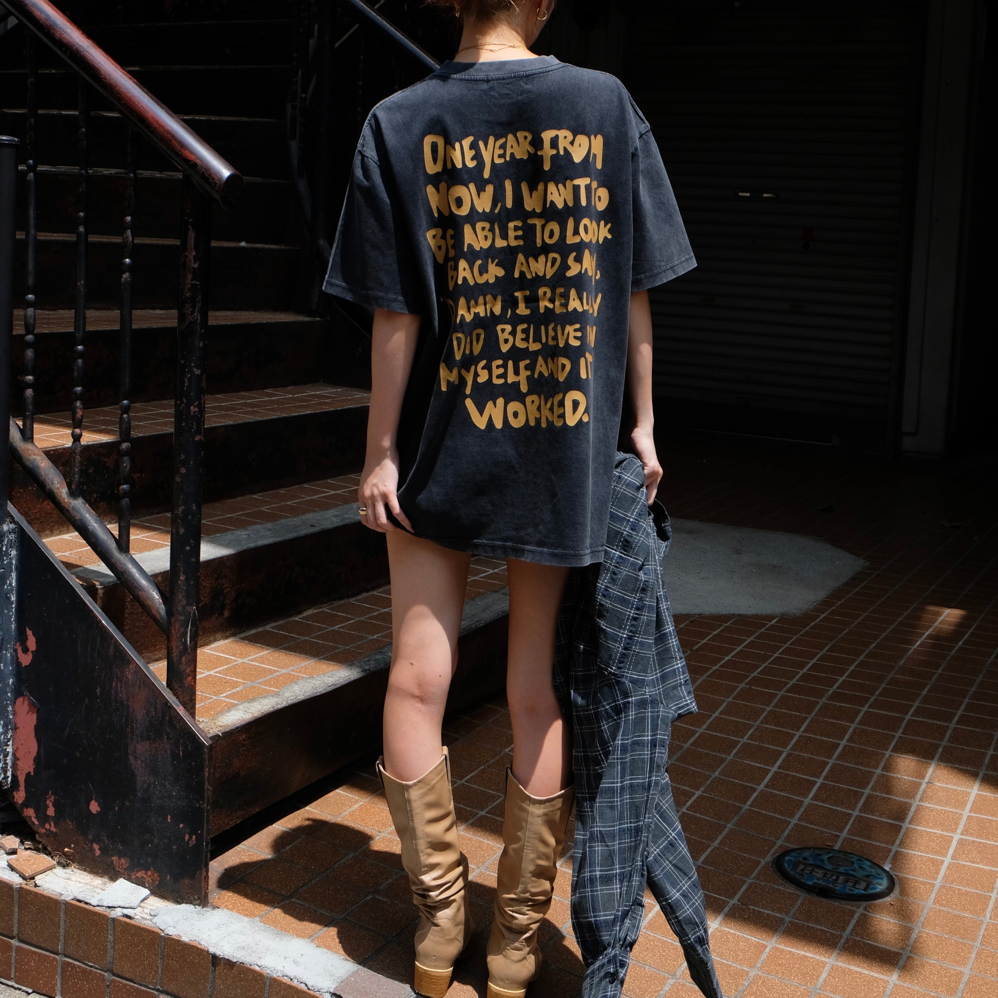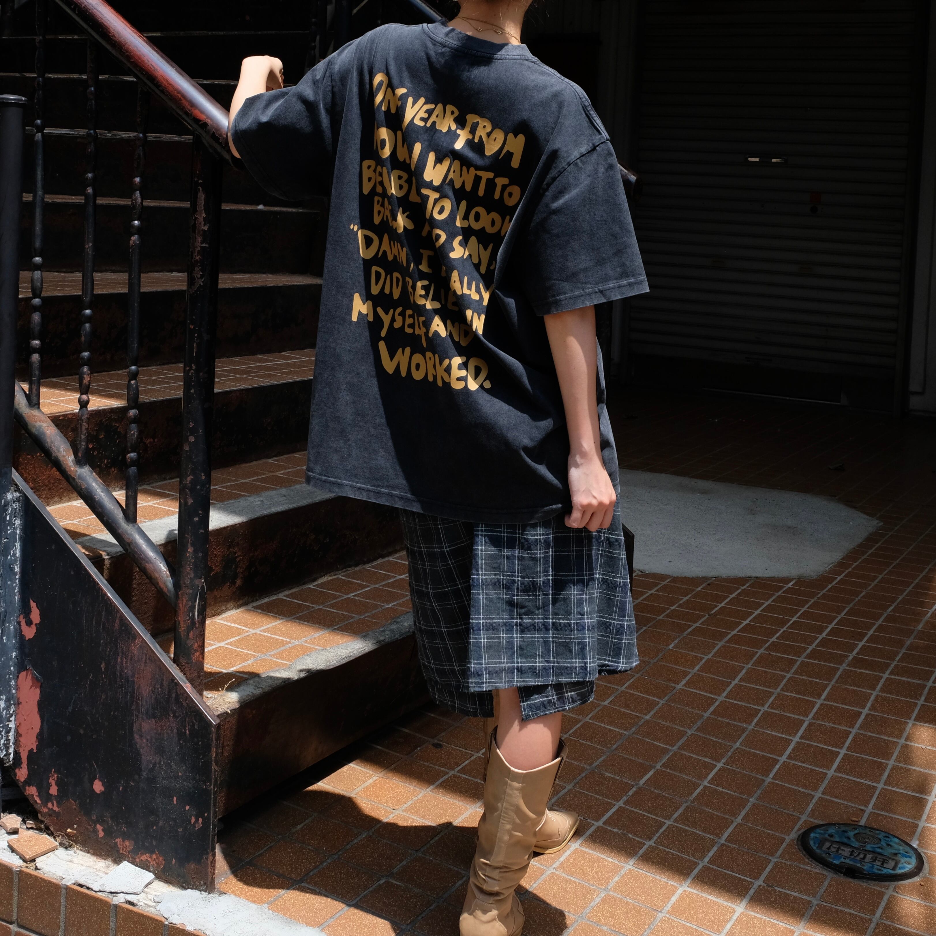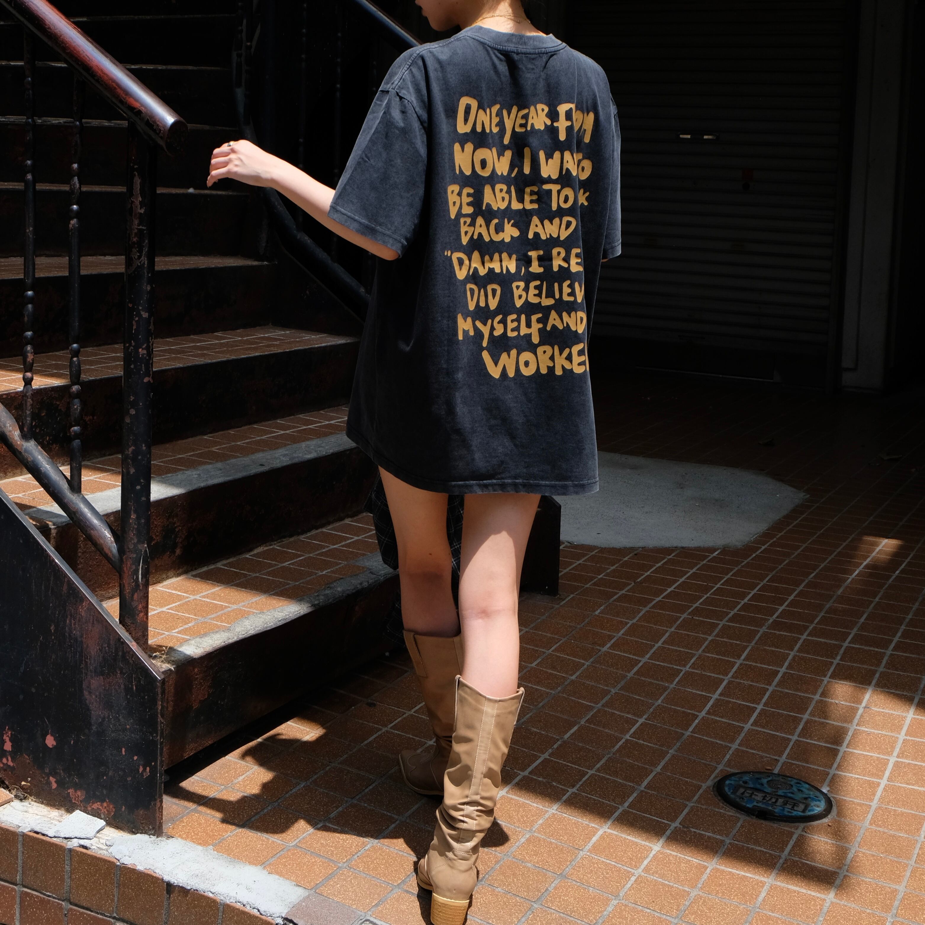 程よく色落ちしたチャコールのボディにイエローのロゴが、ヴィンテージライクな雰囲気を引き立てます。