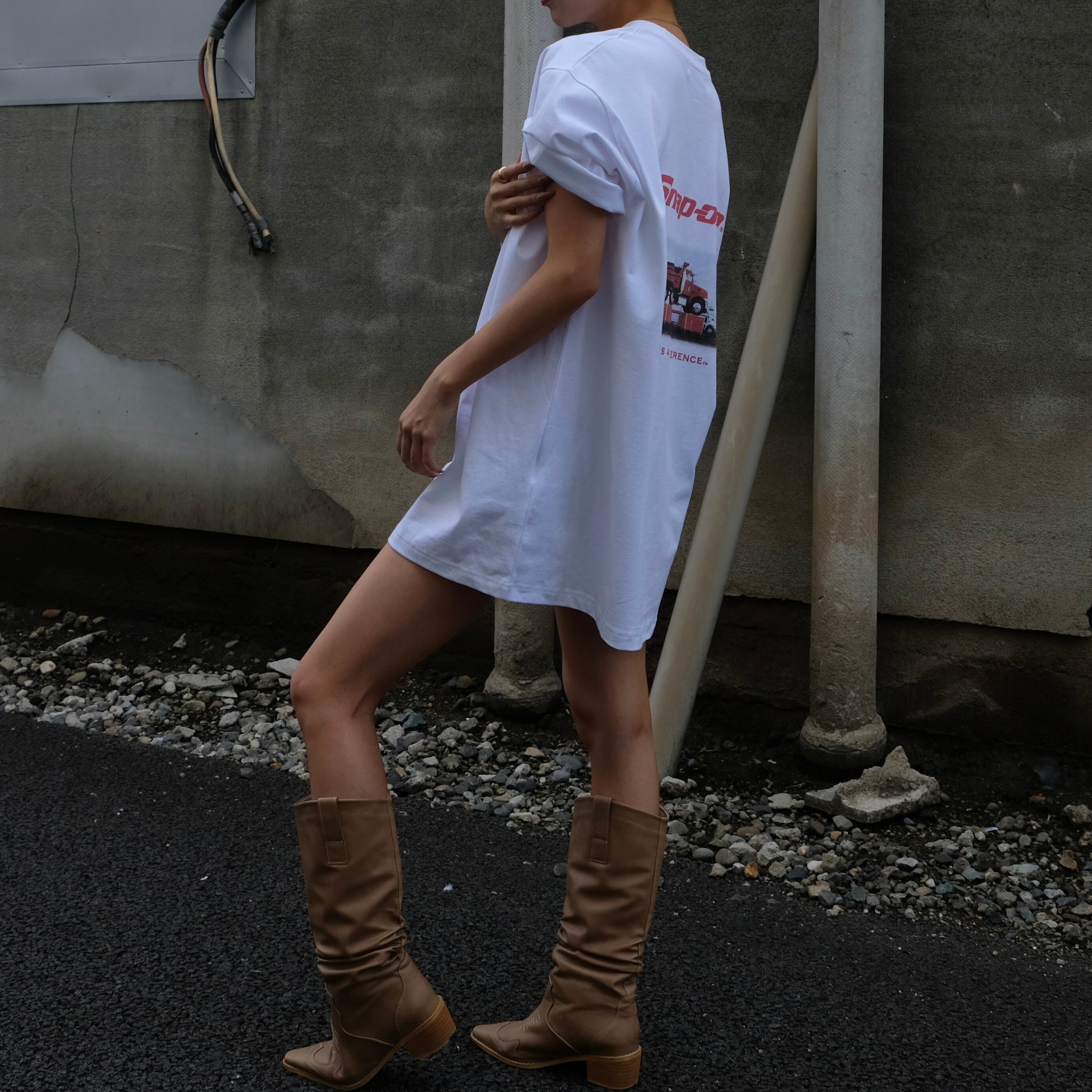 大胆にプリントされたトラックのグラフィックが目を引くバックプリントTシャツ。