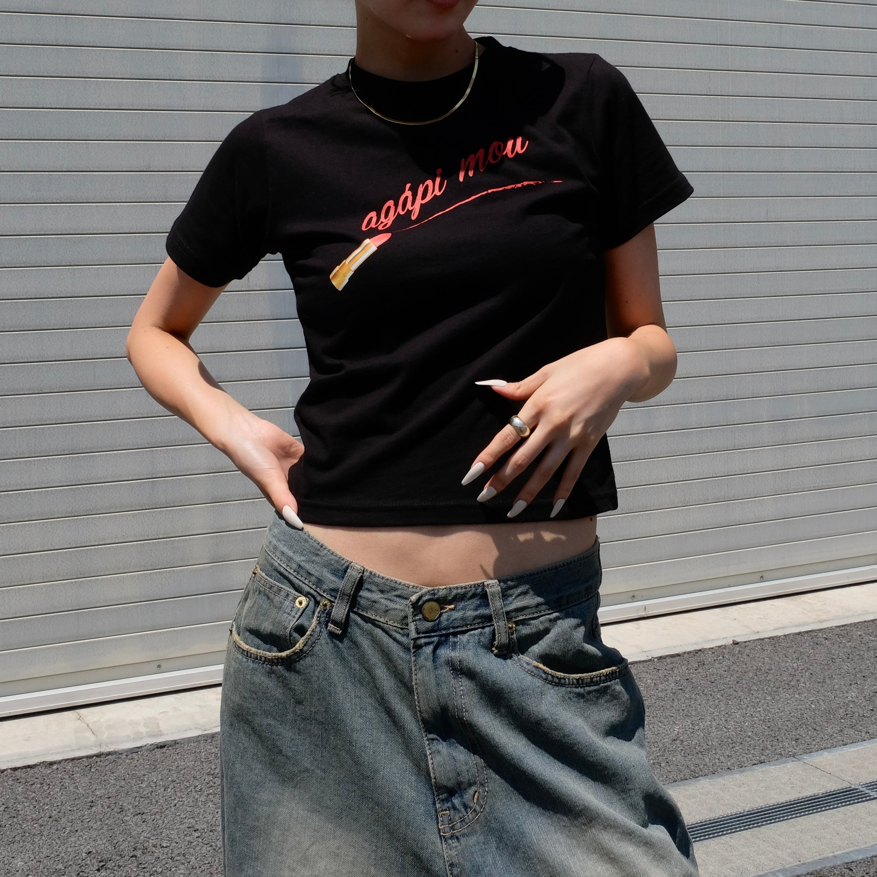 リップスティックで描いたようなメッセージが目を引くプリントTシャツ。