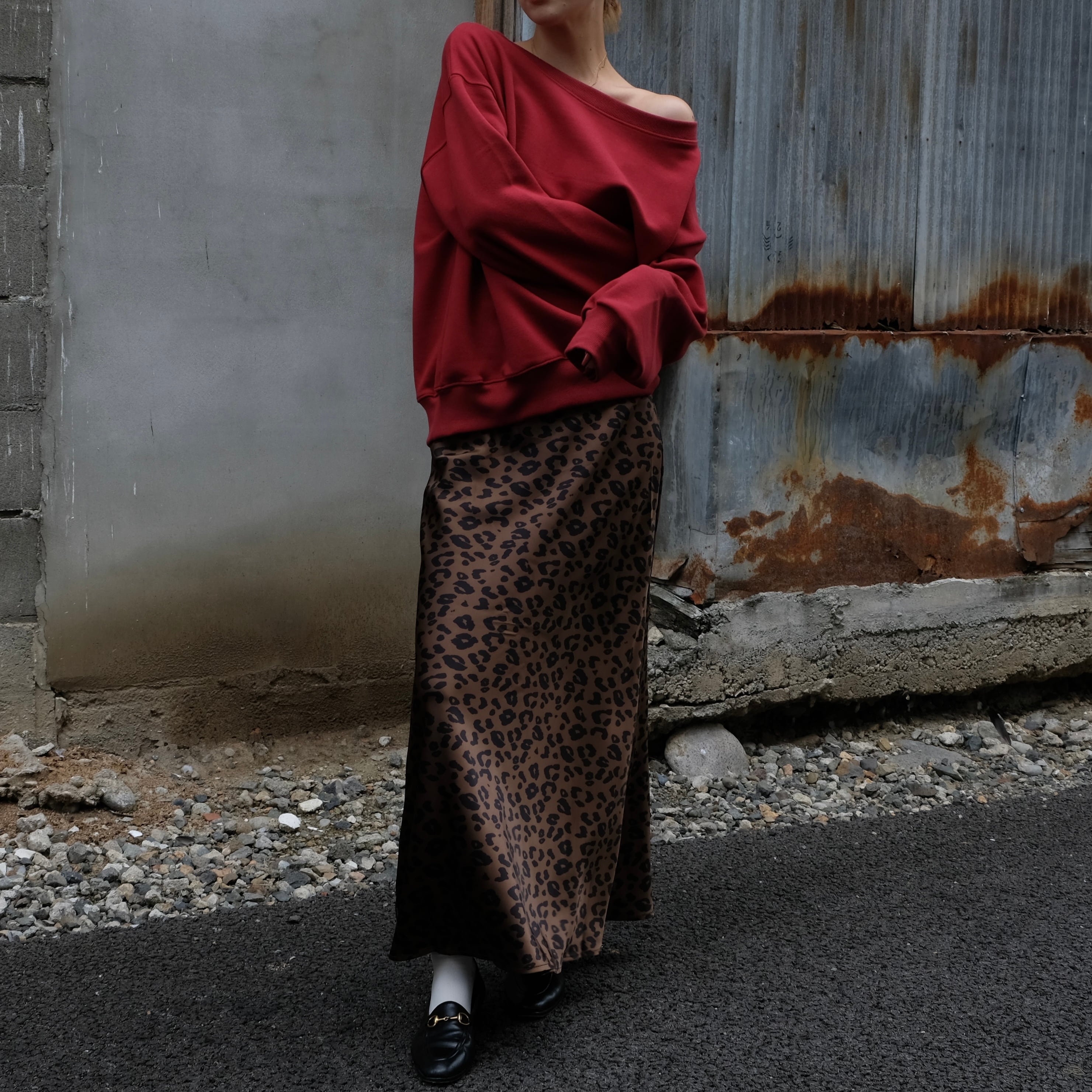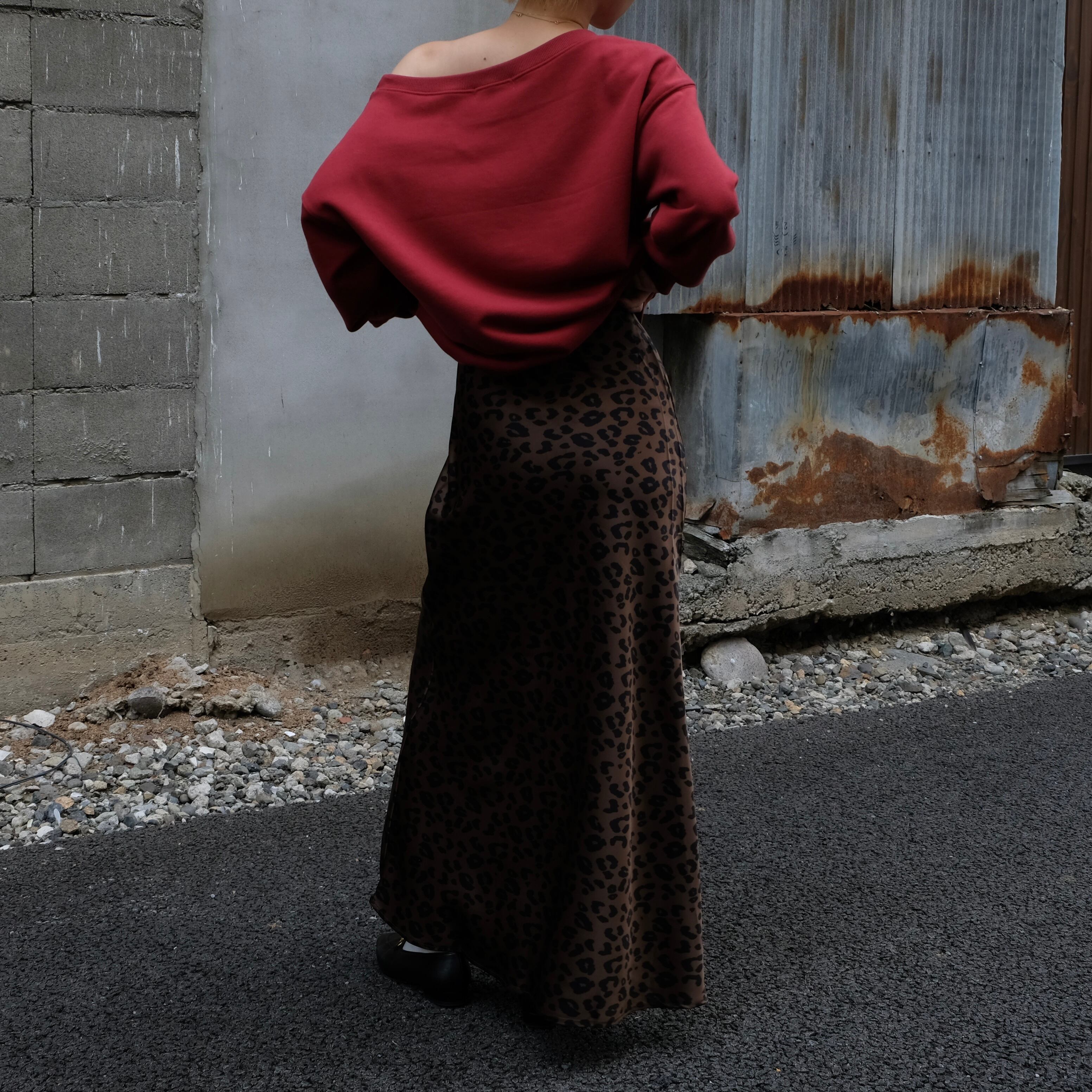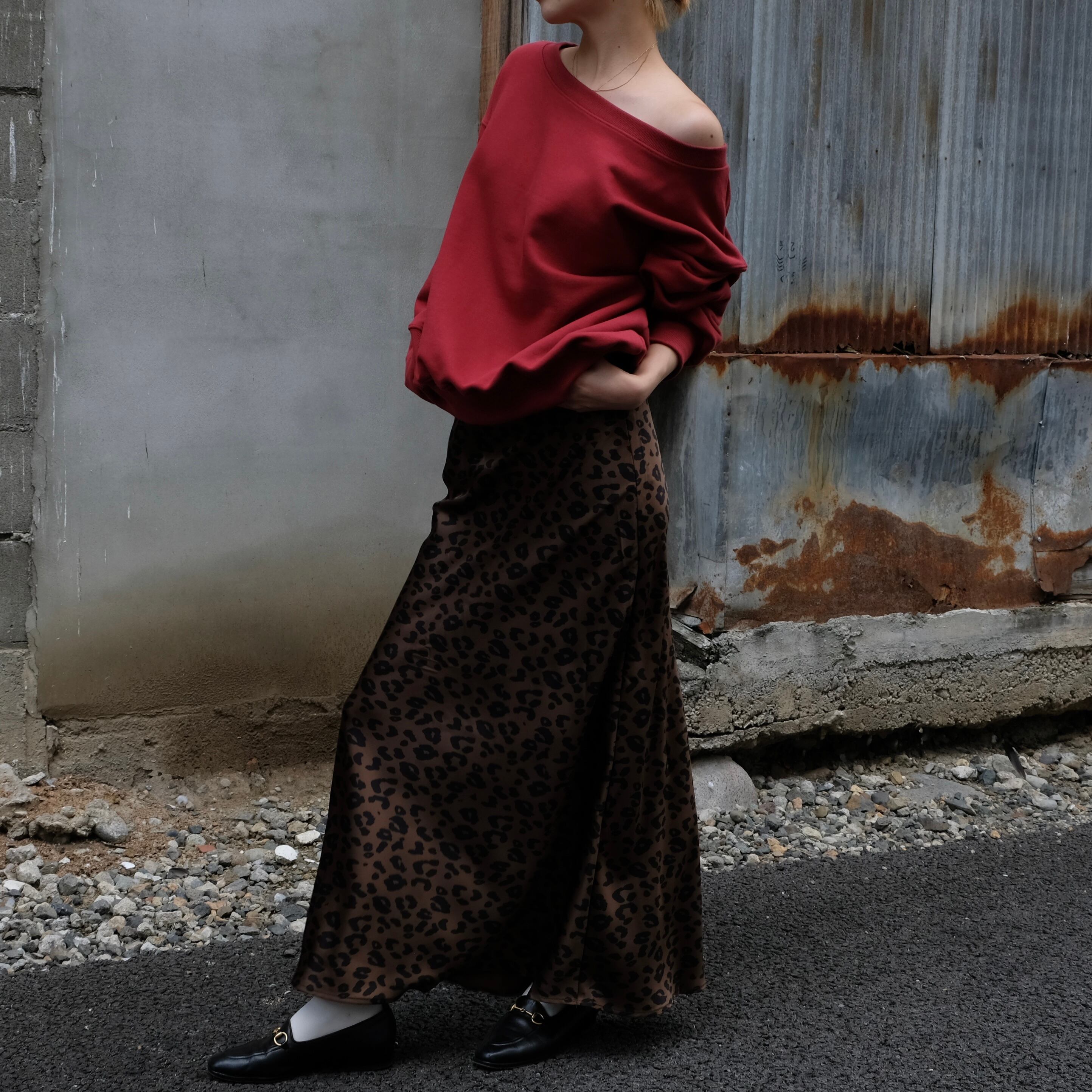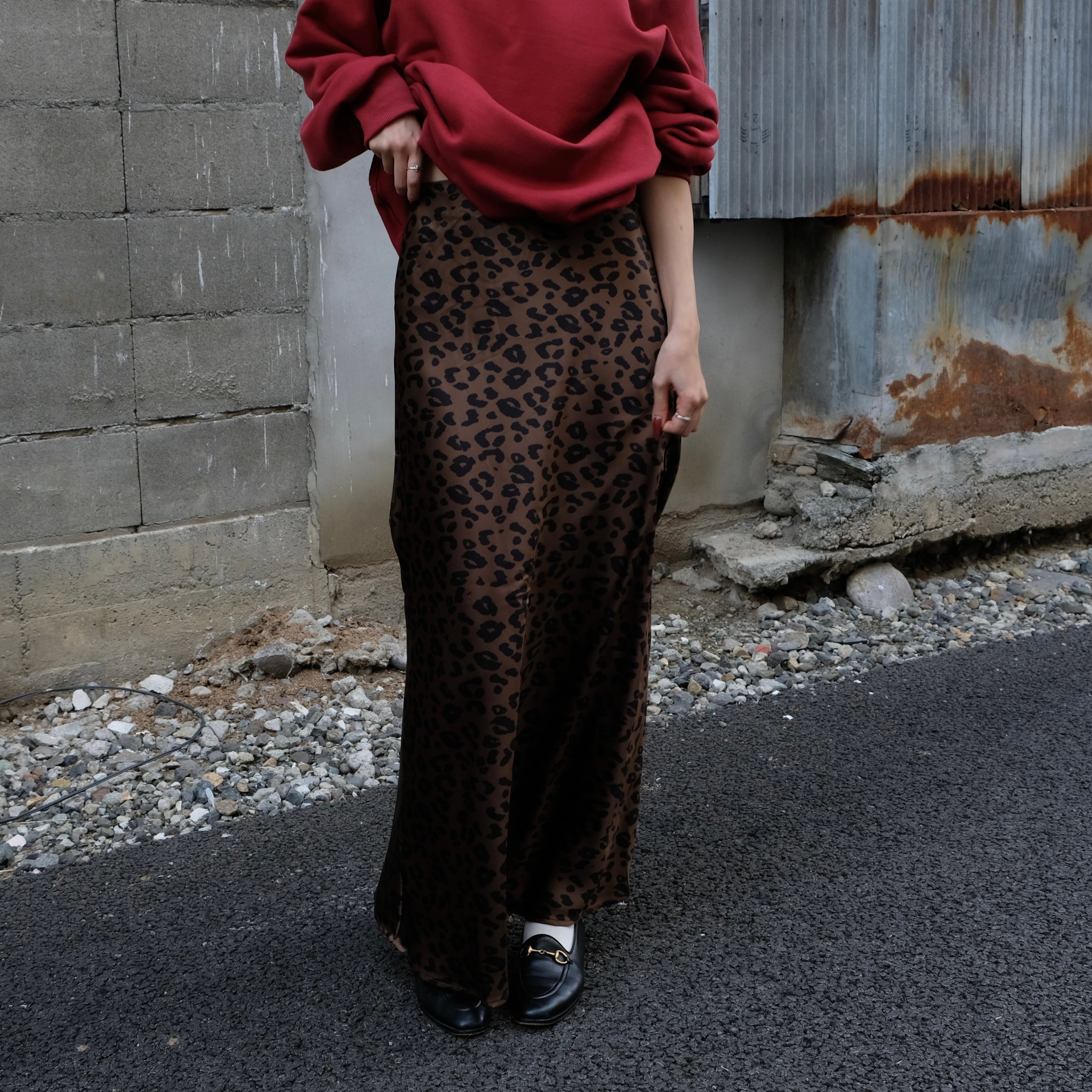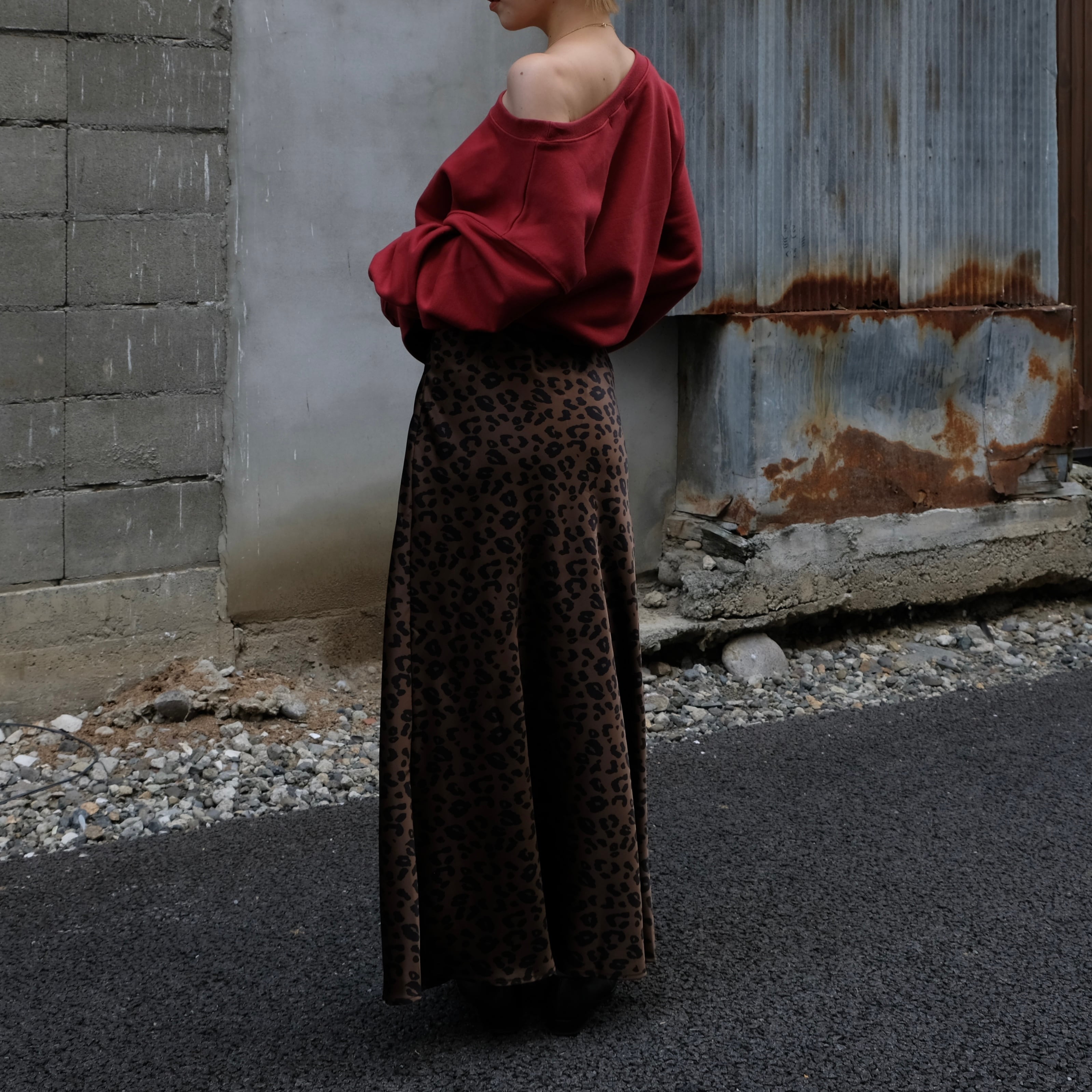 落ち着いたブラウンにブラックのレオパードをのせた、モードな印象のフレアスカート。