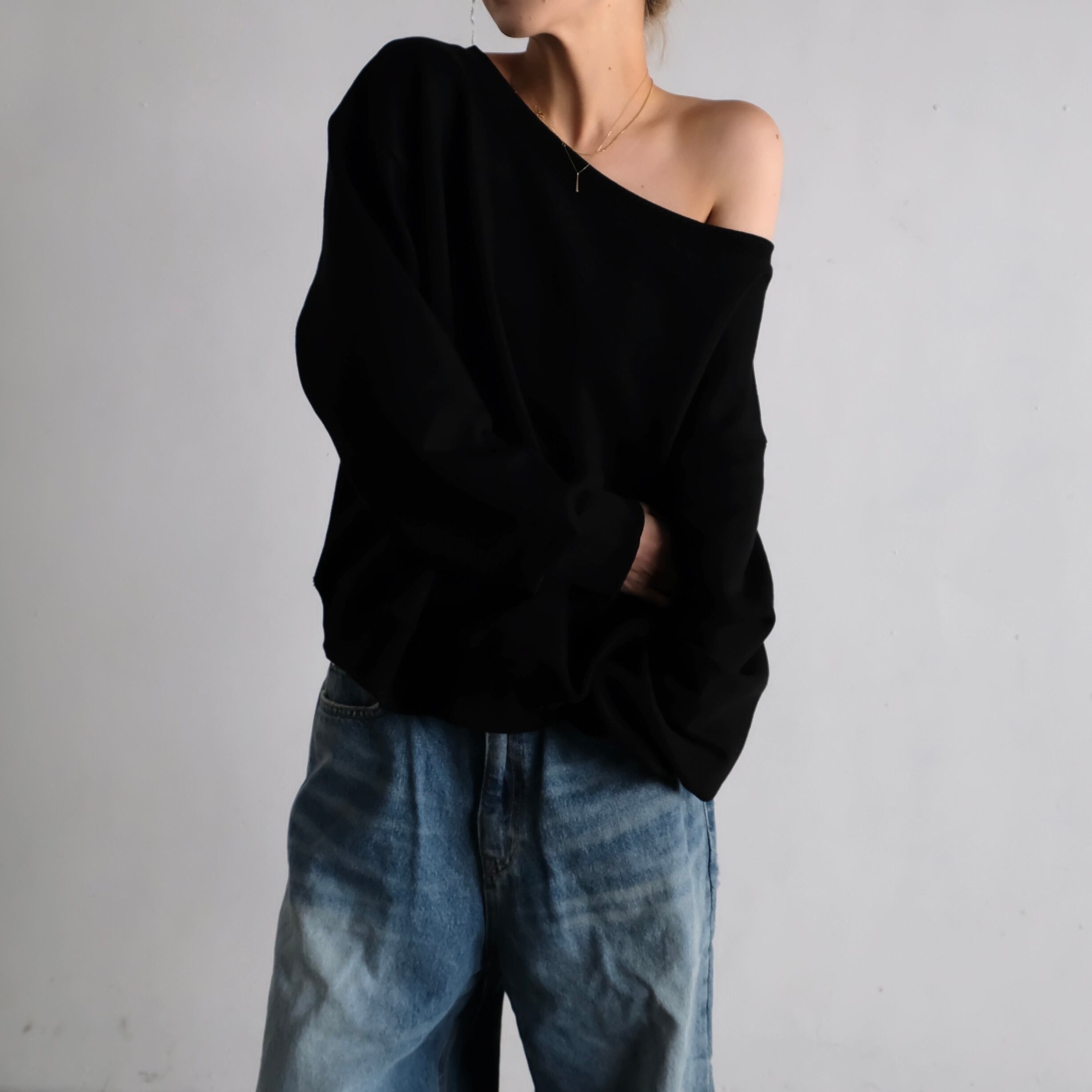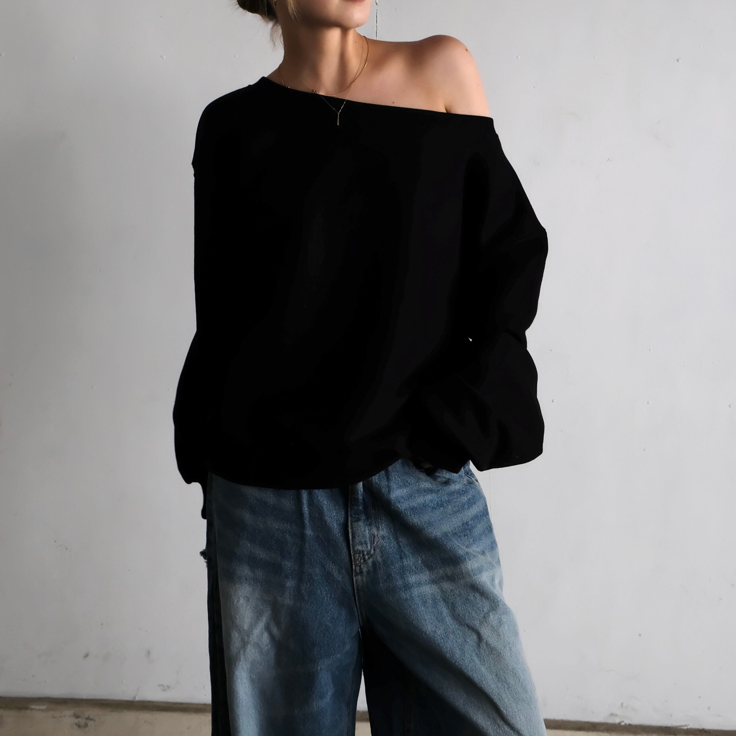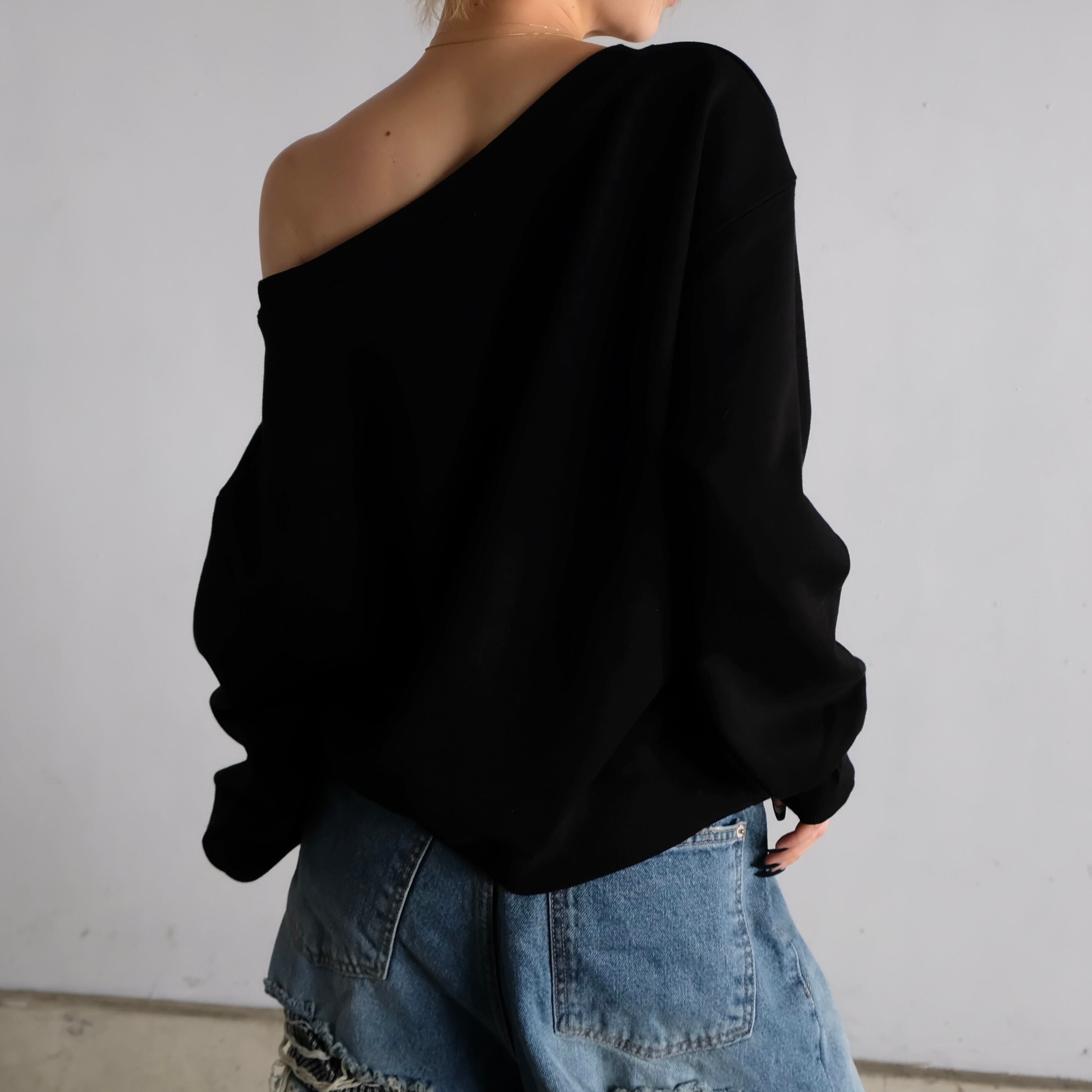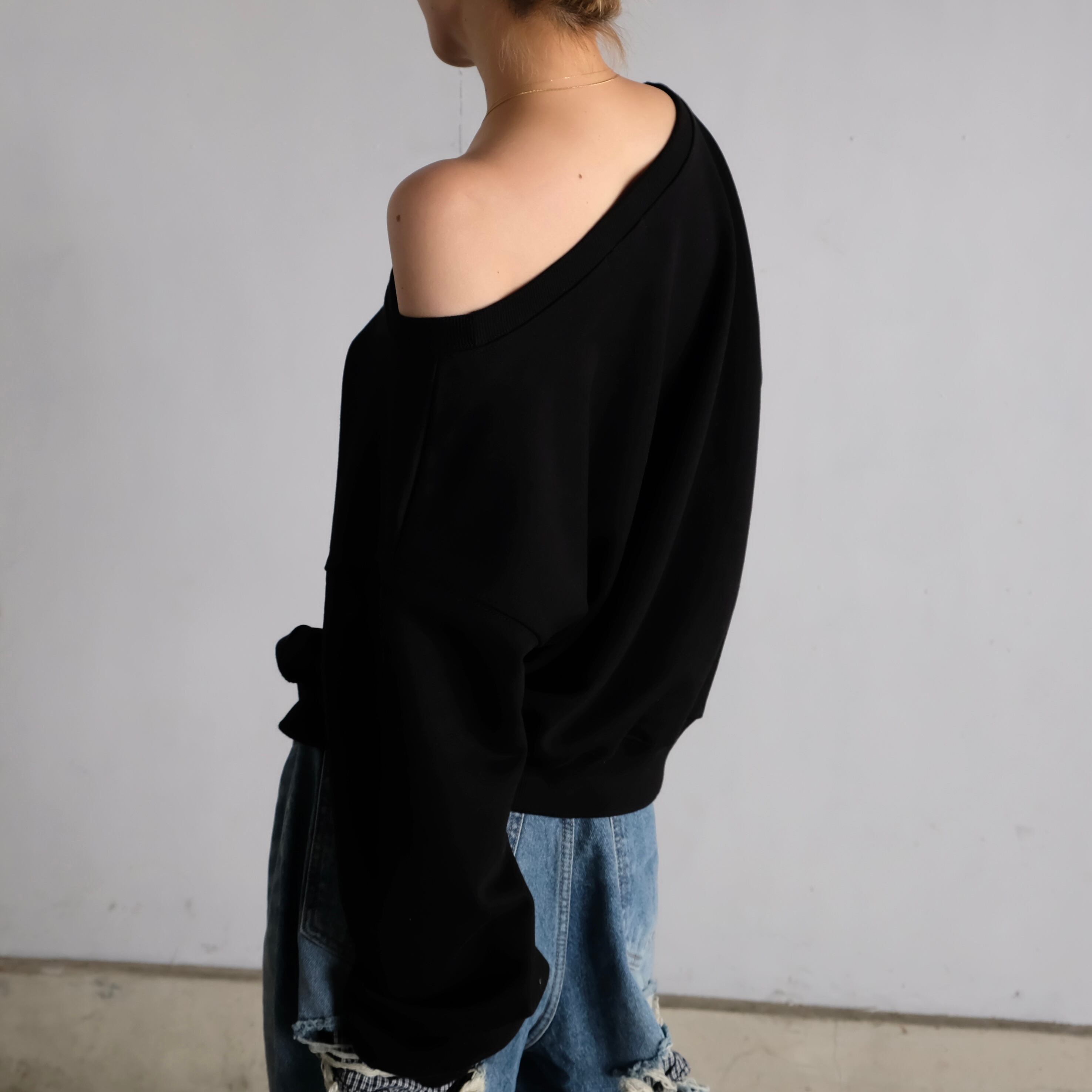 肩線を広めにとったワイドネックで、片肩を軽く見せながらゆったり着られるオフショルダースウェット。