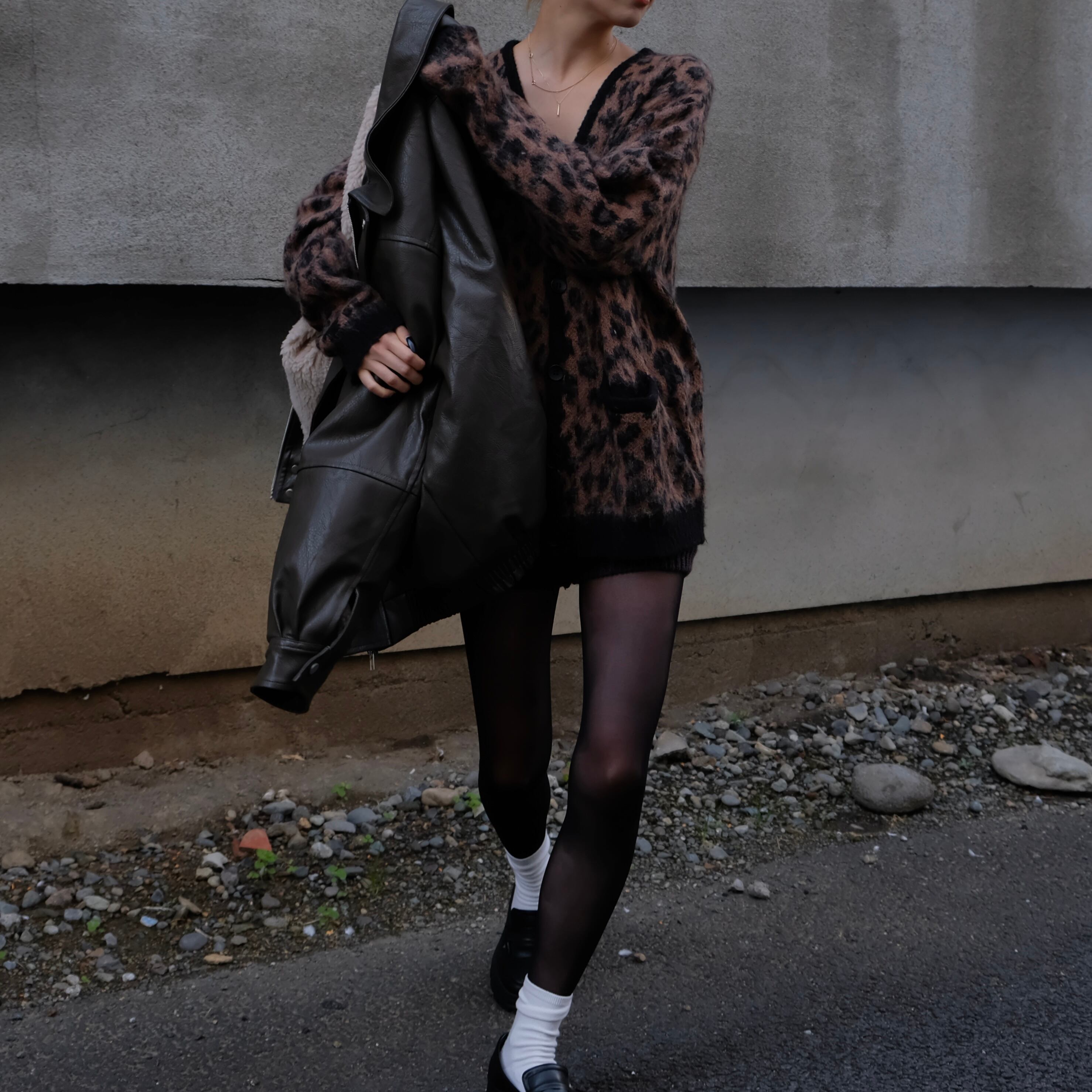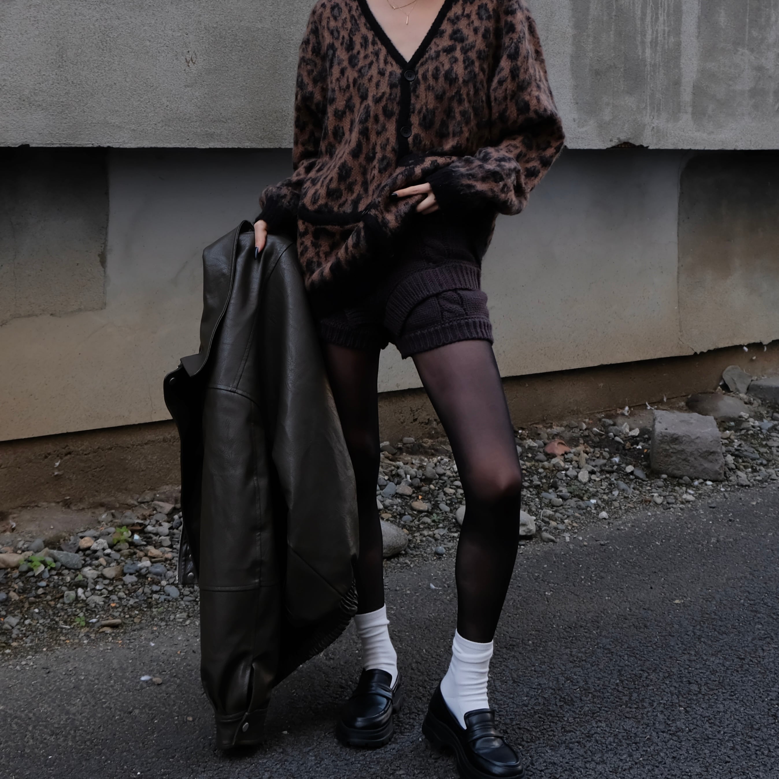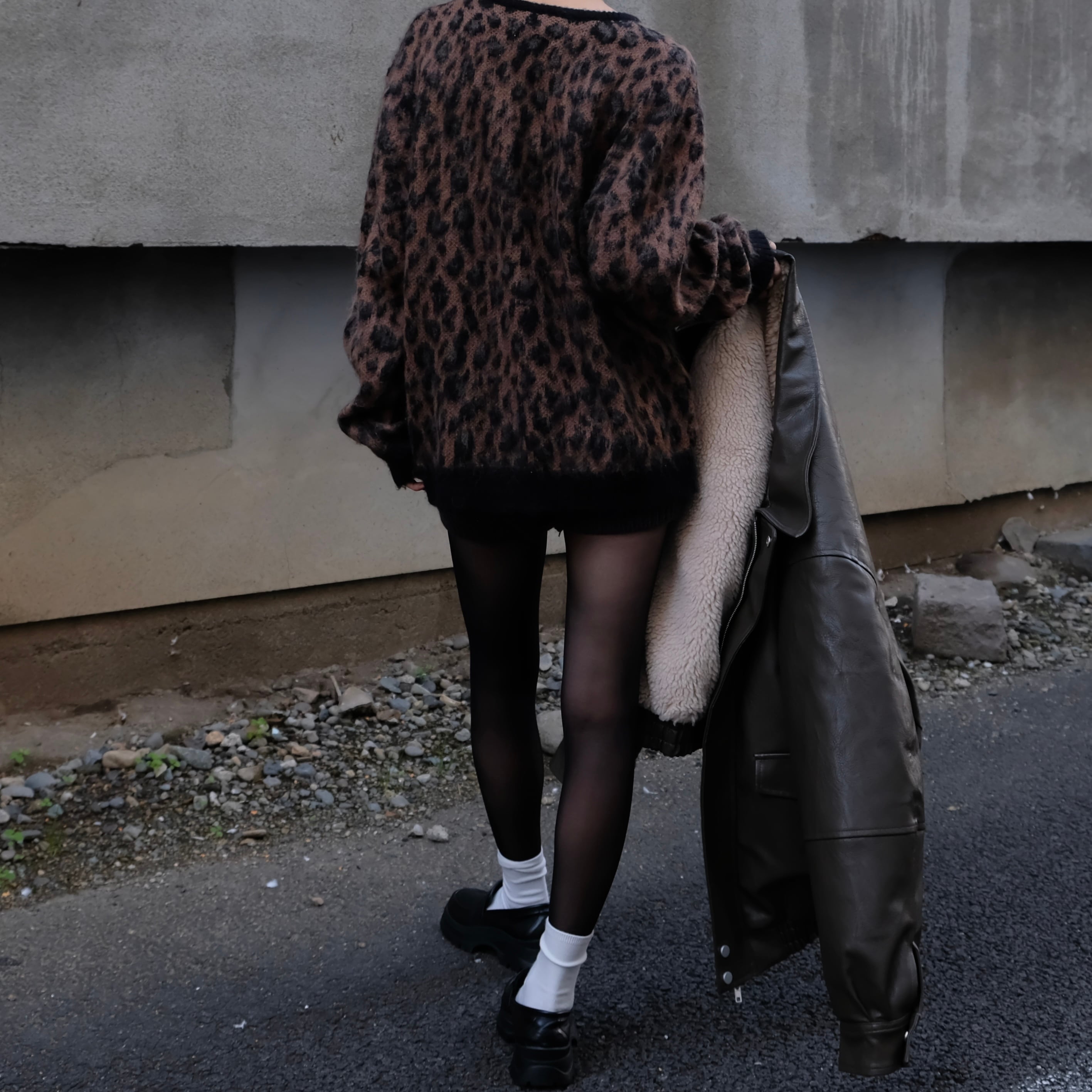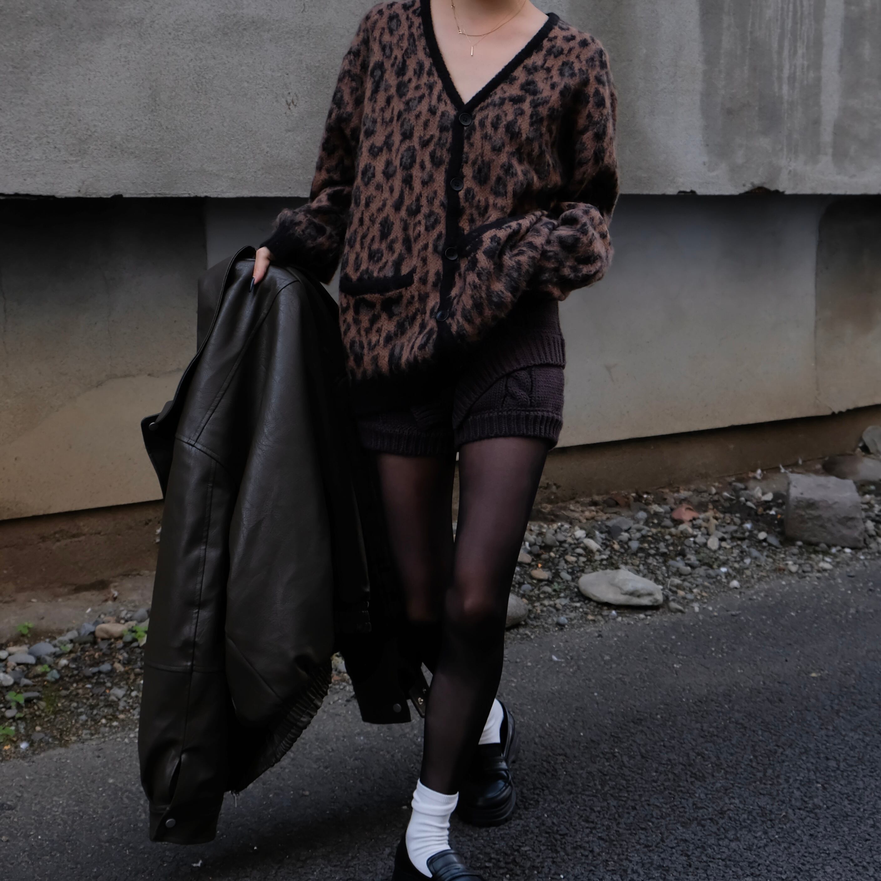 フロントからサイドへ流れる編み柄の切り替えとVラインが重なり、前後どちらから見ても立体的なバランスに仕上がっています。