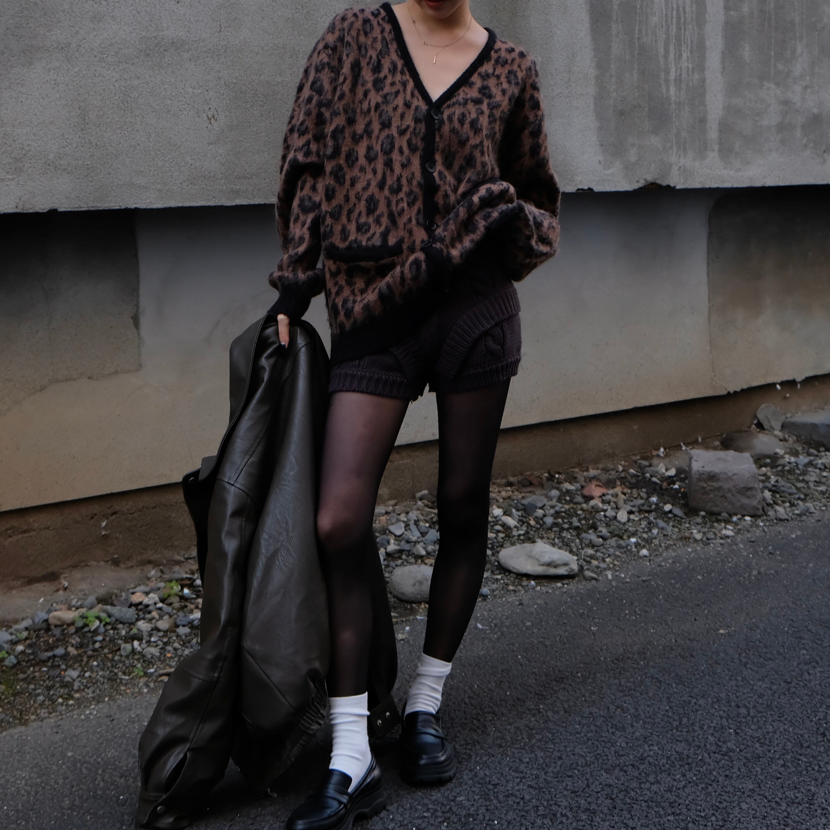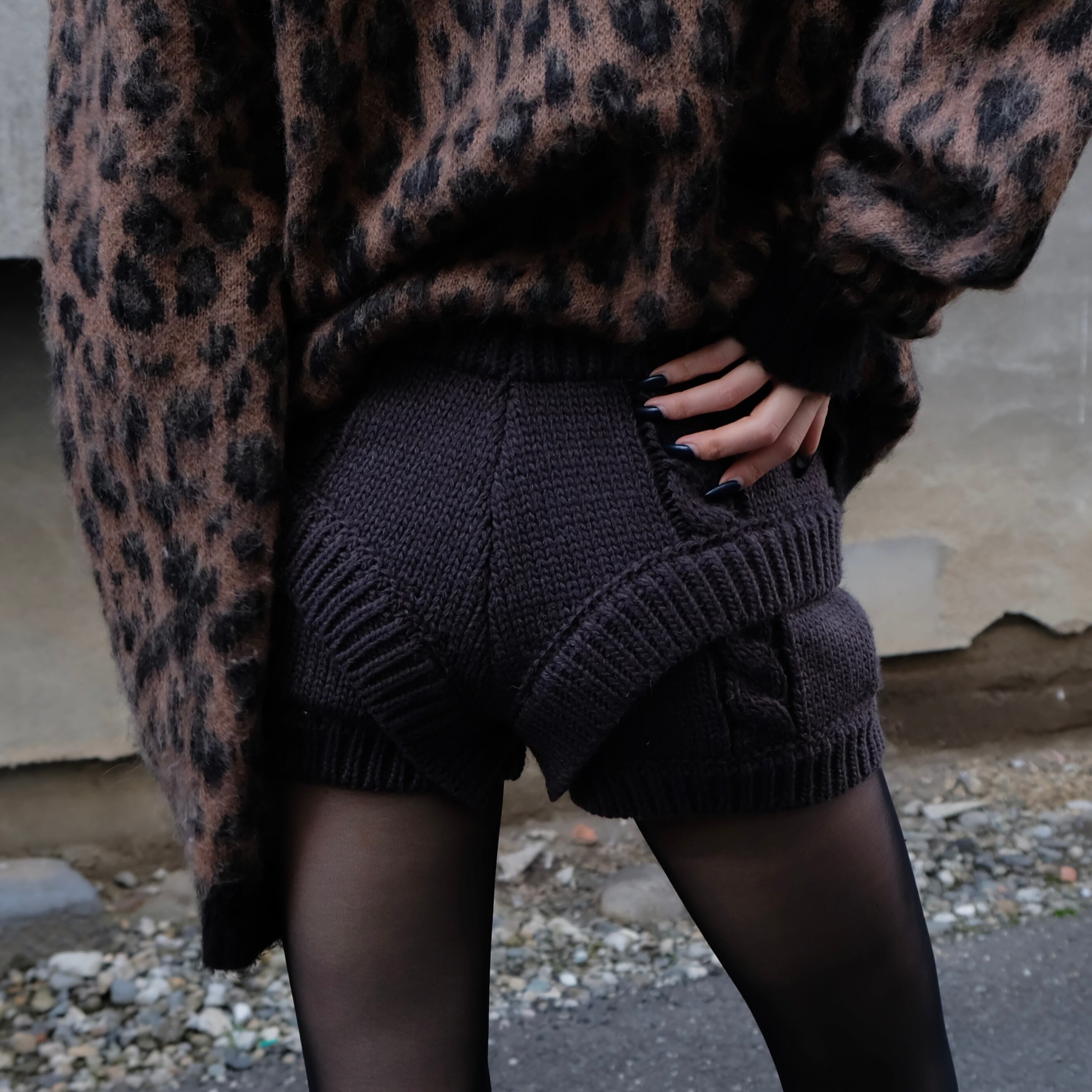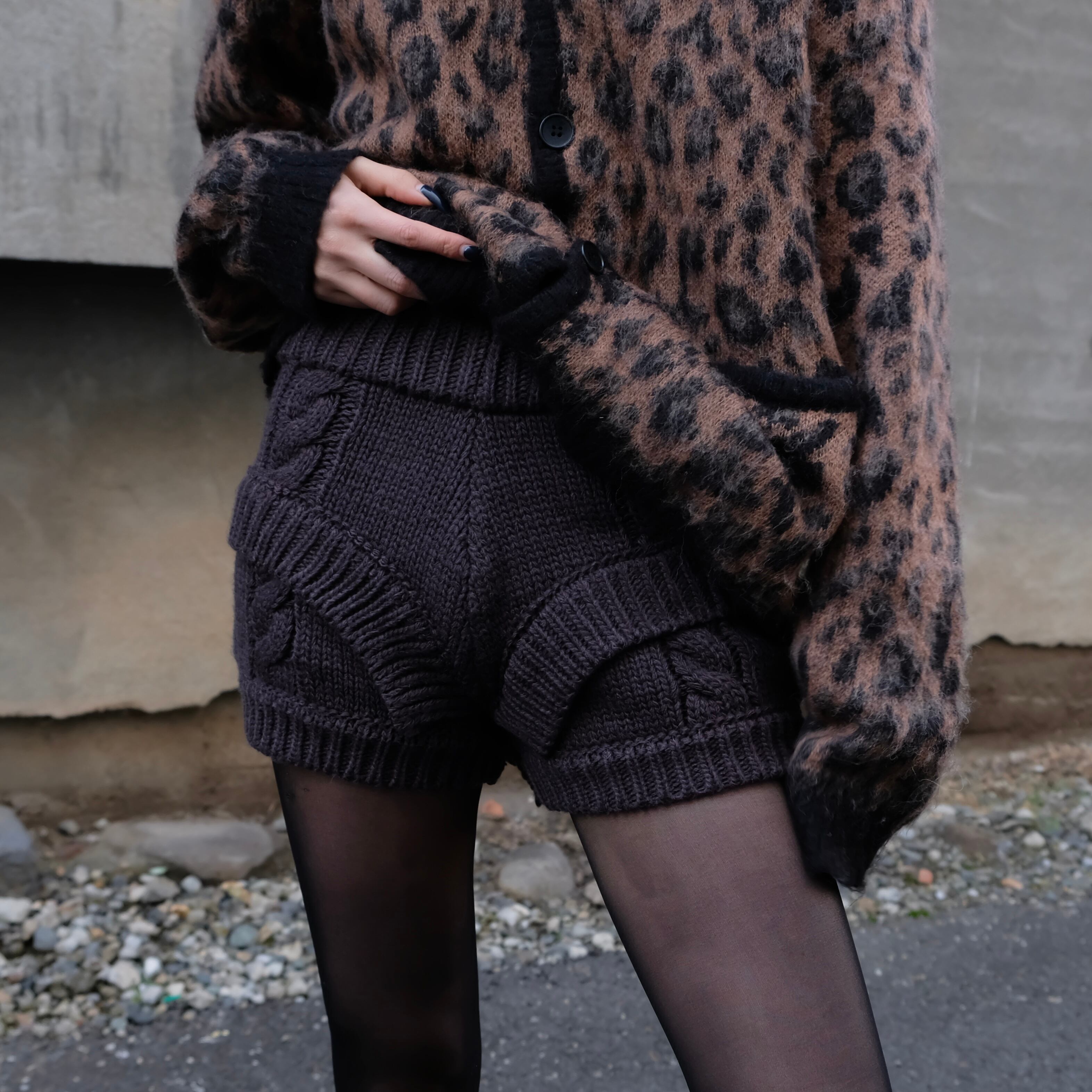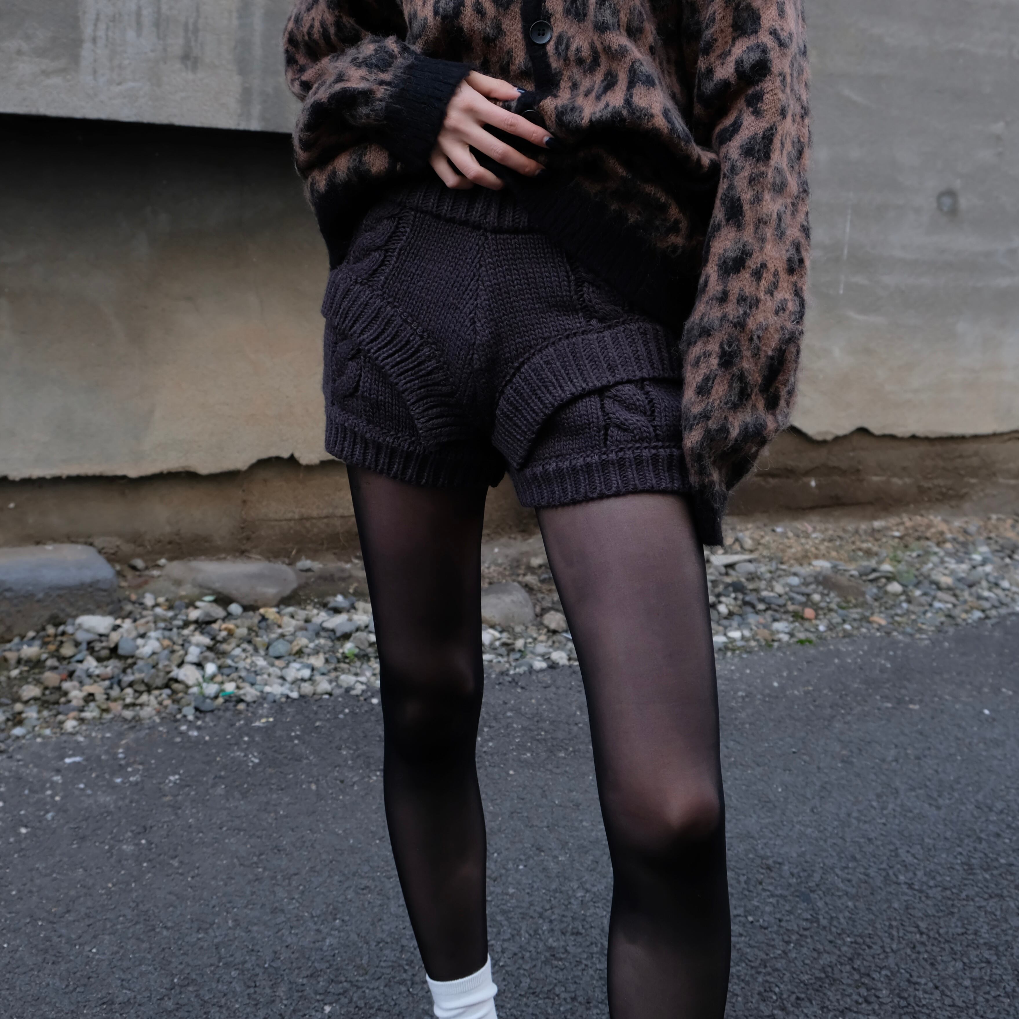 立体感のあるケーブル編みと、フロントに入ったレイヤード風のVラインが特徴のニットショートパンツ。