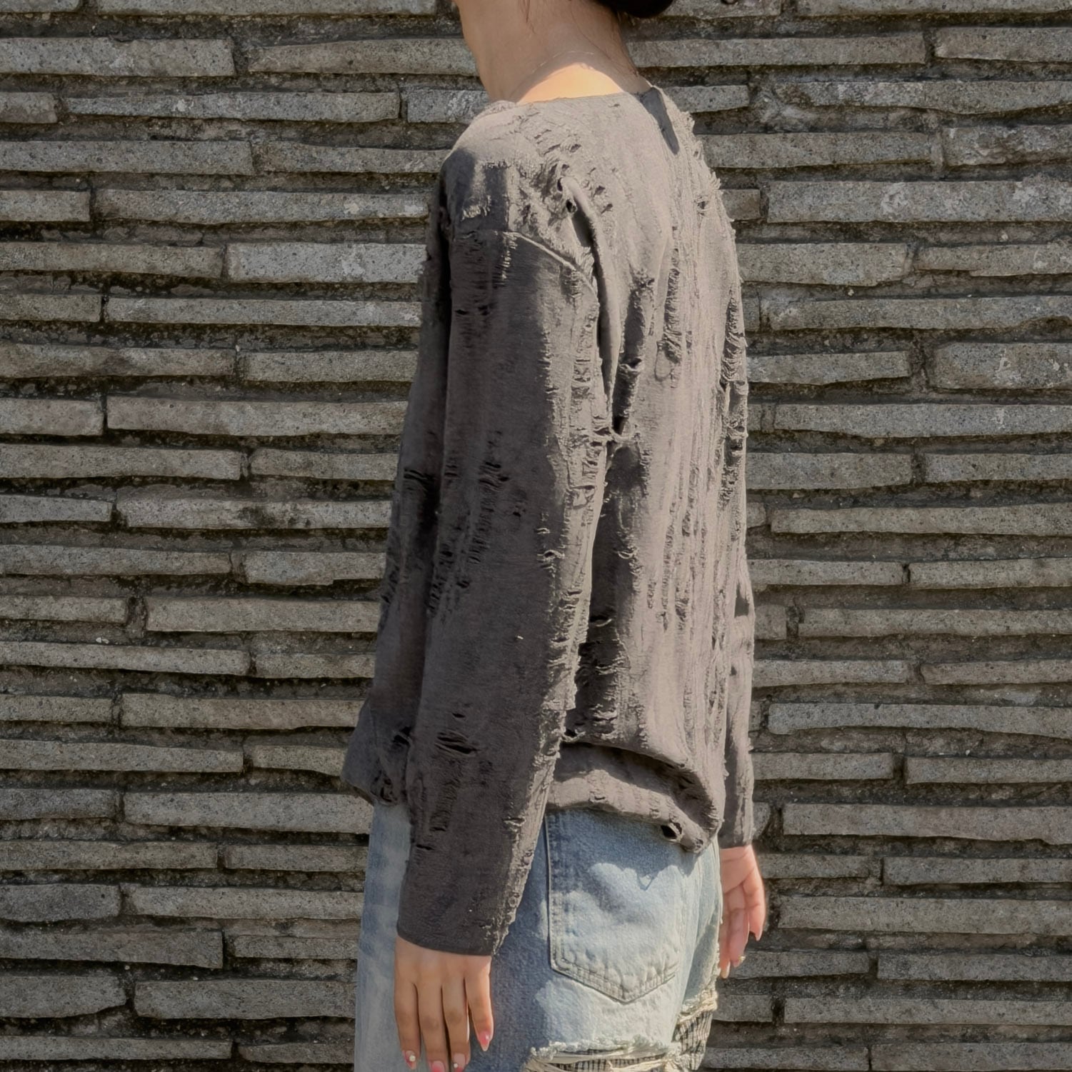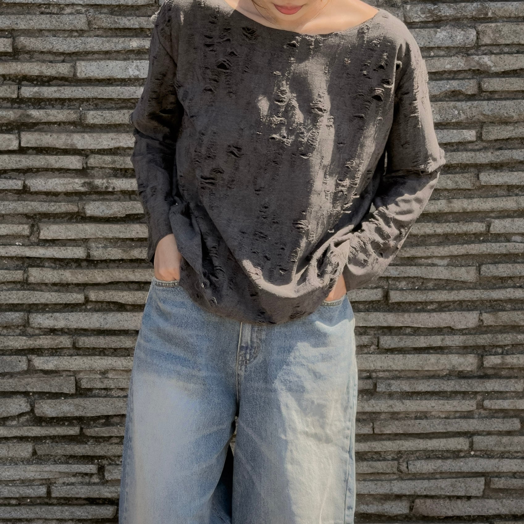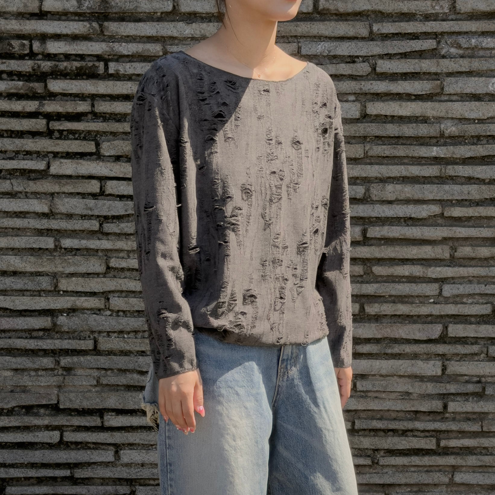 全面に入ったクラッシュ加工が、薄手の編地に映える一着。