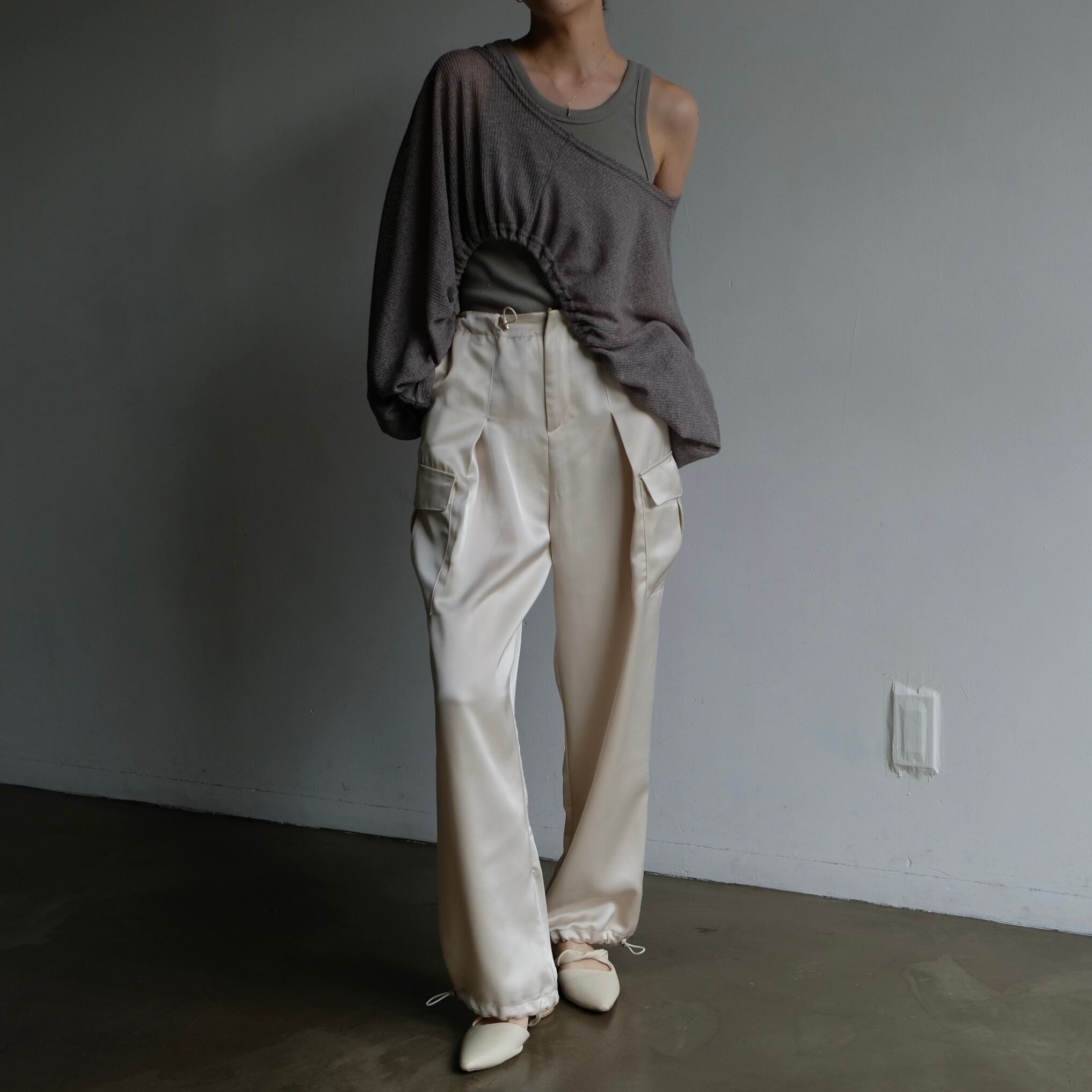 裾から袖にかけて絞られた一癖あるデザインと落ち着いたカラーで着回しもしやすく、スタイリングのアレンジにも◎
