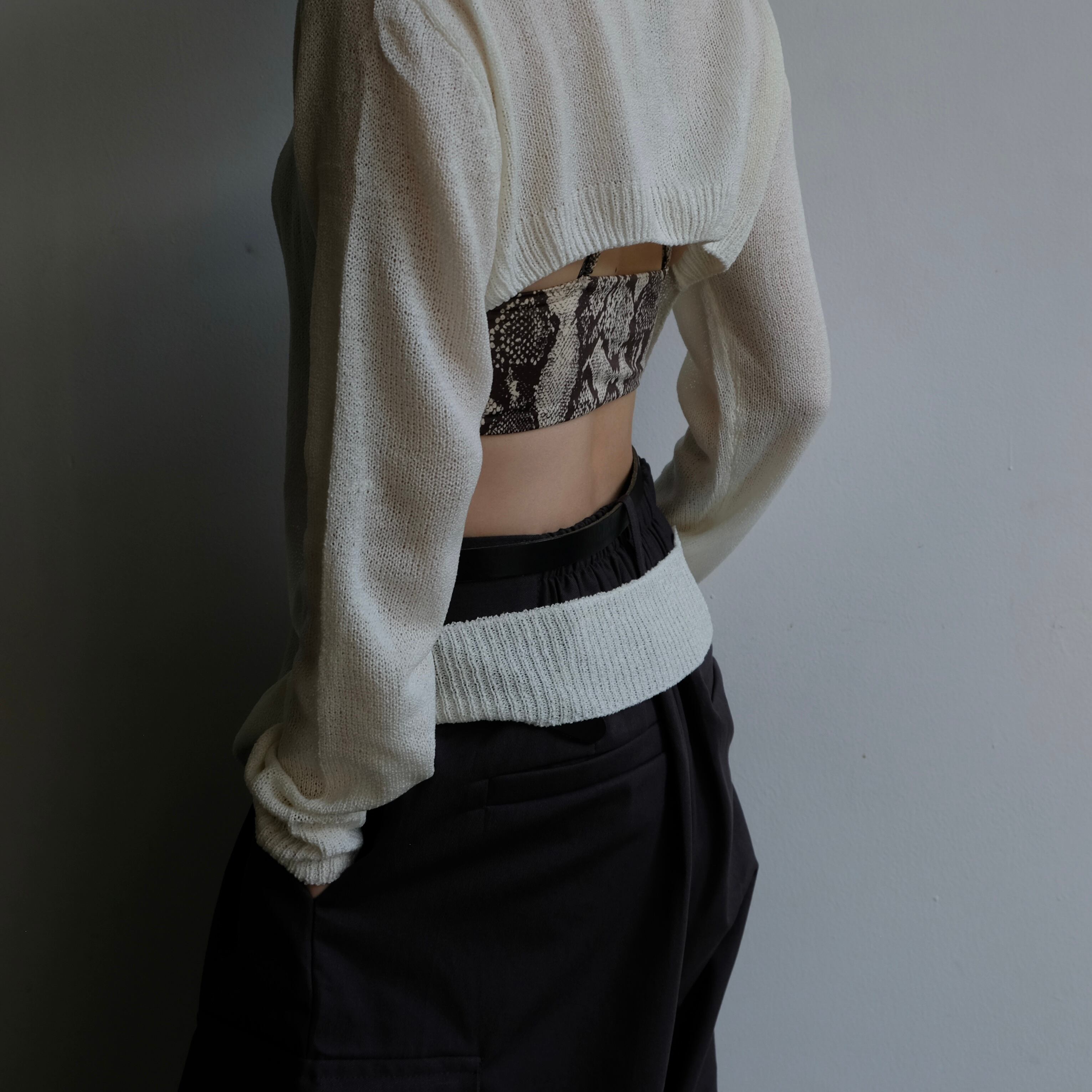 背中は大胆に開いたオープンスタイルで、ビスチェや水着等を合わせるのがおすすめです。