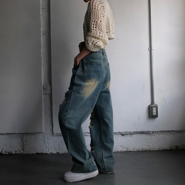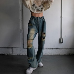 左右で異なる位置にダメージが入っておりインパクトはありますが、柔らかいコットン100%のデニム素材なので履き心地も抜群です。