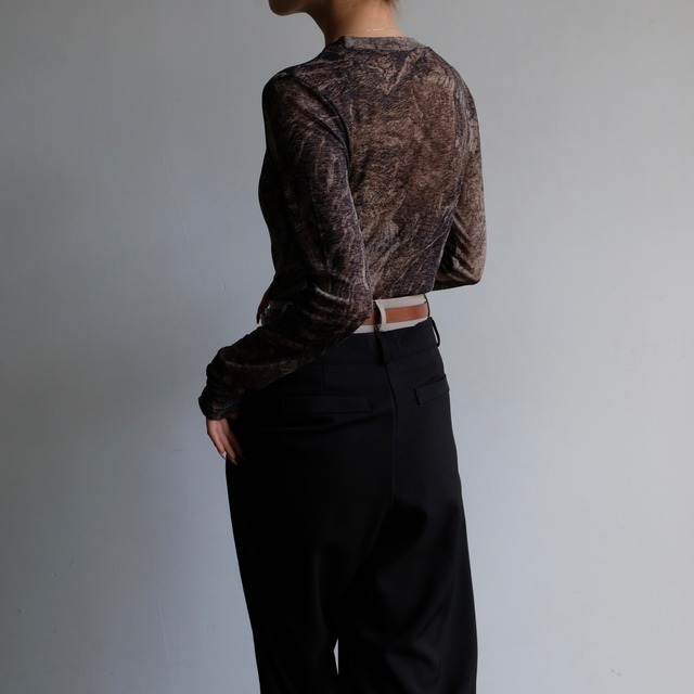 また暗めのカラーで柄感も強い為、透けすぎず上品に着用いただけるのもポイント。
