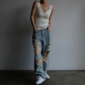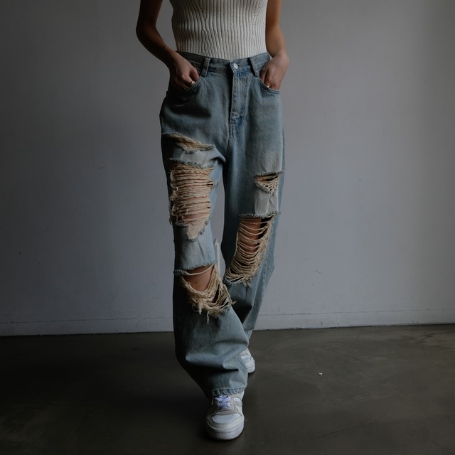上品で爽やかなアイスブルーとハードなダメージ加工が魅力的なストレートデニム。