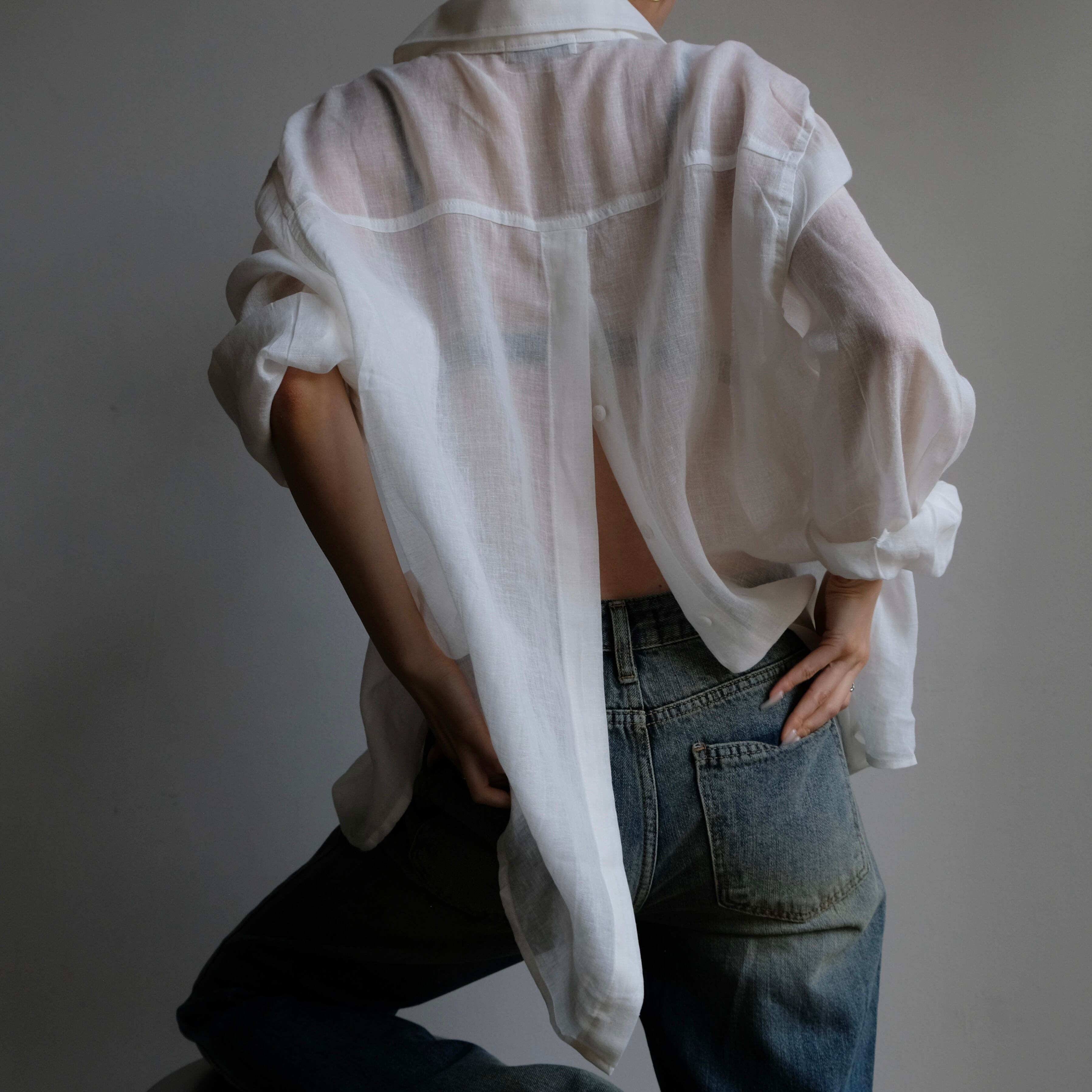 リネン素材を用いた透け感のある素材で、清涼感漂うバックスリットシャツ。