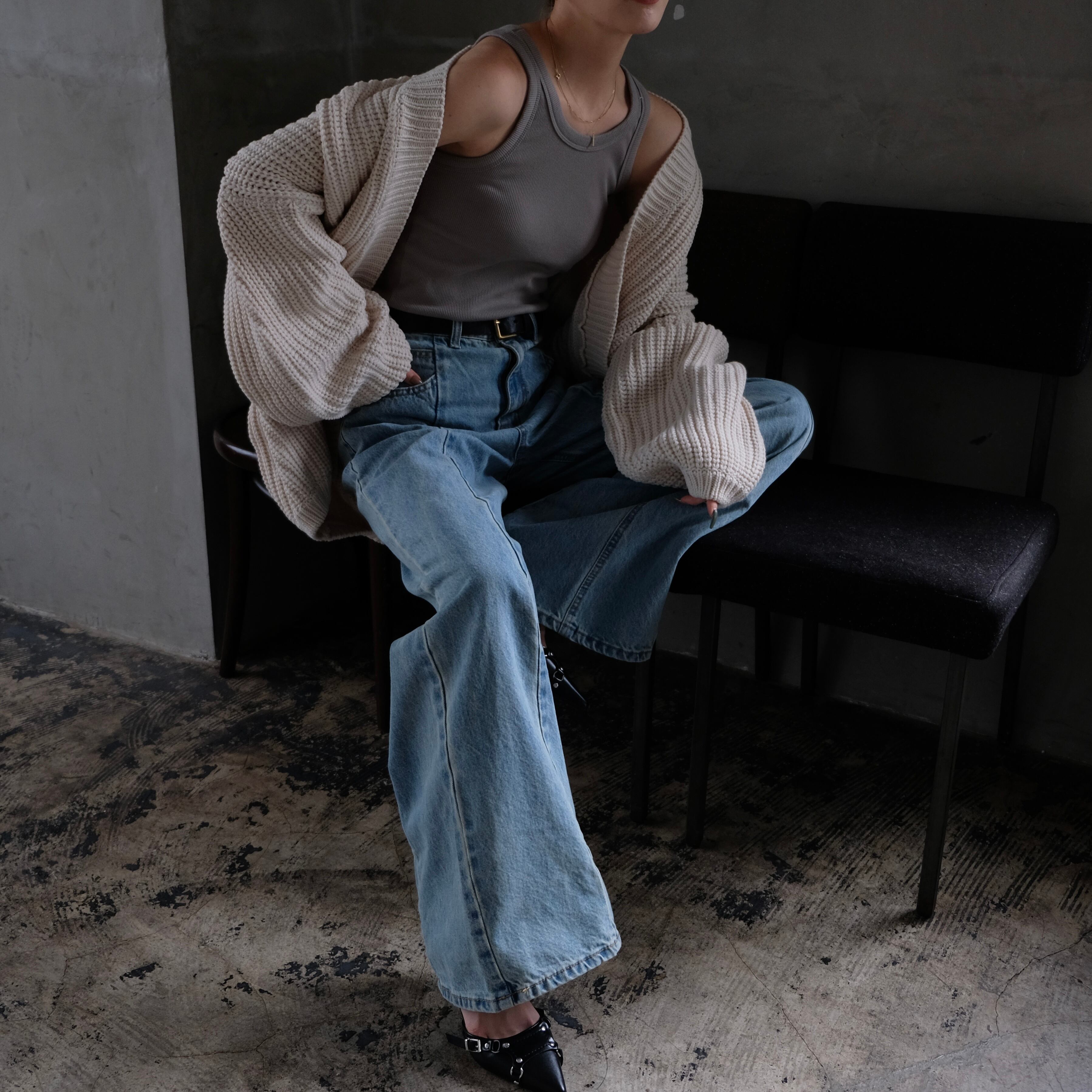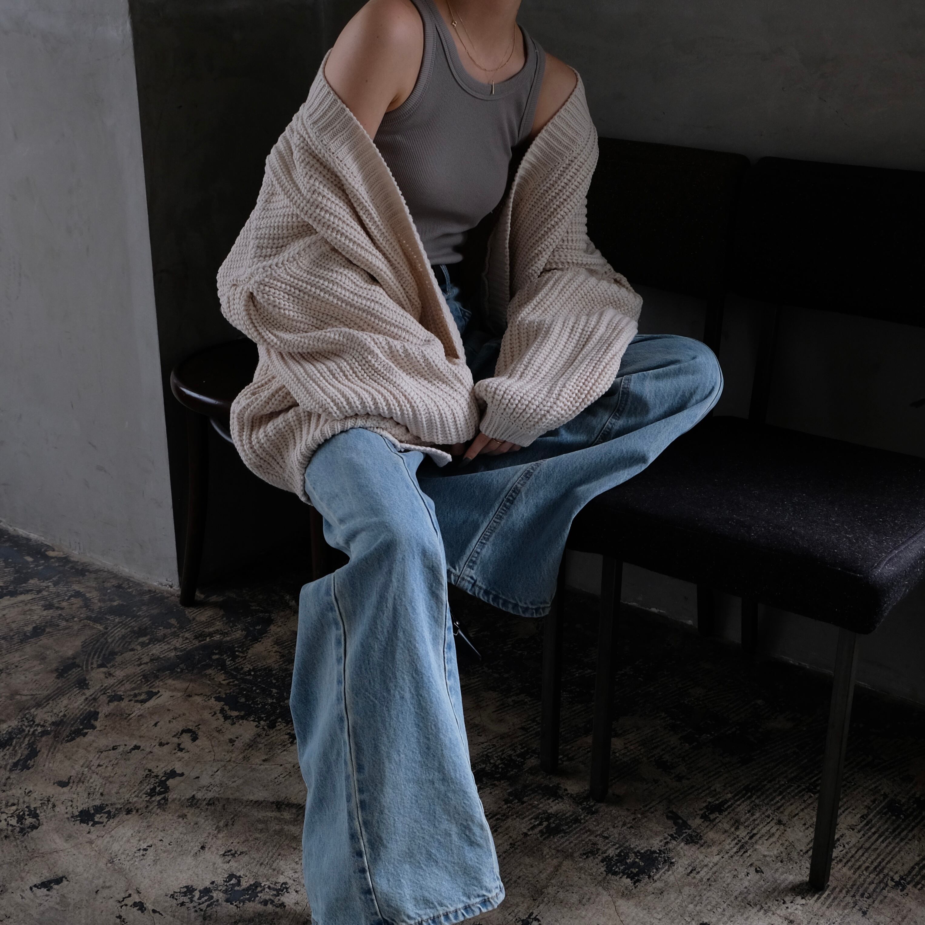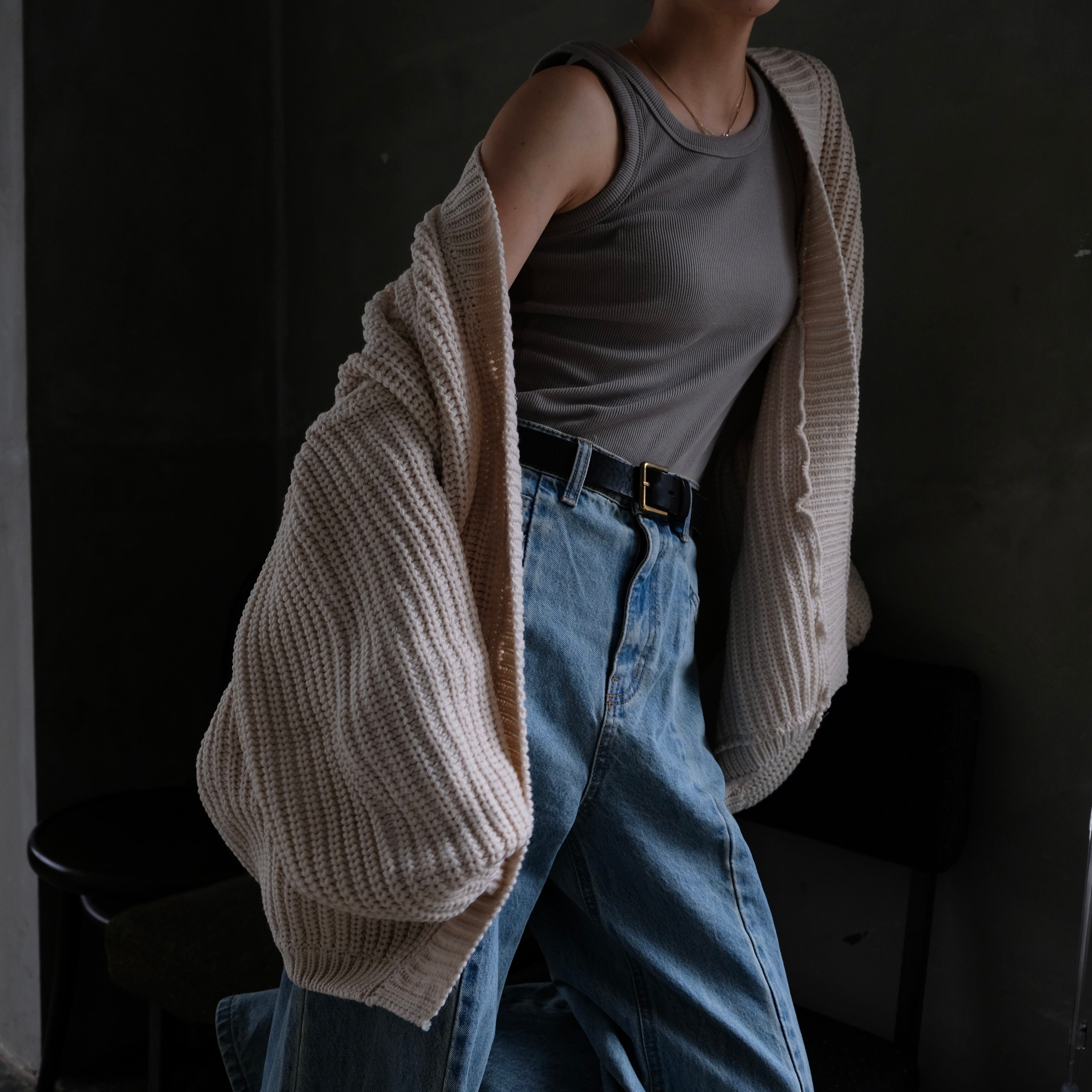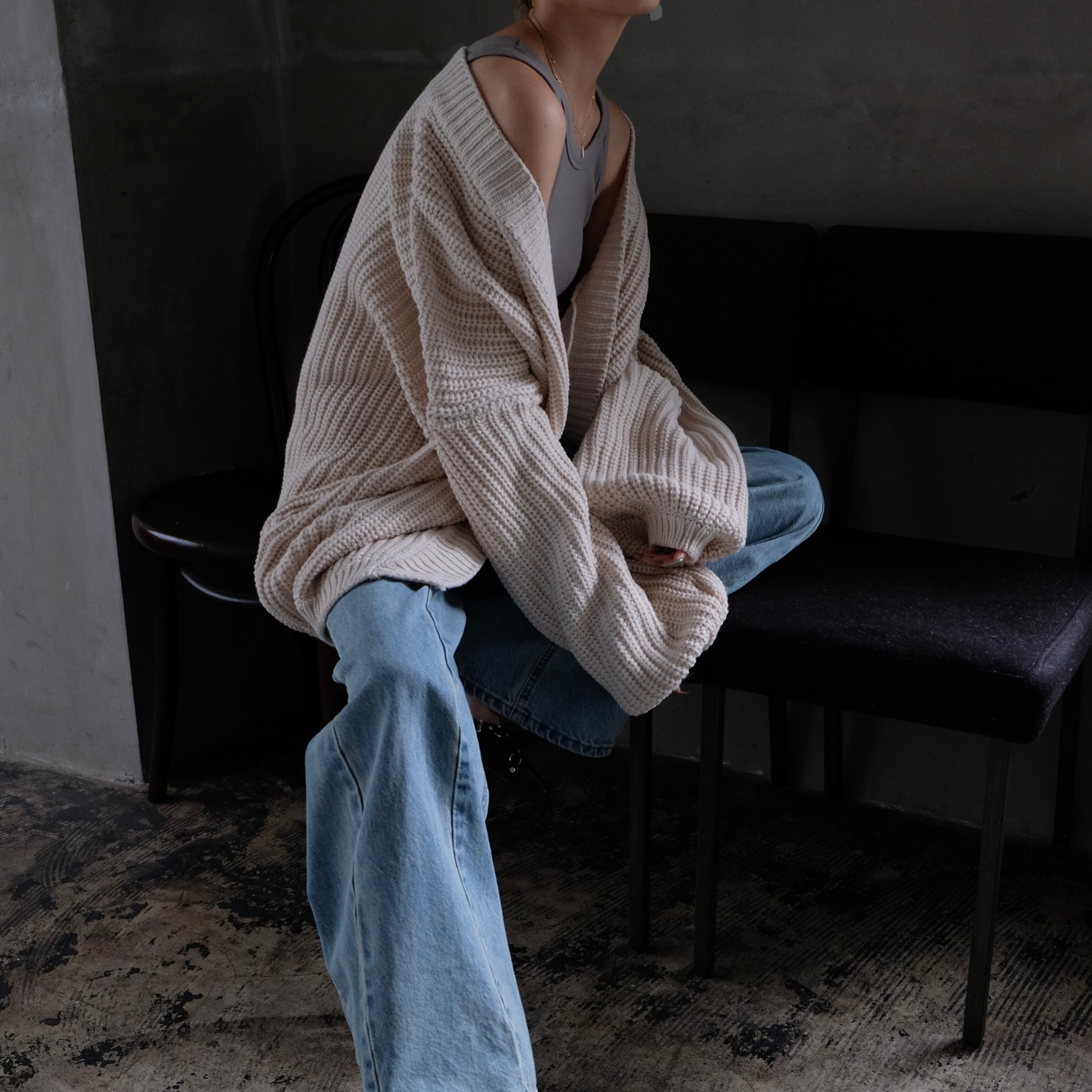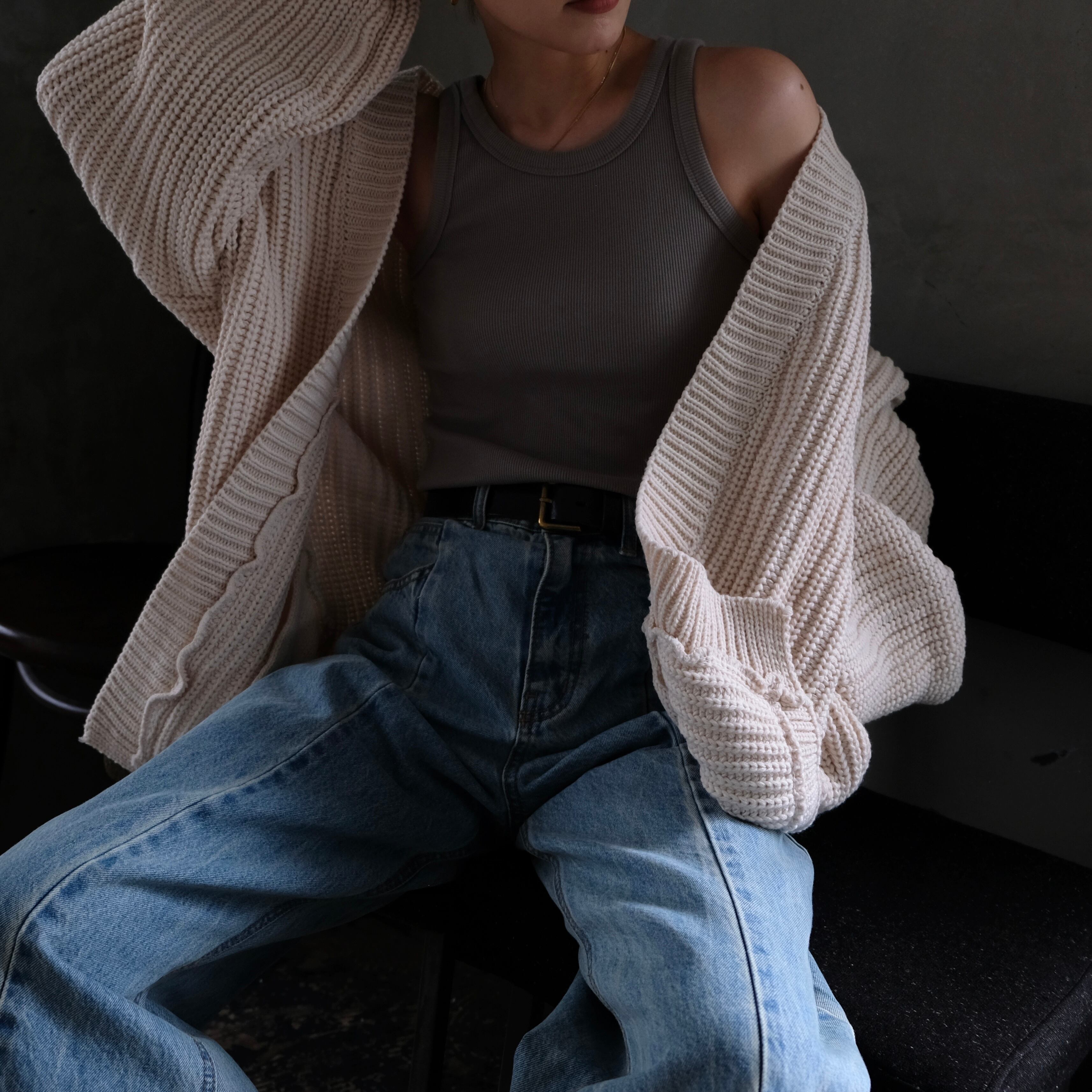 ニットでも着膨れをしないようにシャープに編み込まれており、前はオープンタイプなので羽織りのレイヤードもおすすめ。