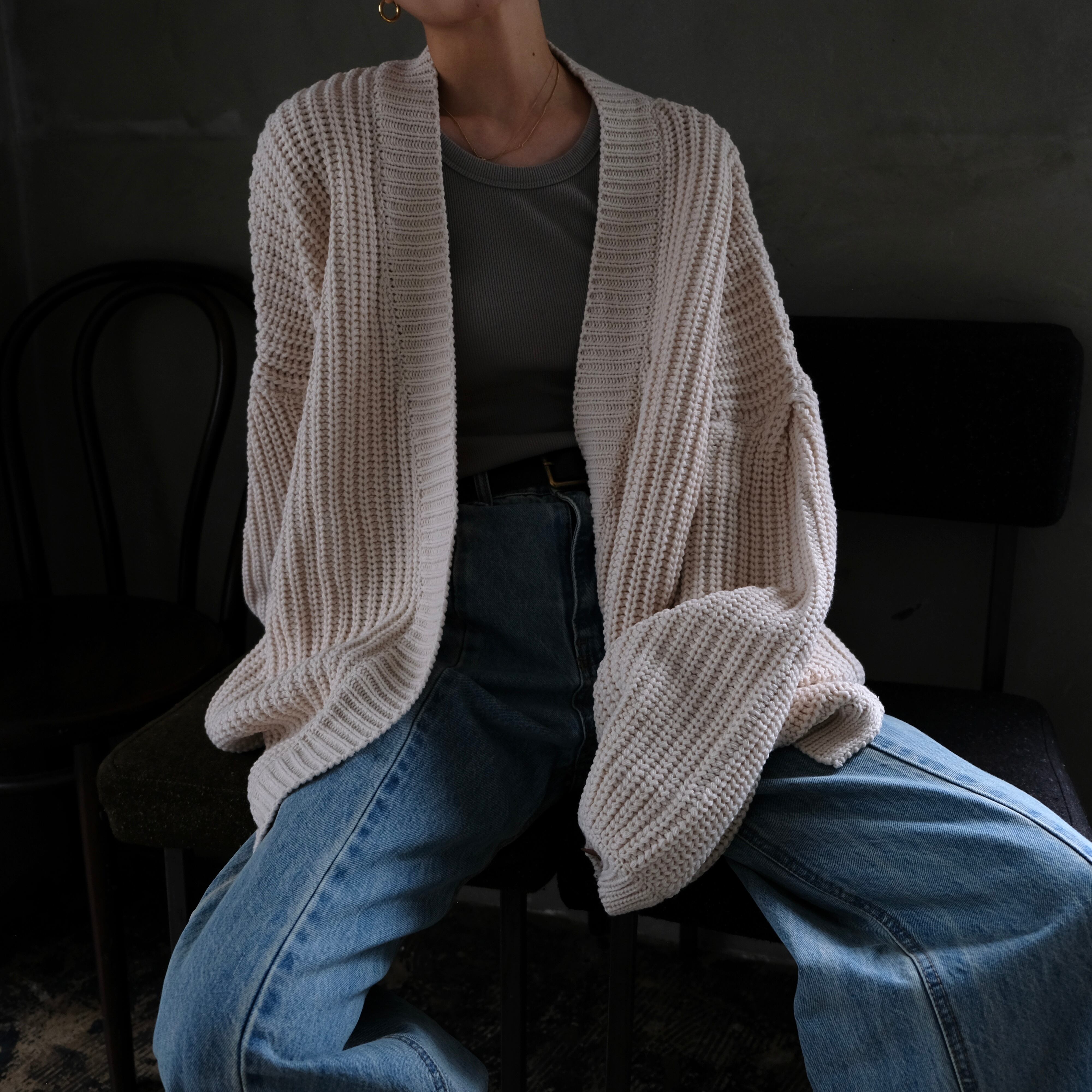 ふっくらとした太めの毛糸と丸みのあるシルエットで、女性らしさたっぷりのニットカーディガン。