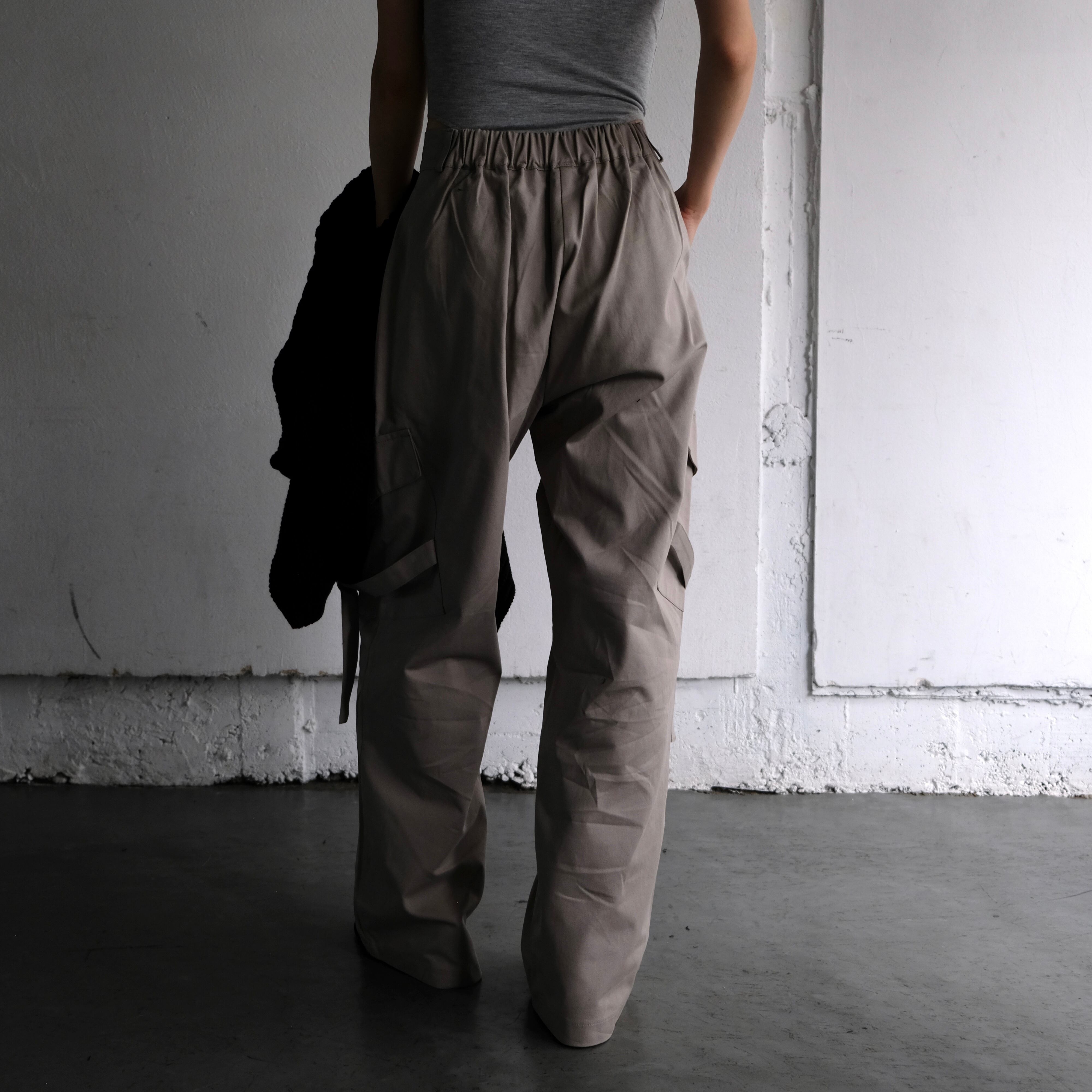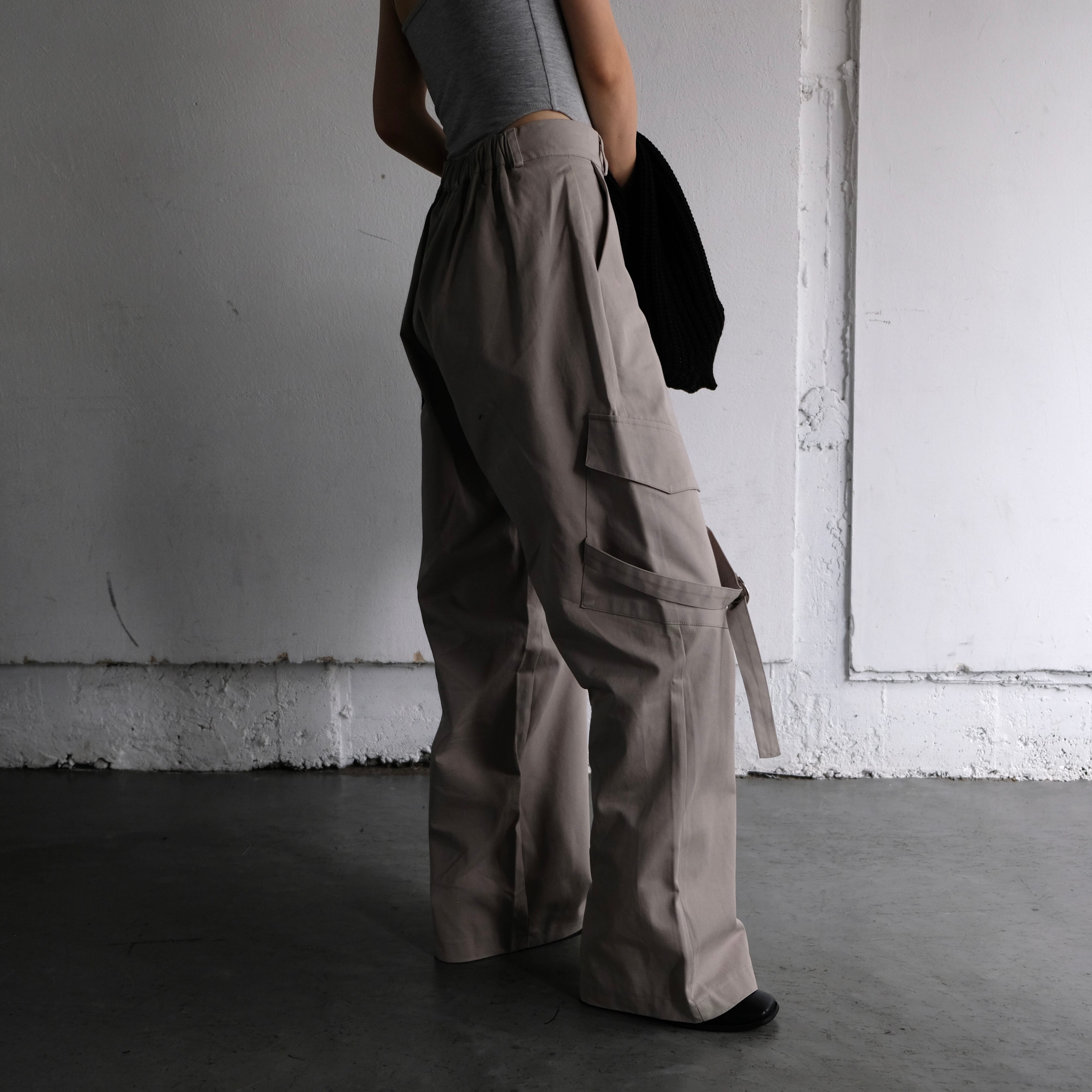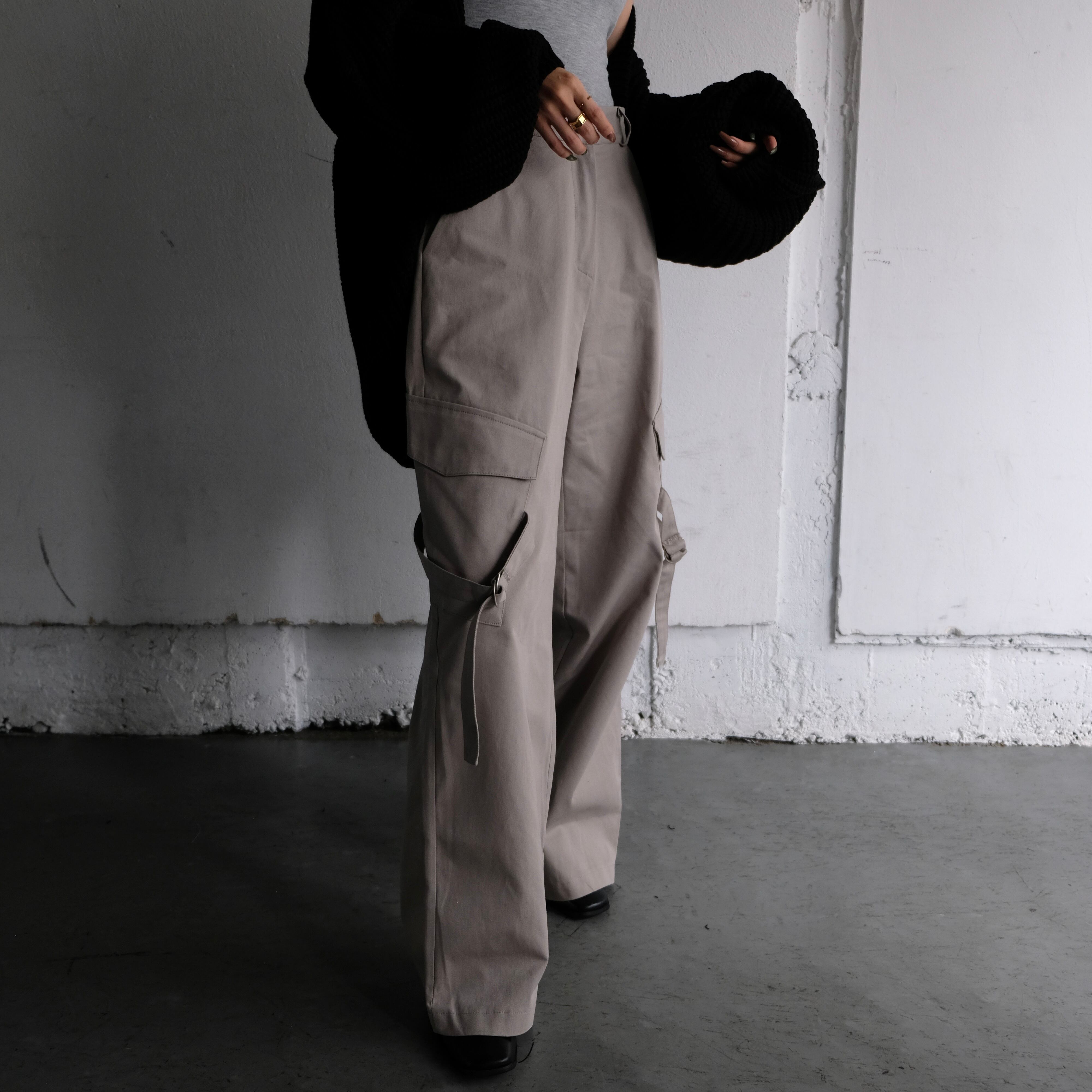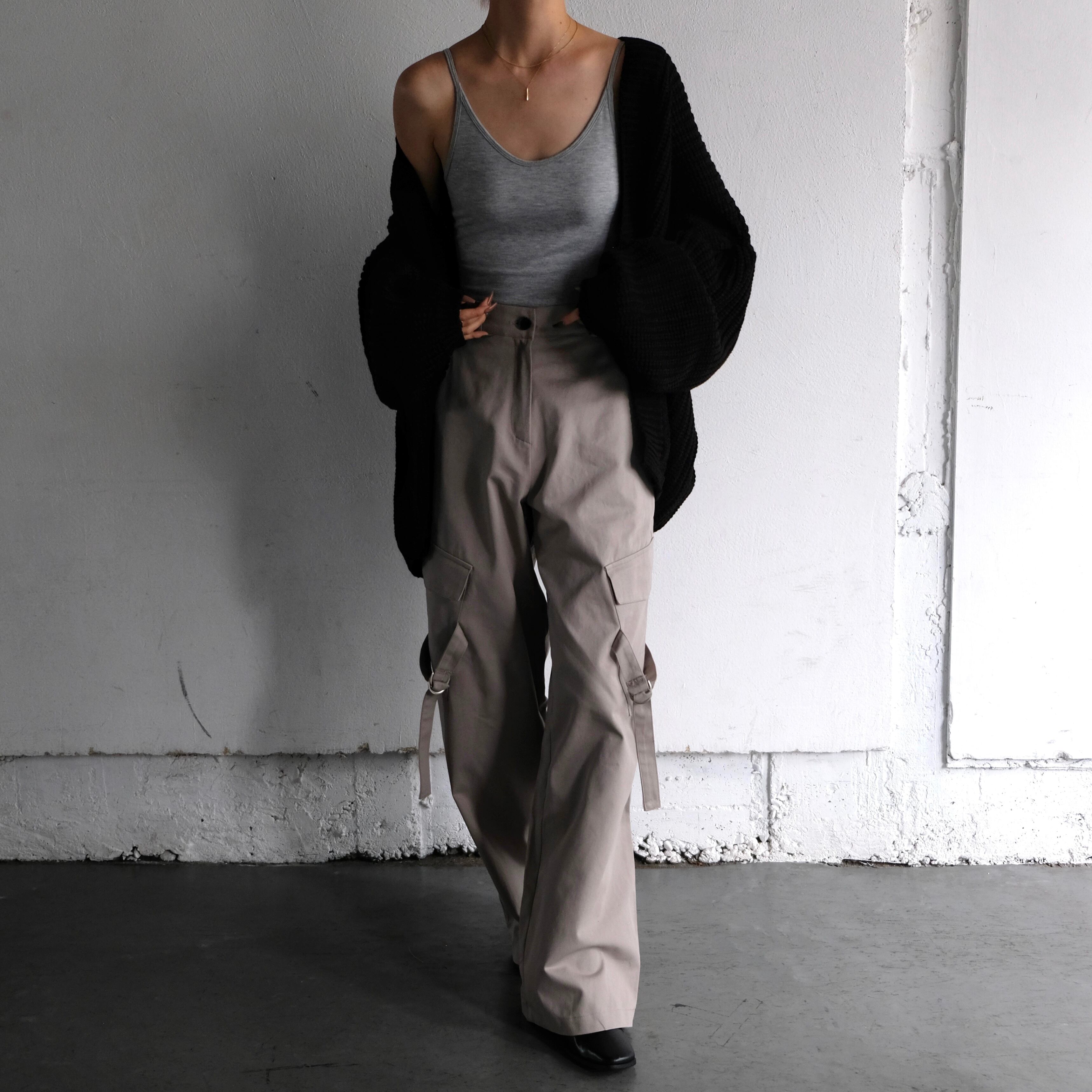 しっかり締めるとベルボトムのようなシルエットになり綺麗めな印象に、垂らすように緩く締めるとワイドシルエットでカジュアルストリートな雰囲気に仕上がります。