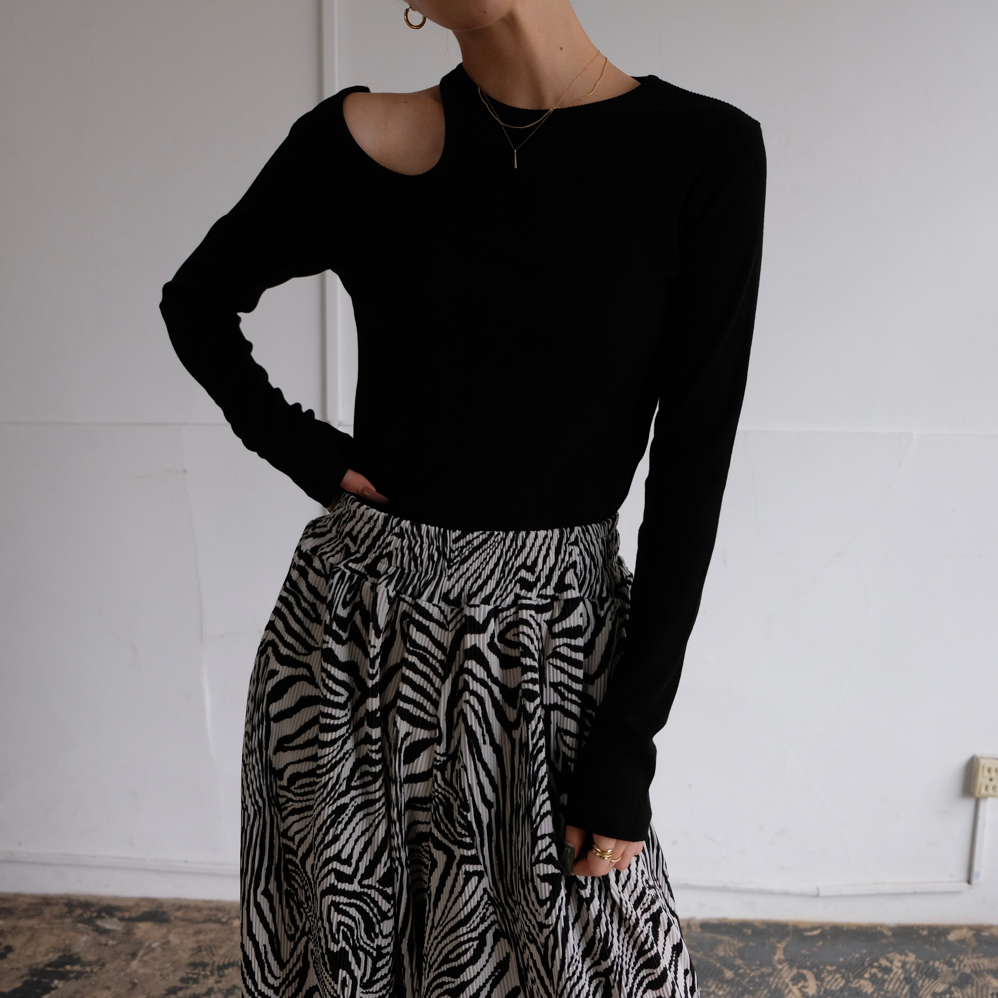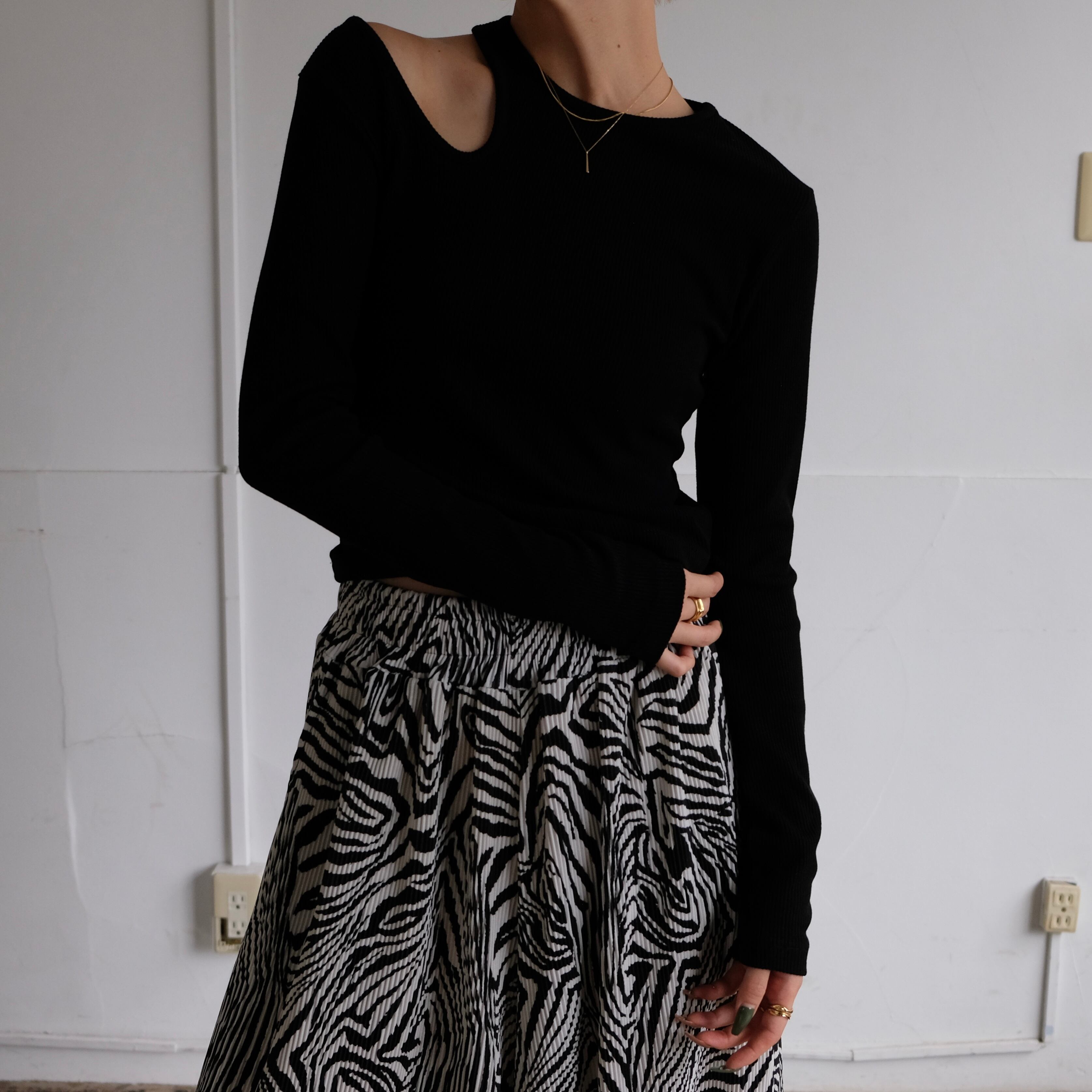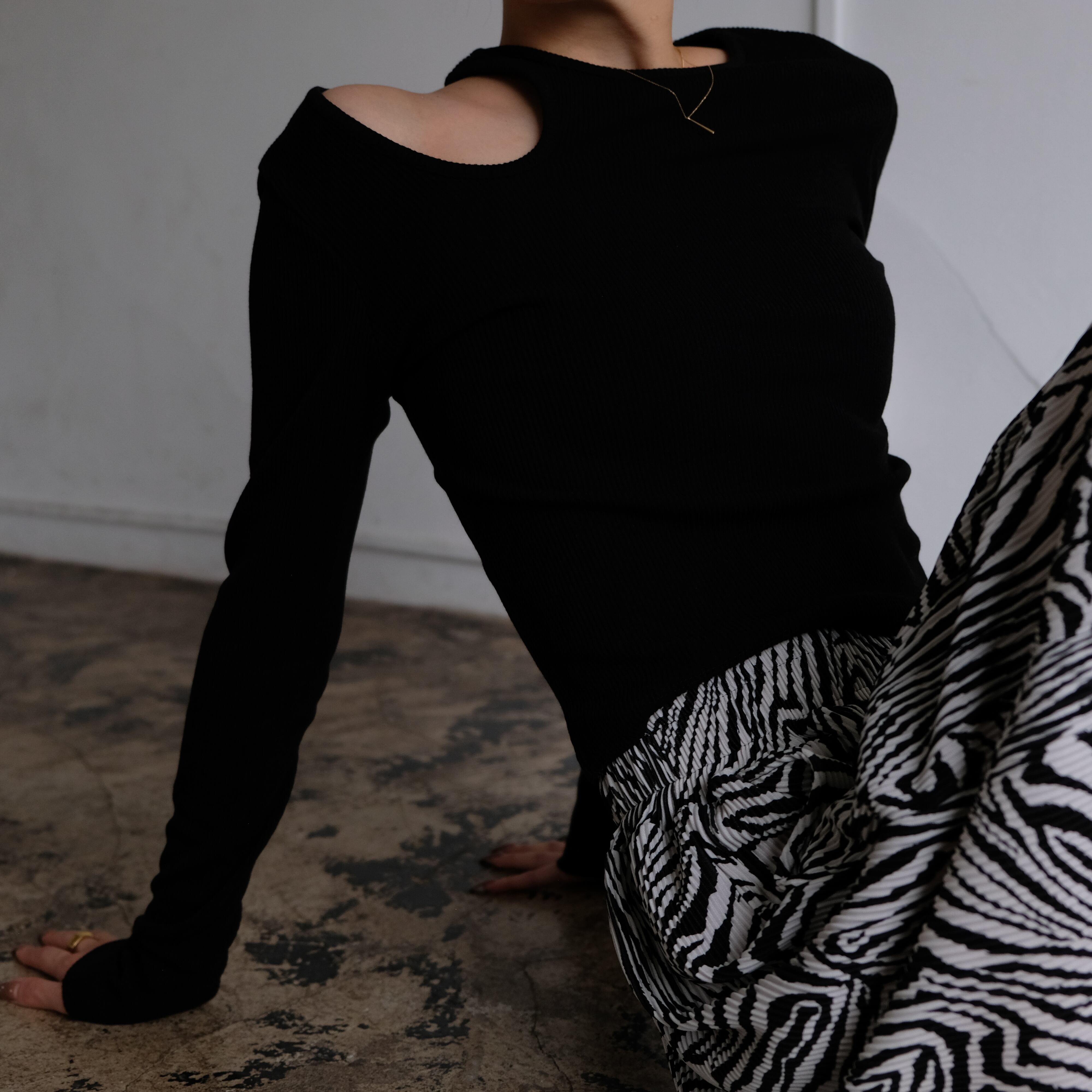 リブ素材で伸縮性たっぷりのデザイントップス。