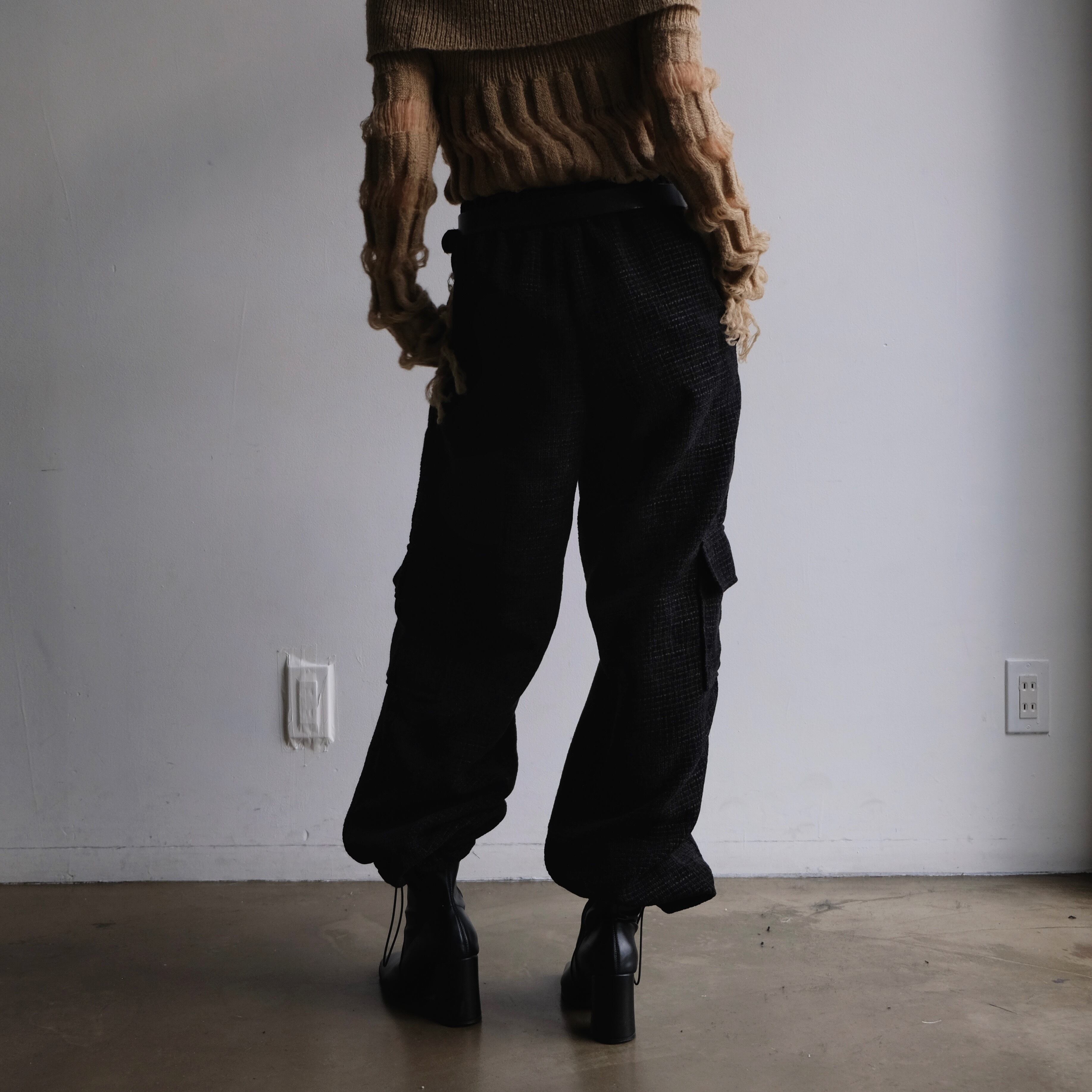裾はコードが通っているので絞ることができ、コーディネートに合わせてお使いいただける万能パンツです。