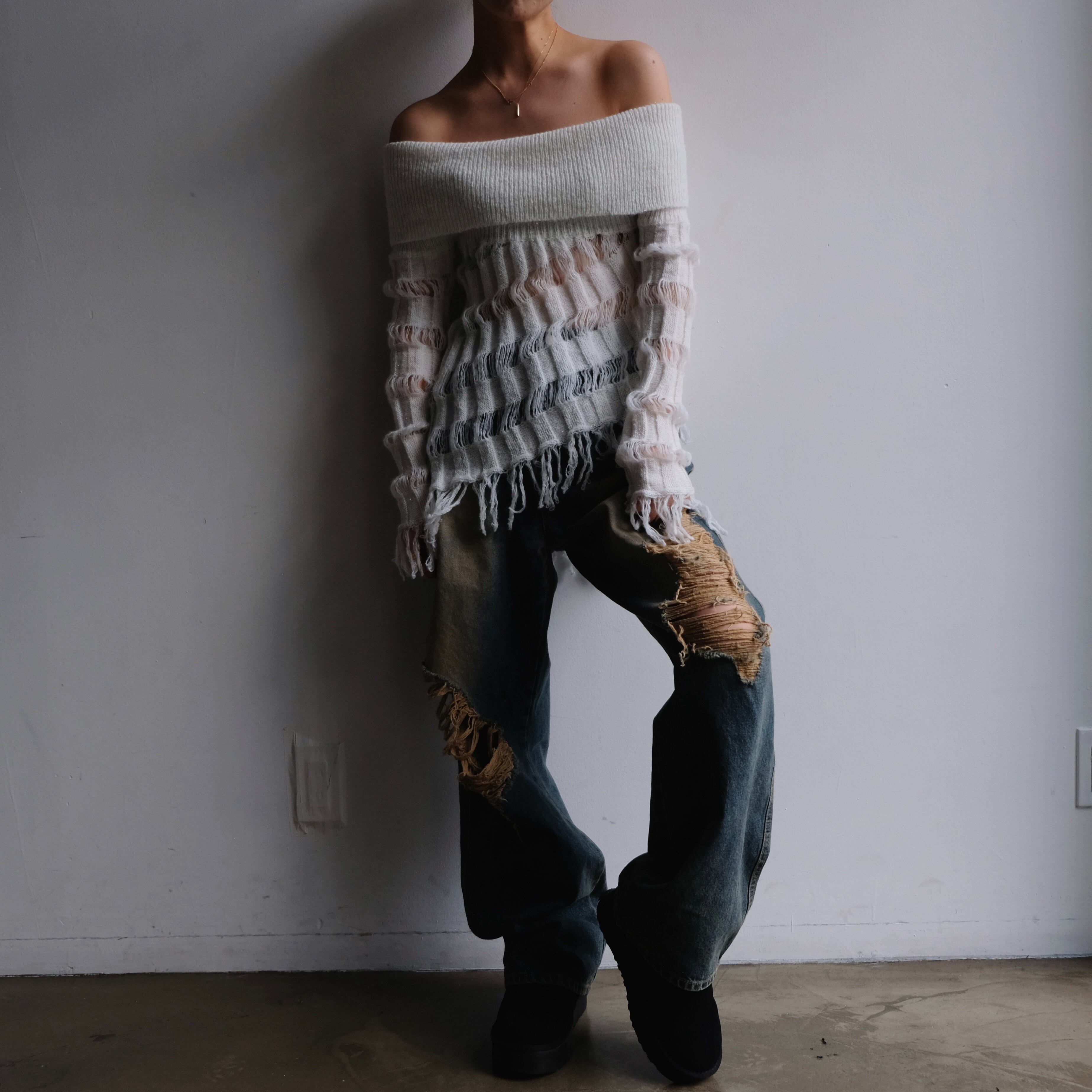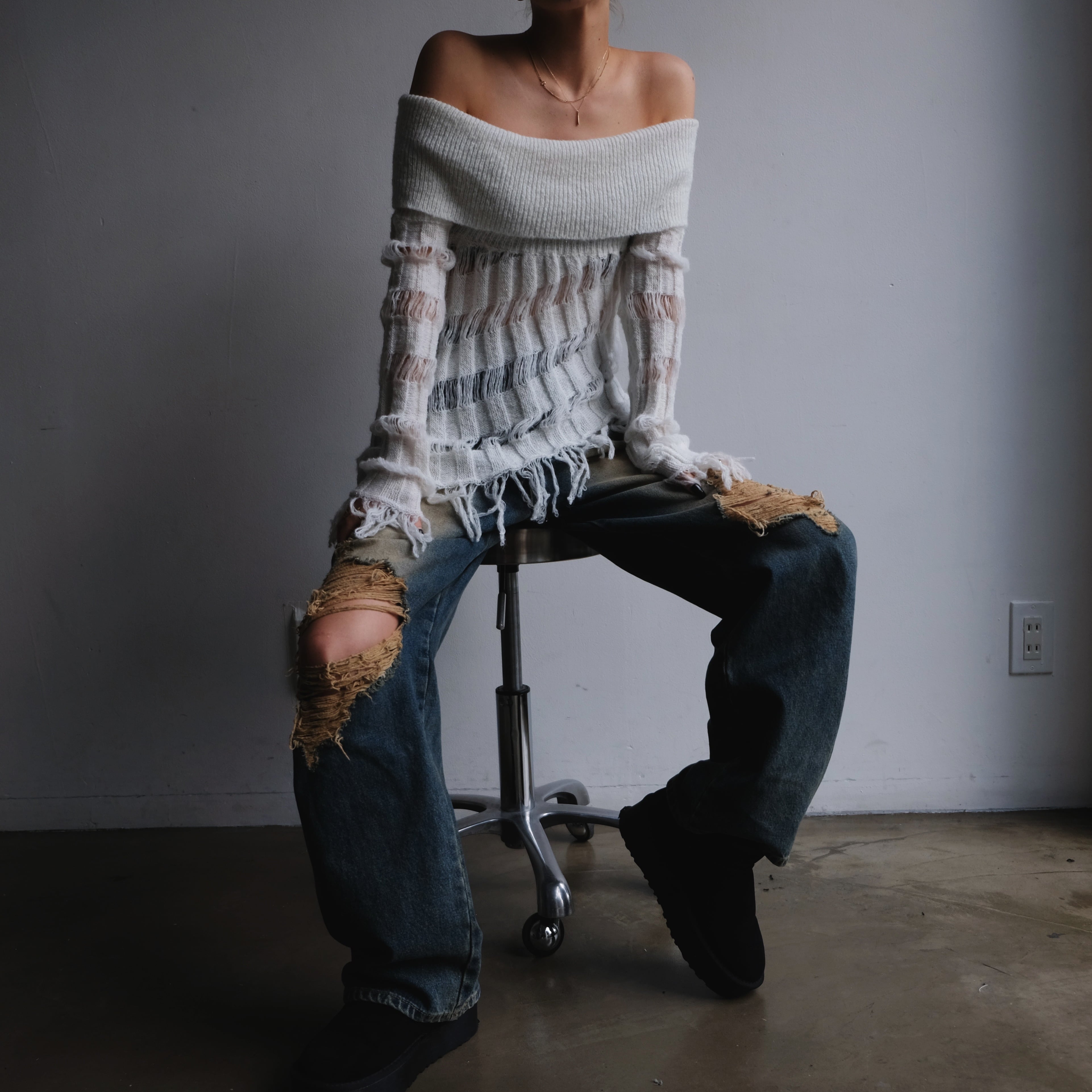 左右で異なる大胆なダメージ加工と、色褪せたカラー使いがこなれ感を演出。