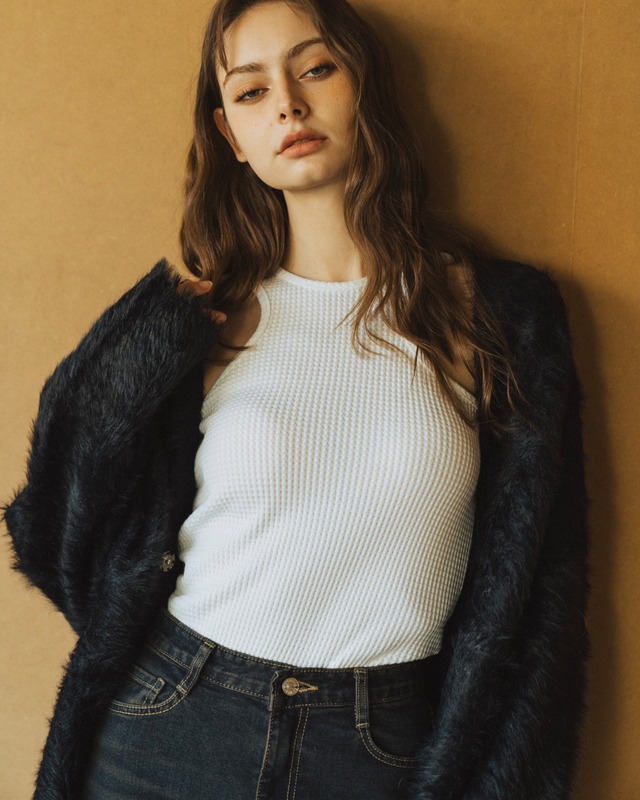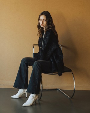 毛足の長いシャギー素材を採用した、素材感が際立つノーカラージャケット。