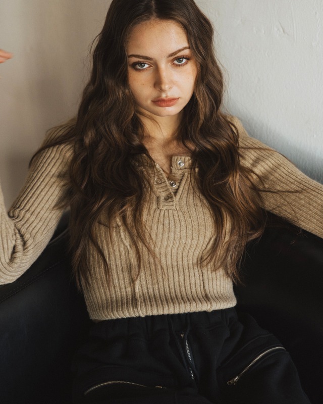 身体のラインに程よくフィットするリブ編みが女性らしさを演出するニットトップス。