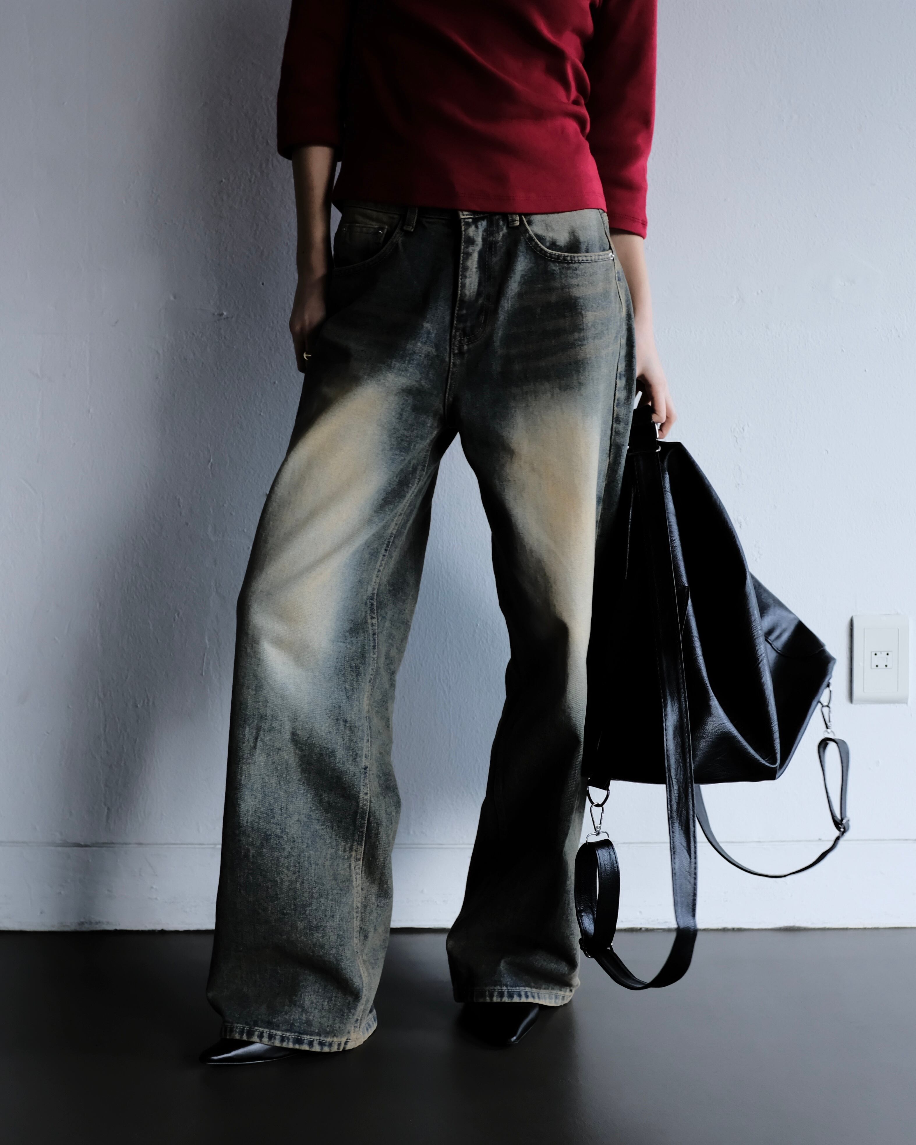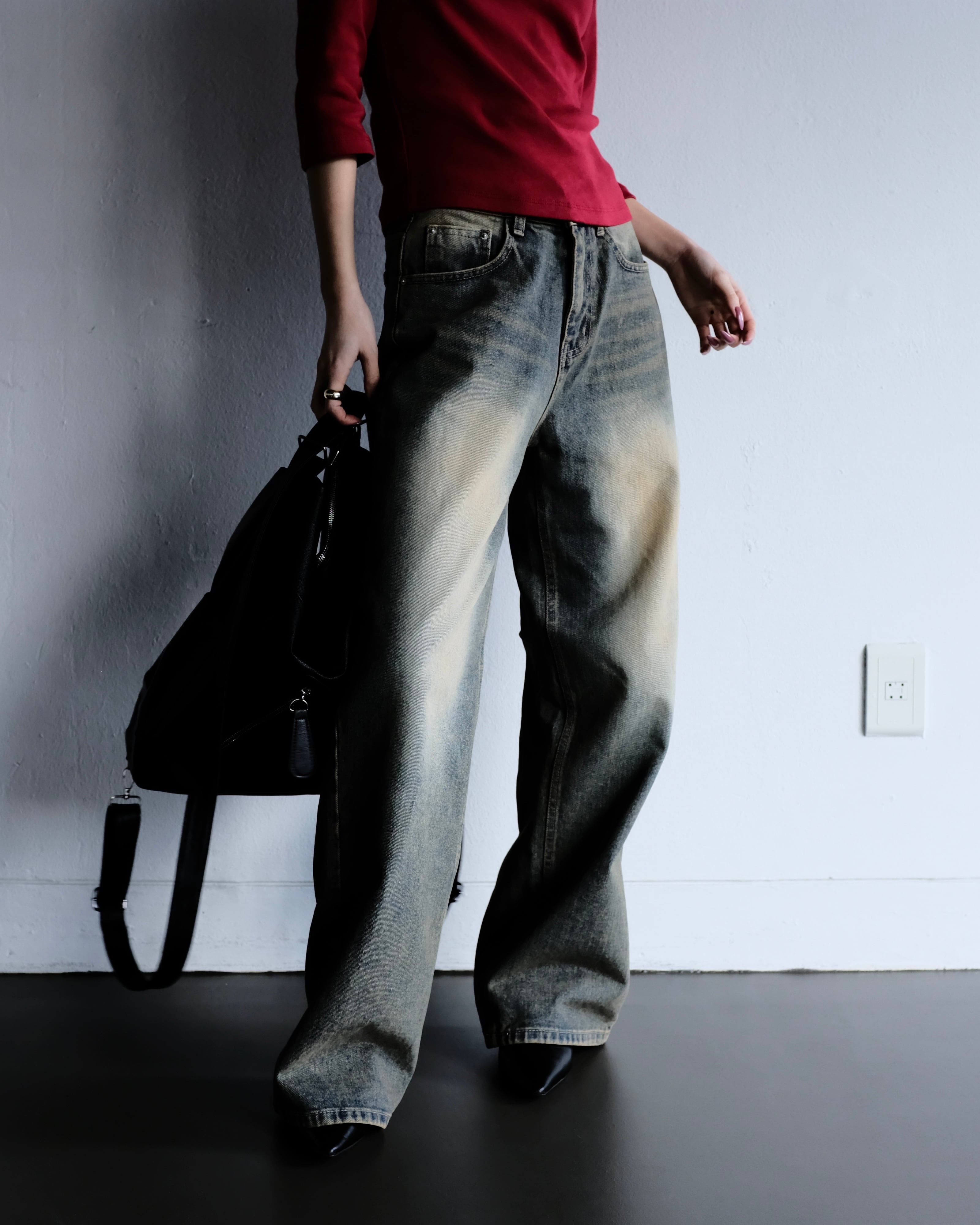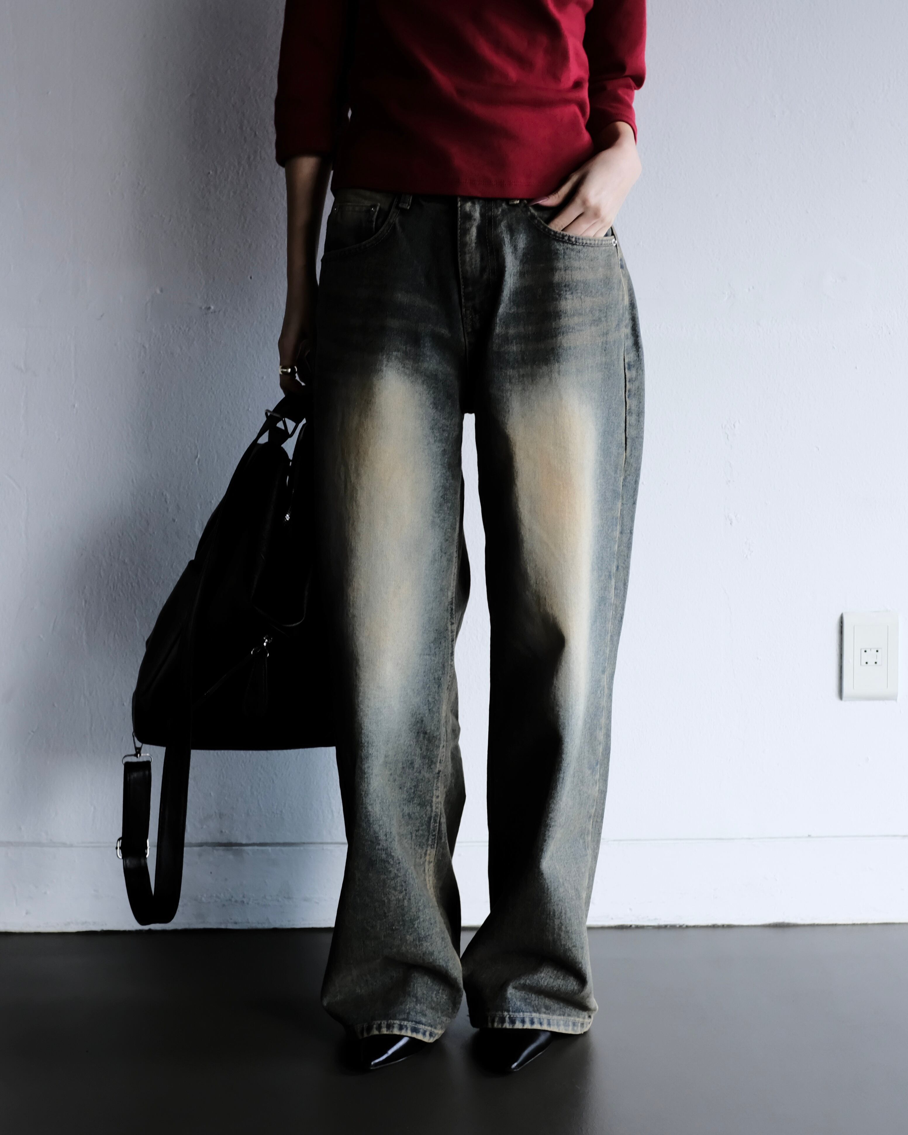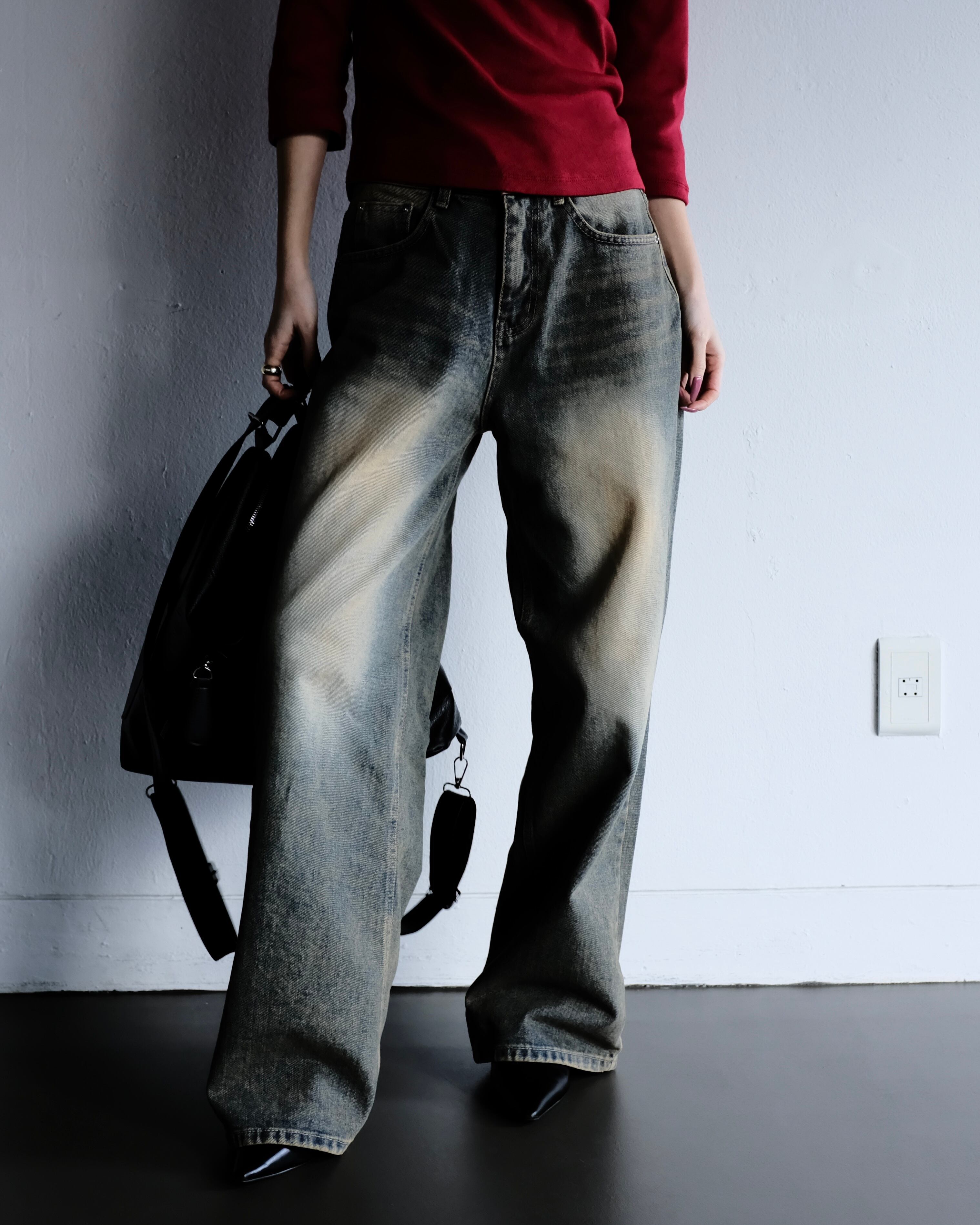 ゆるっとルーズなシルエットに、ヴィンテージライクな色落ちがこなれ感たっぷりのワイドデニム。