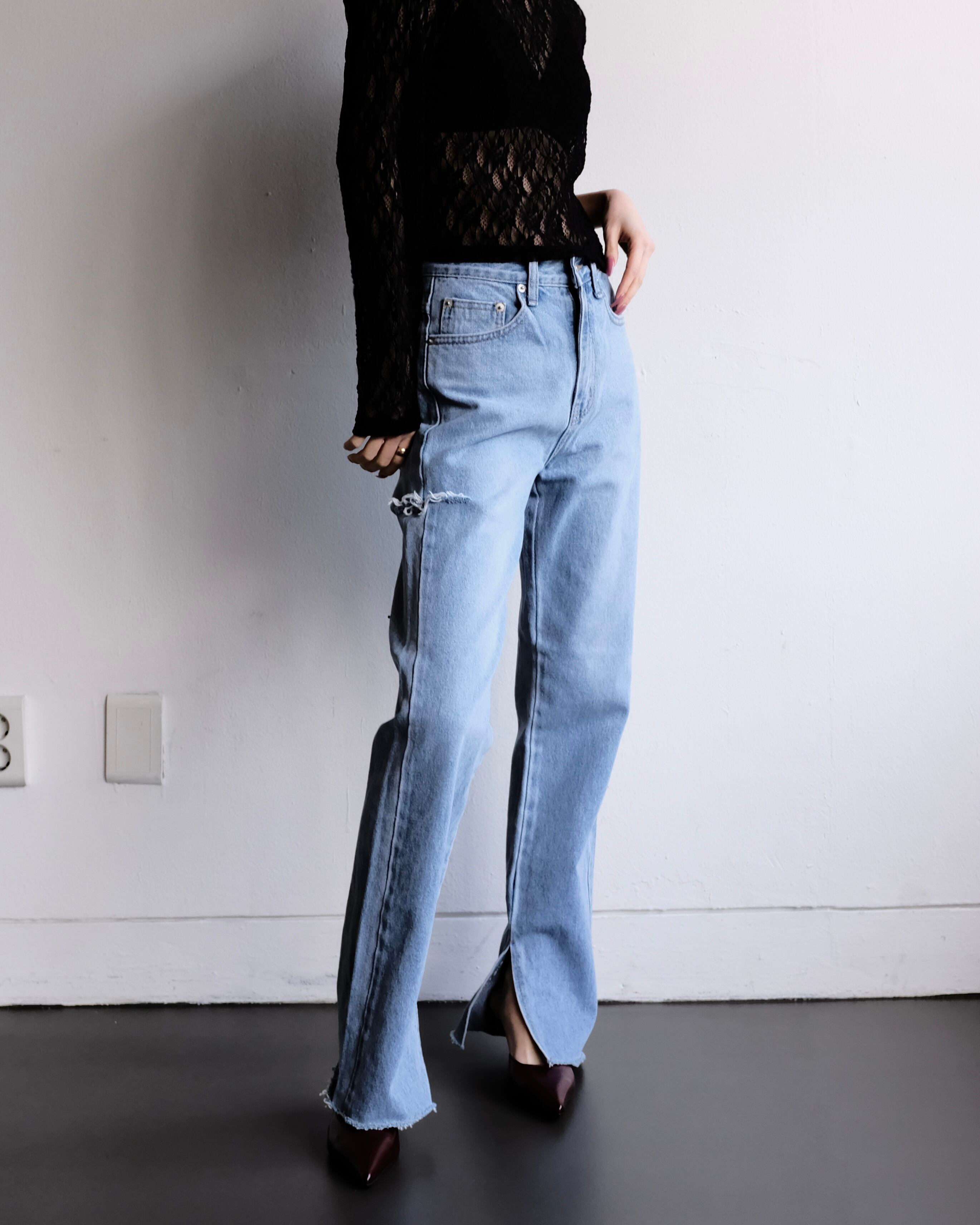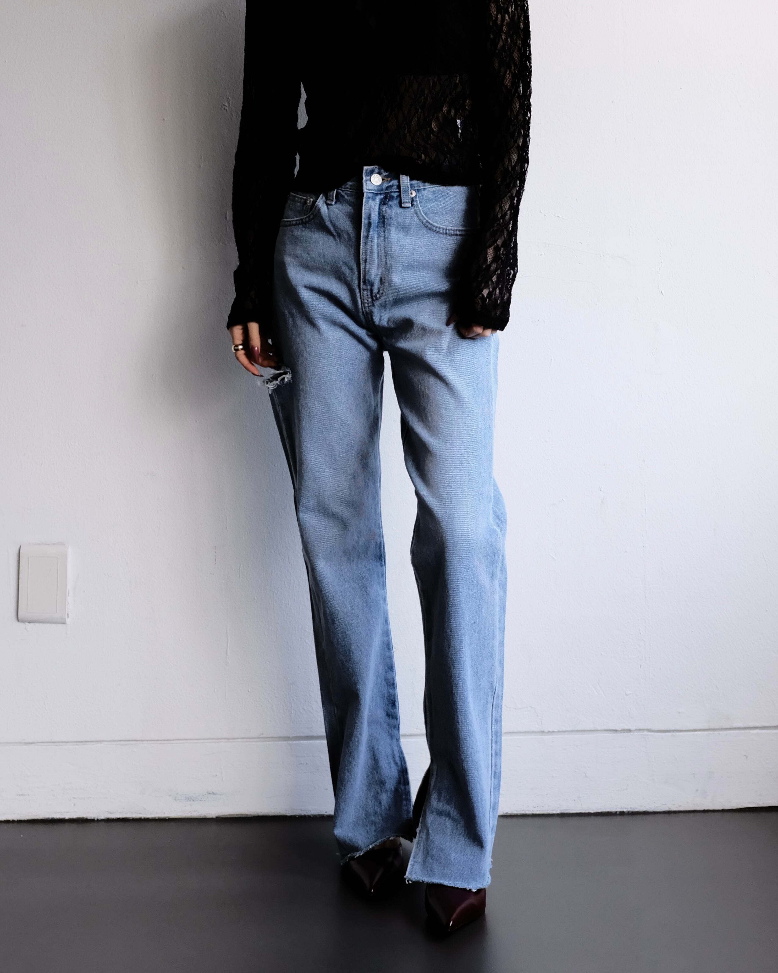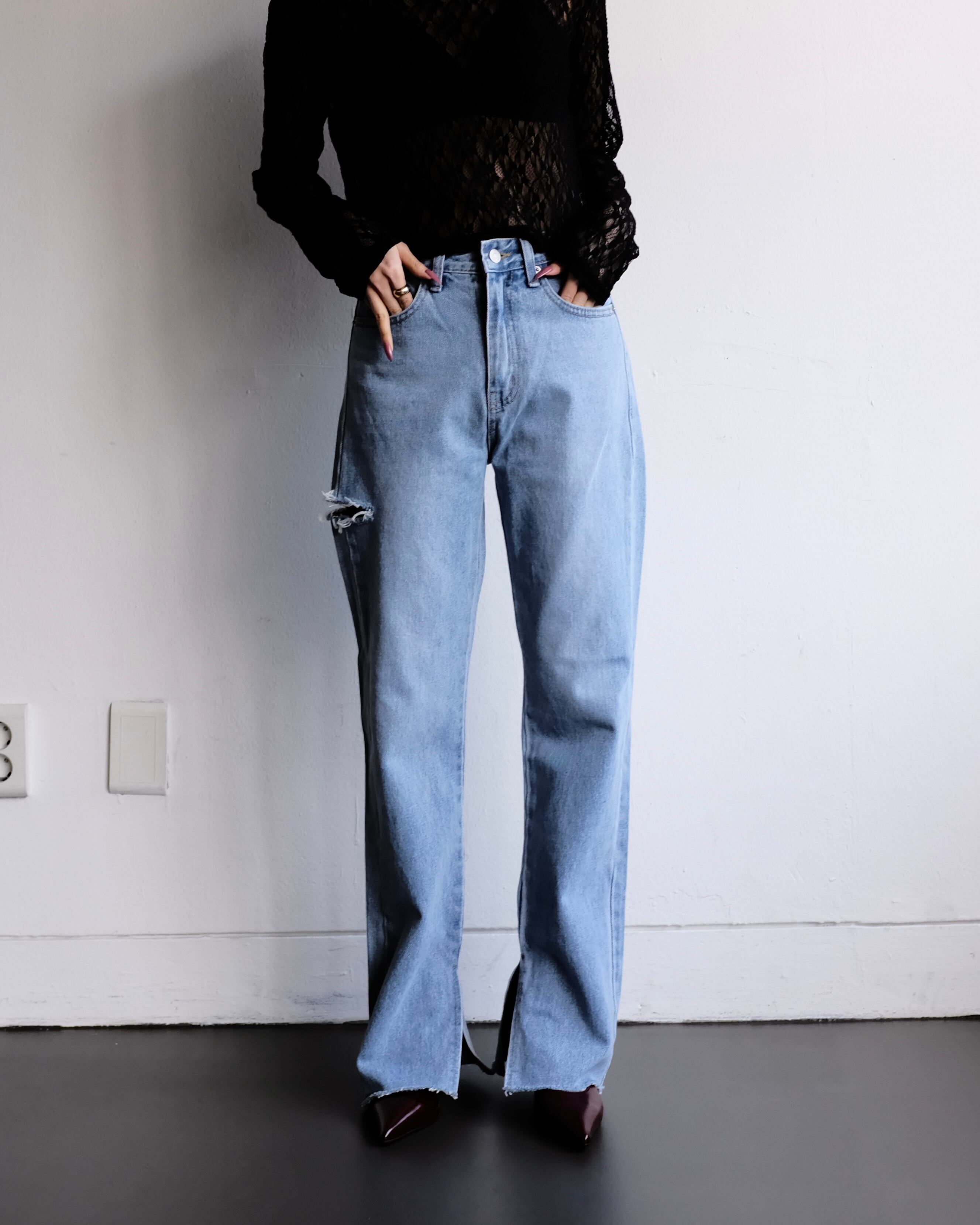 内側のスリットとサイドのカットアウトで遊び心を加えたストレートデニム。