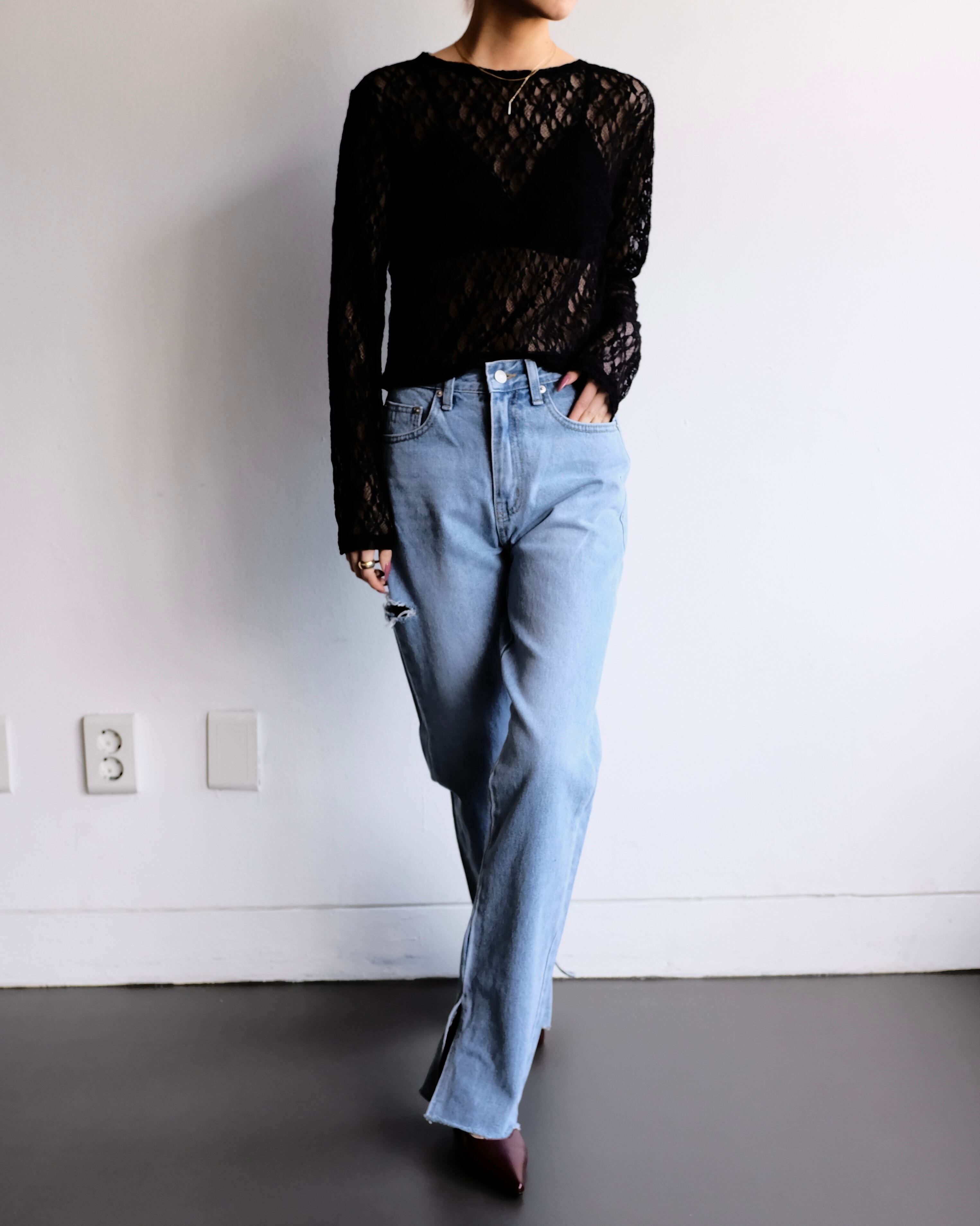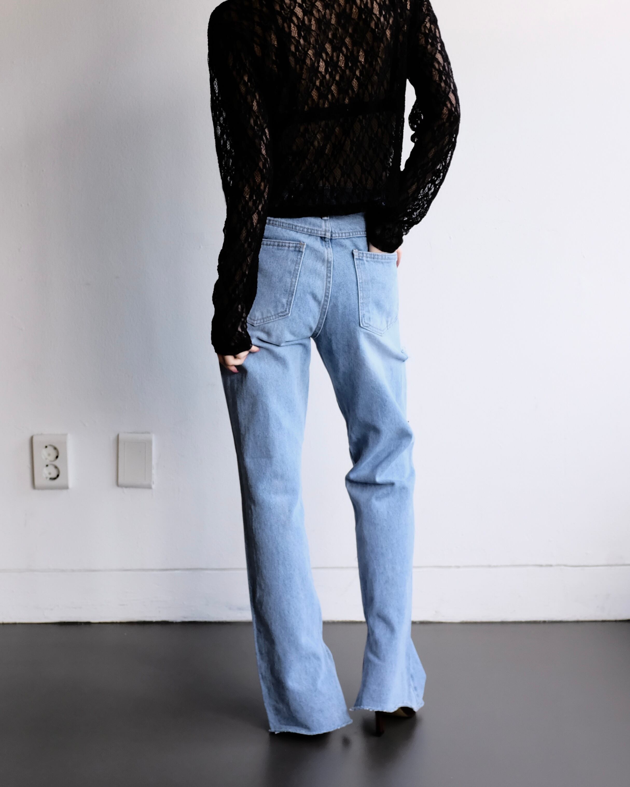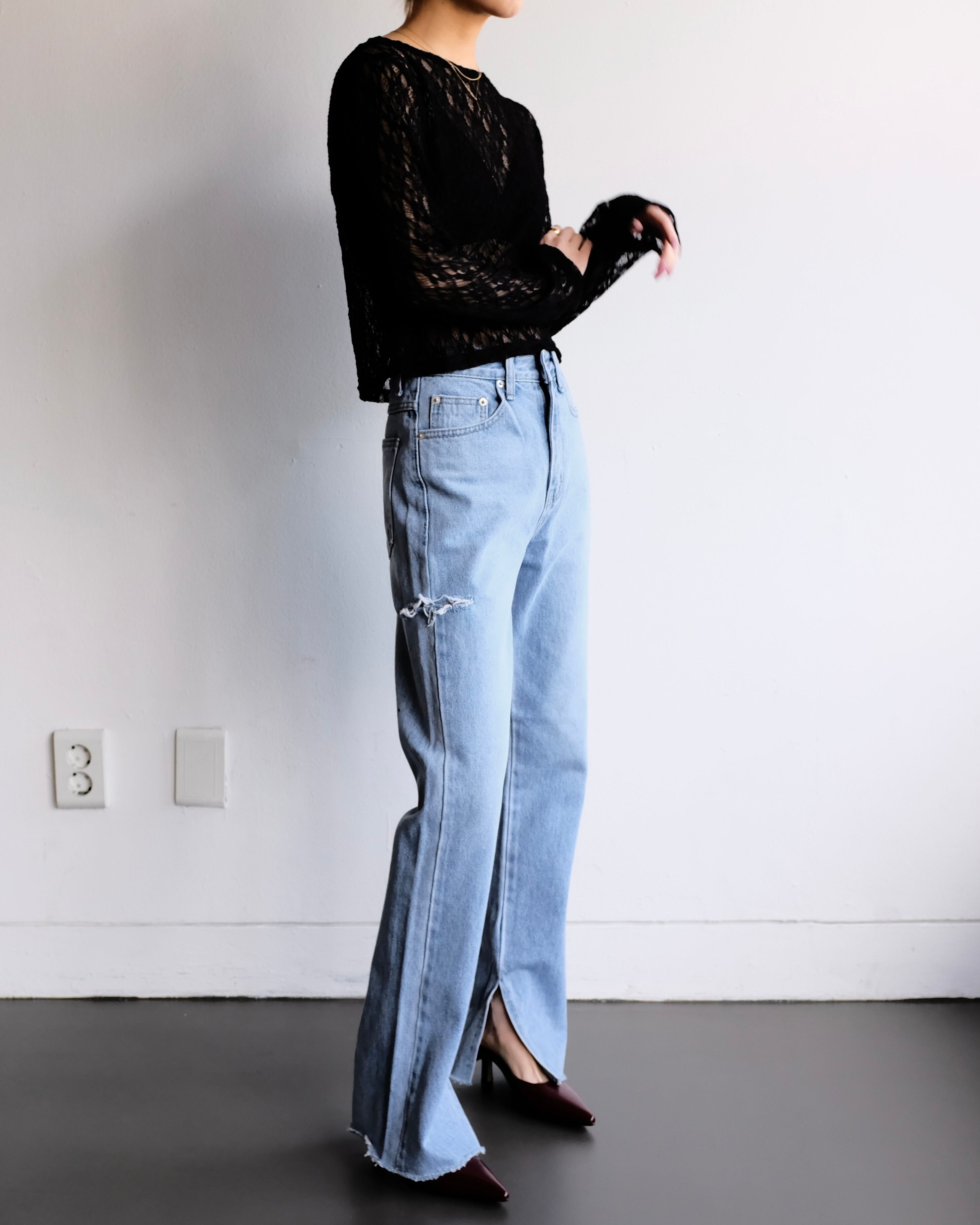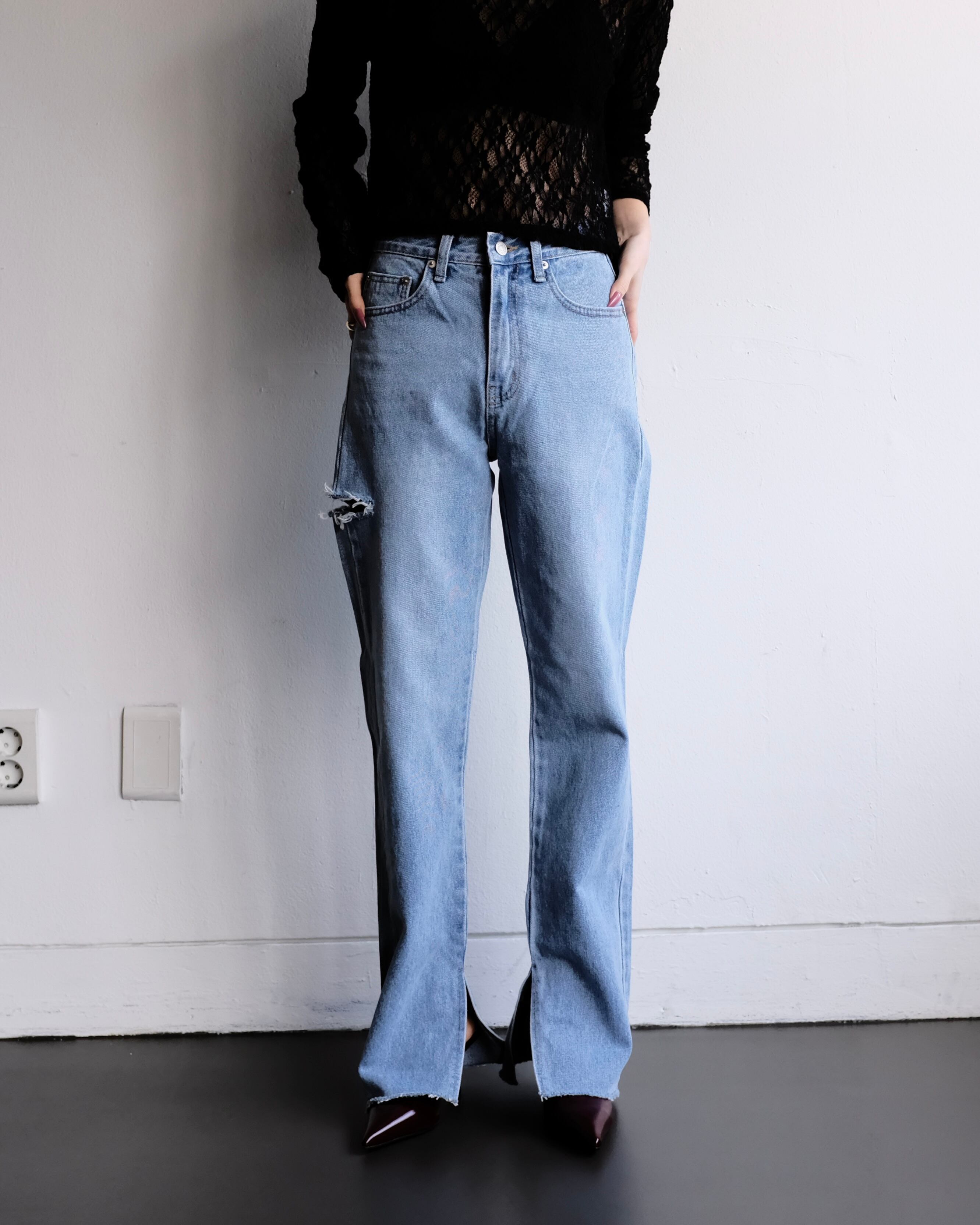 内側のスリットとサイドのカットアウトで遊び心を加えたストレートデニム。