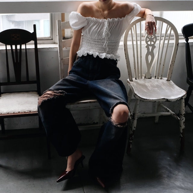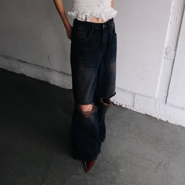両膝にランダムなダメージが入った、ワイドバギーなシルエットのデニム。