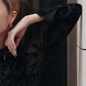 透け感のあるチュール素材にベロアのような微起毛素材の花柄を散りばめた、MONOTONE FLORAL TOPS