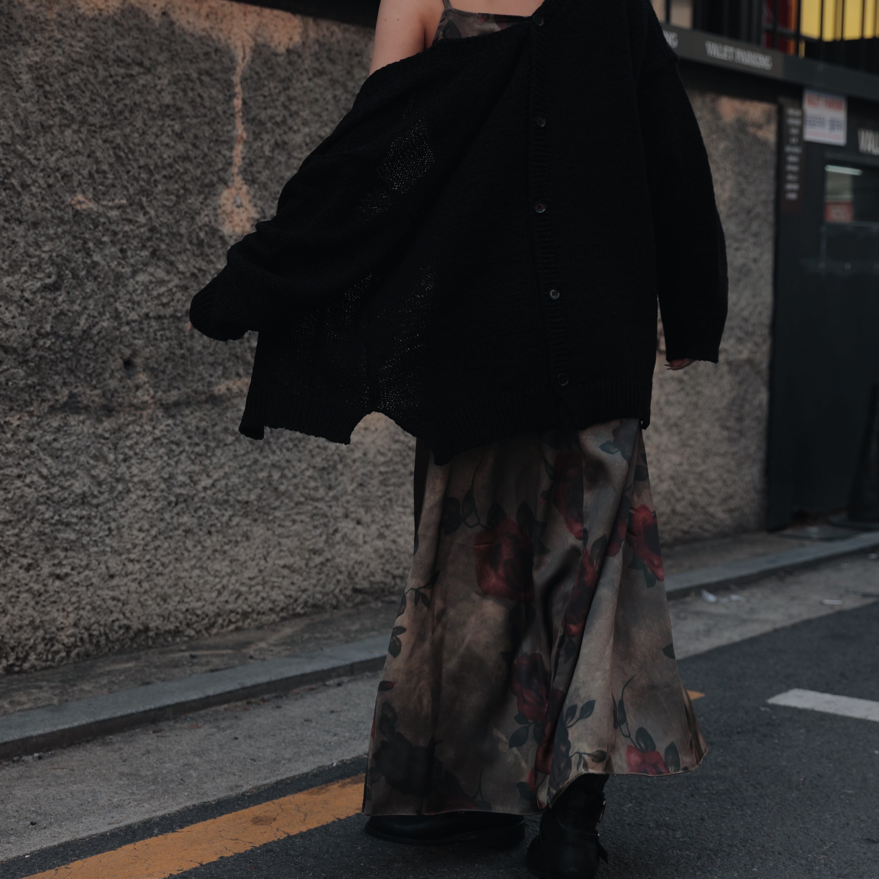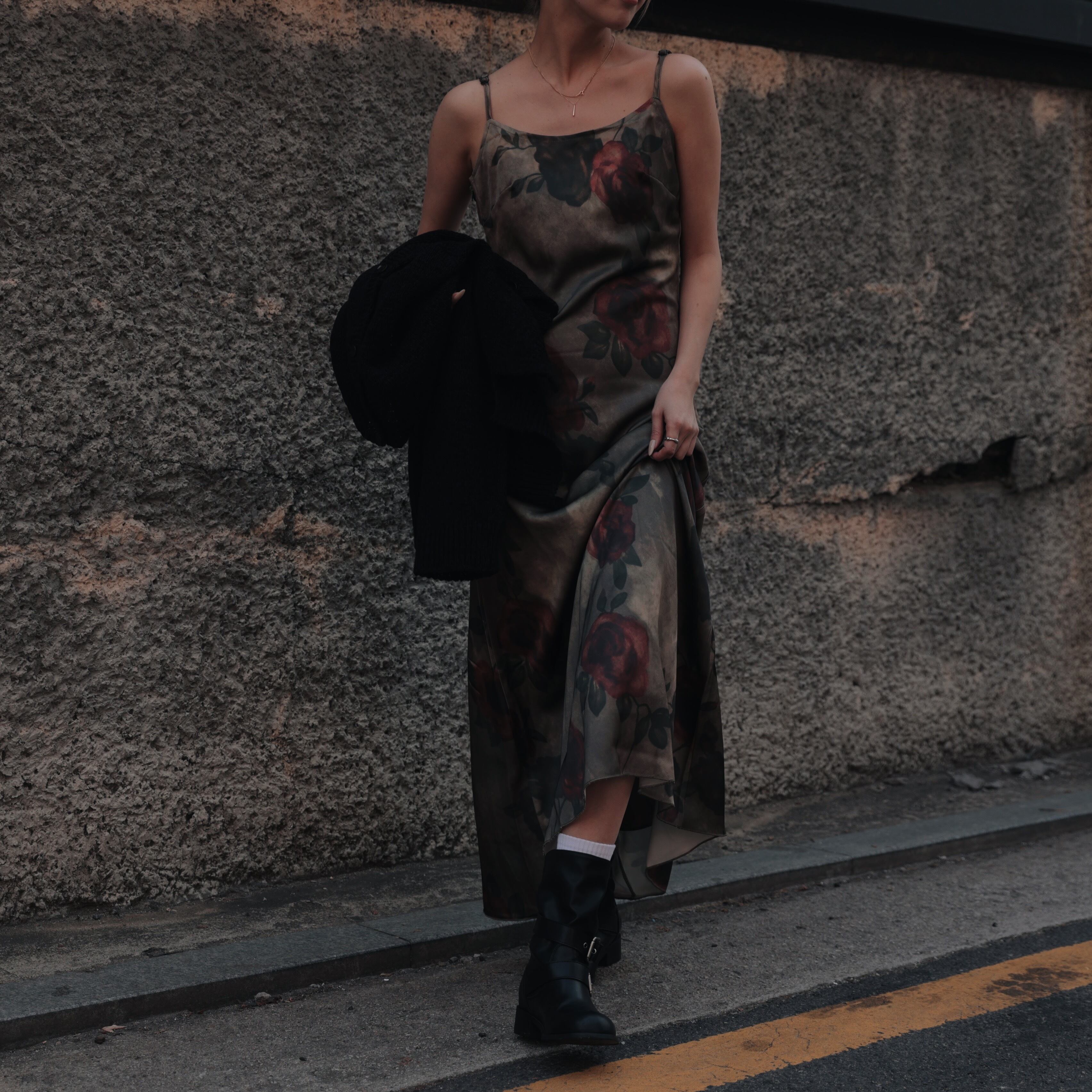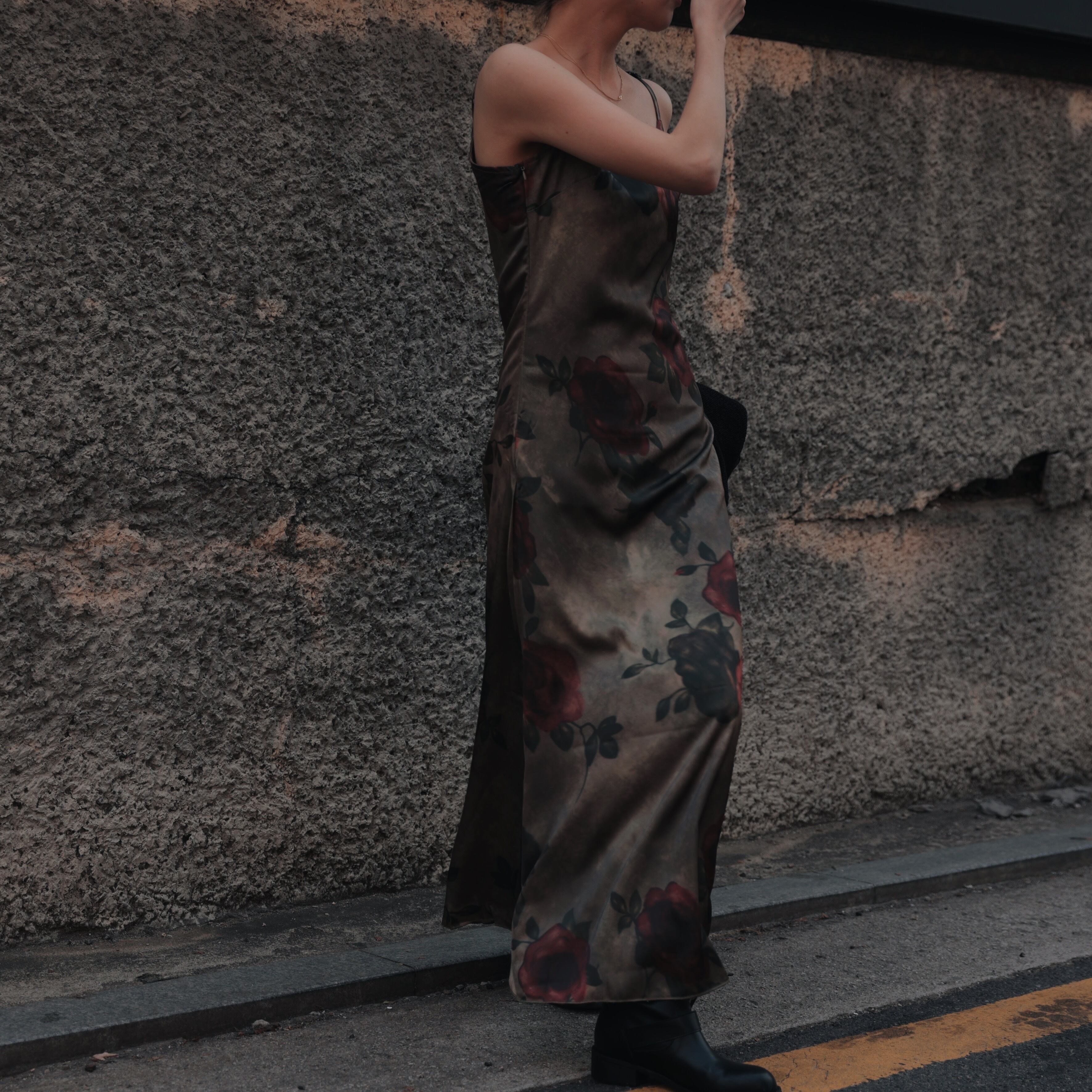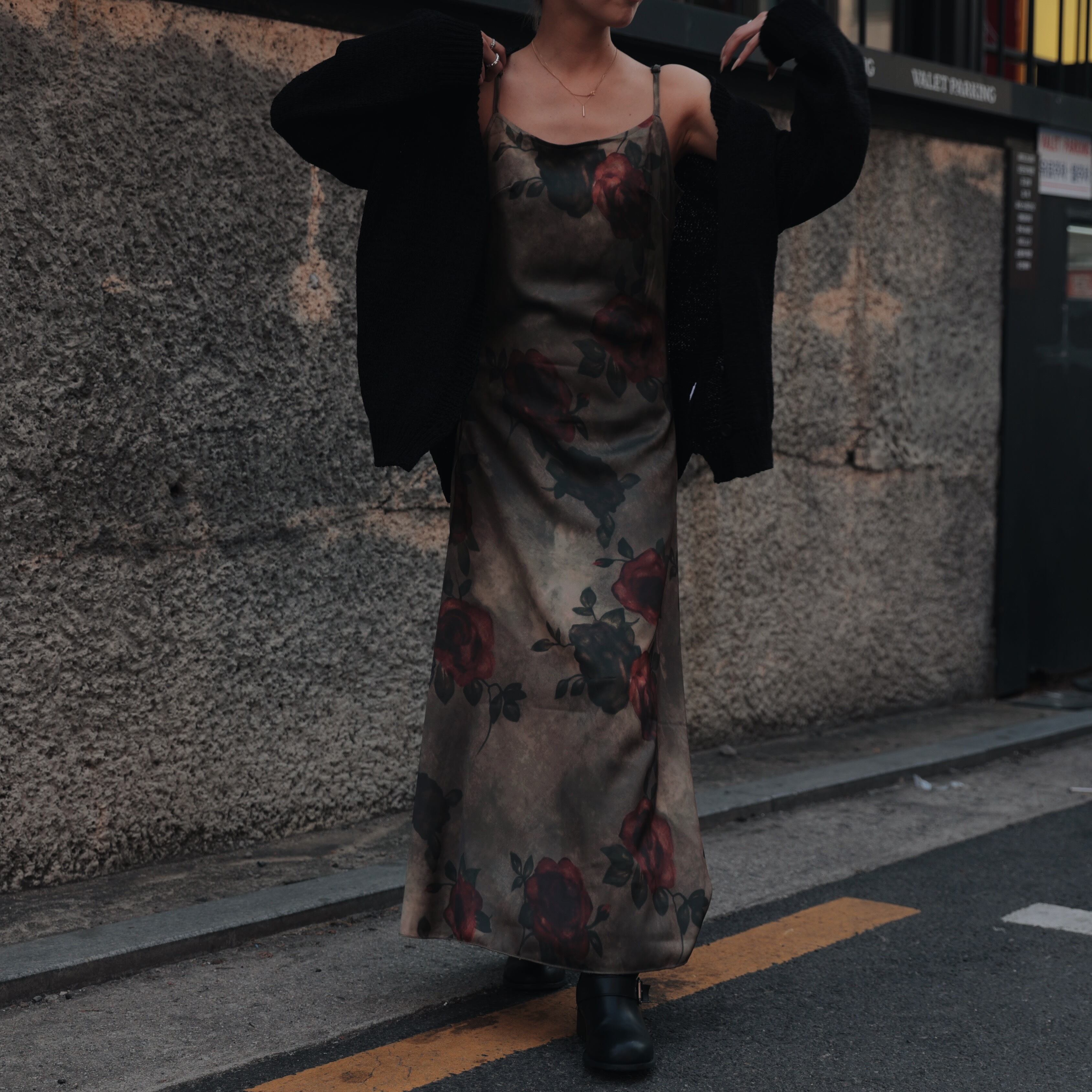 アンティーク調の大胆な花柄が目を惹くロング丈のキャミワンピース。