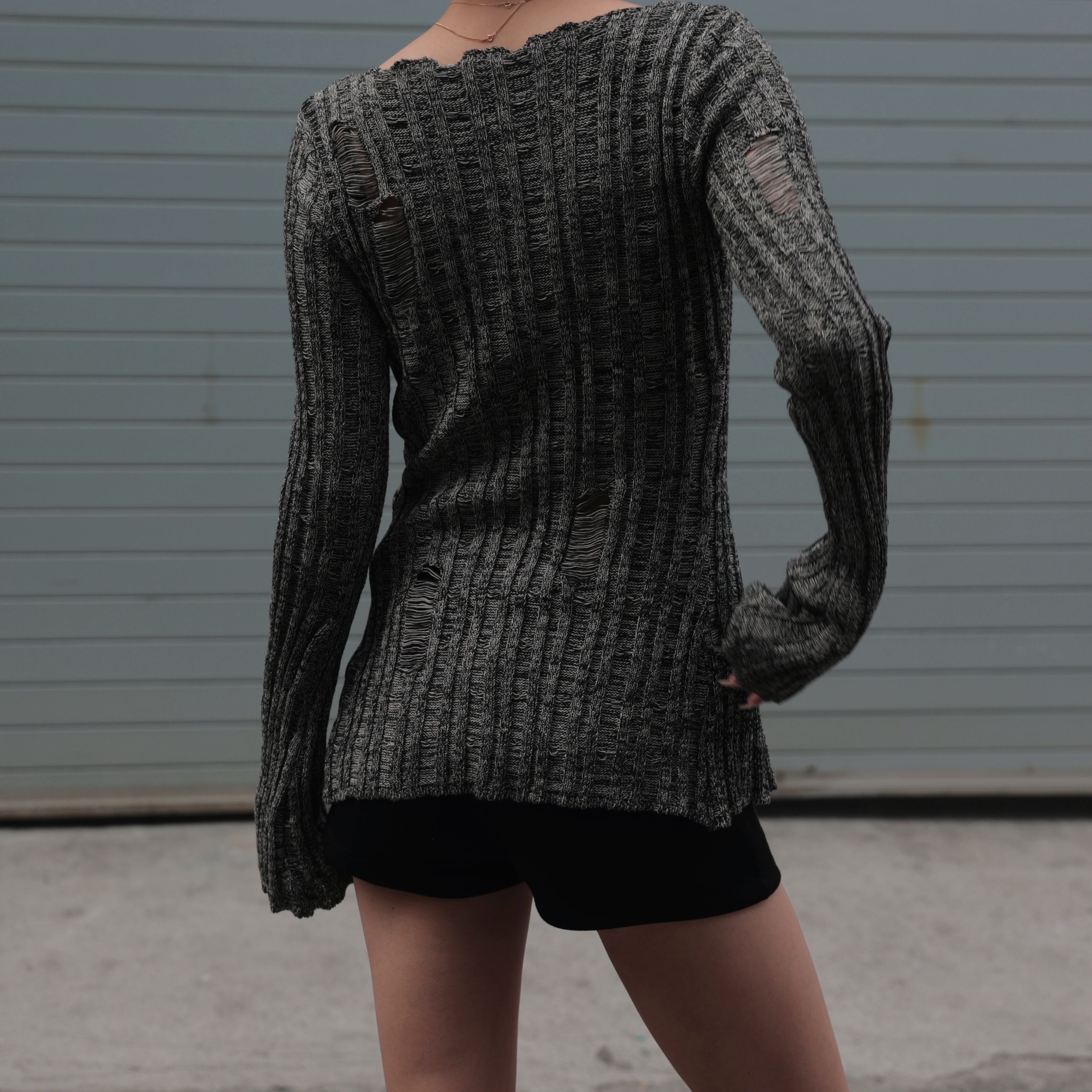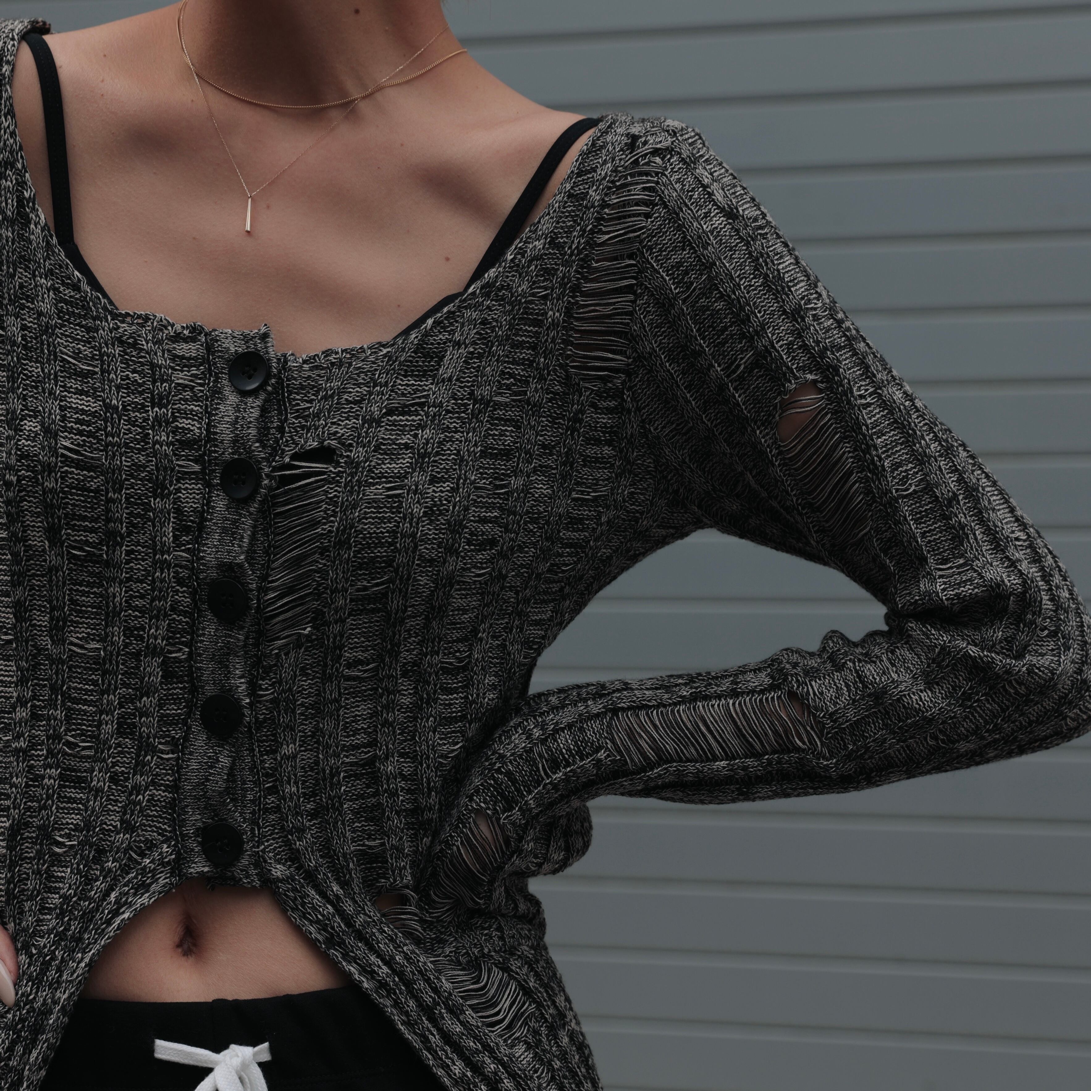 ところどころにちょっとしたダメージを施すことで、ダメージ部分からは肌が透け今の時期でも重たく見えず着こなしやすい一枚です。