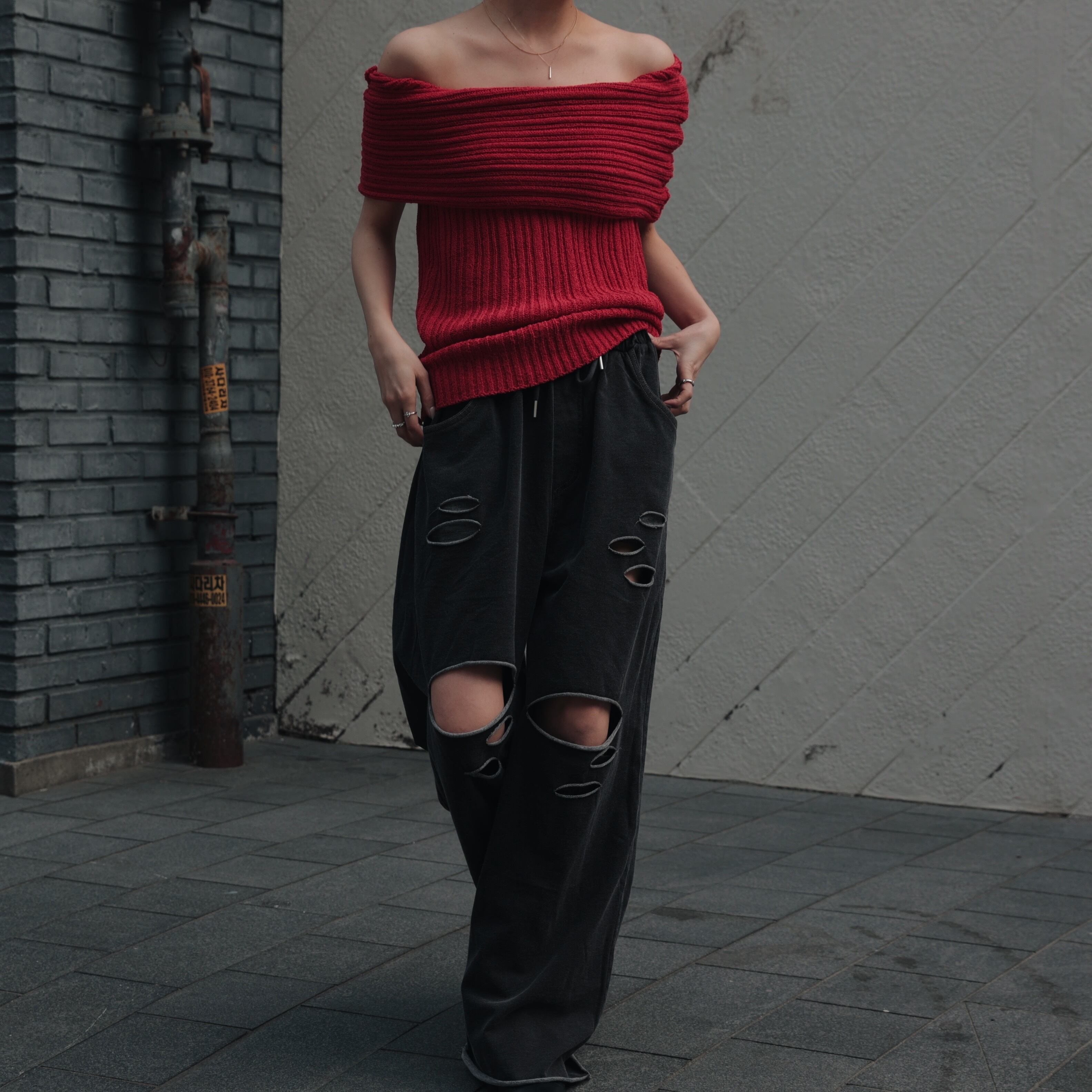 もったりとしたボリュームのあるニットが特徴的なオフショルダートップス