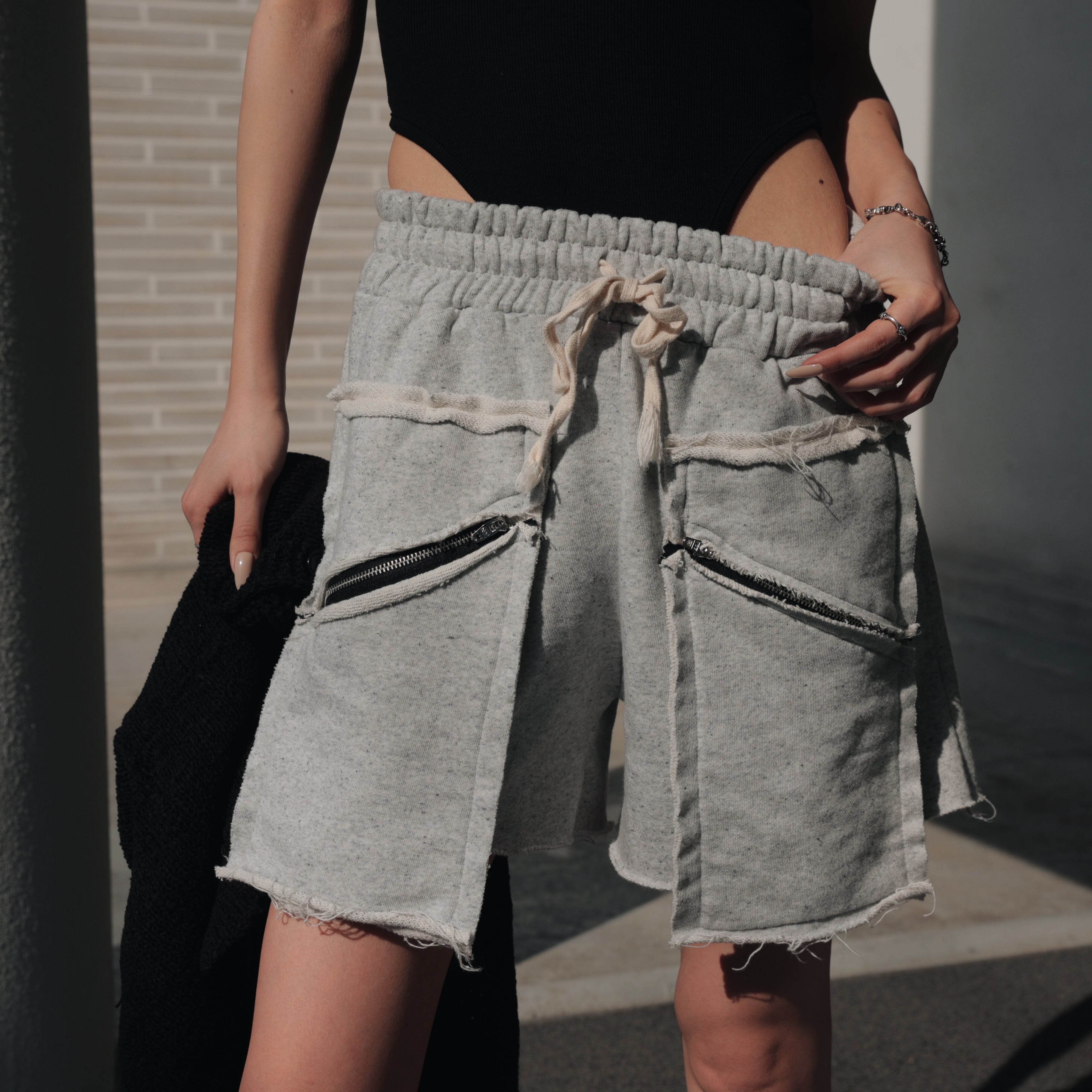 大胆な切りっぱなしのフロントポケットがキャッチーなスウェット素材のハーフパンツ。