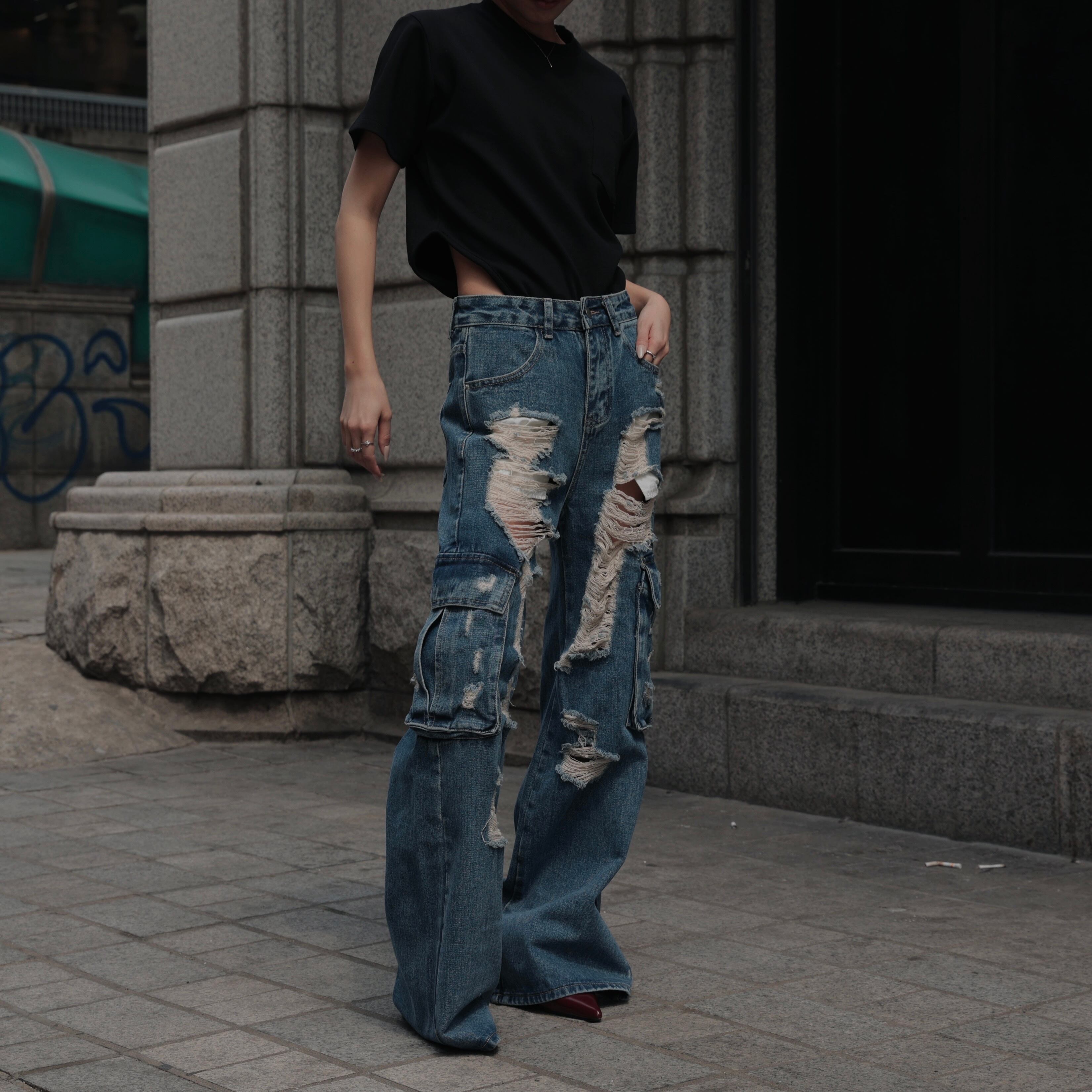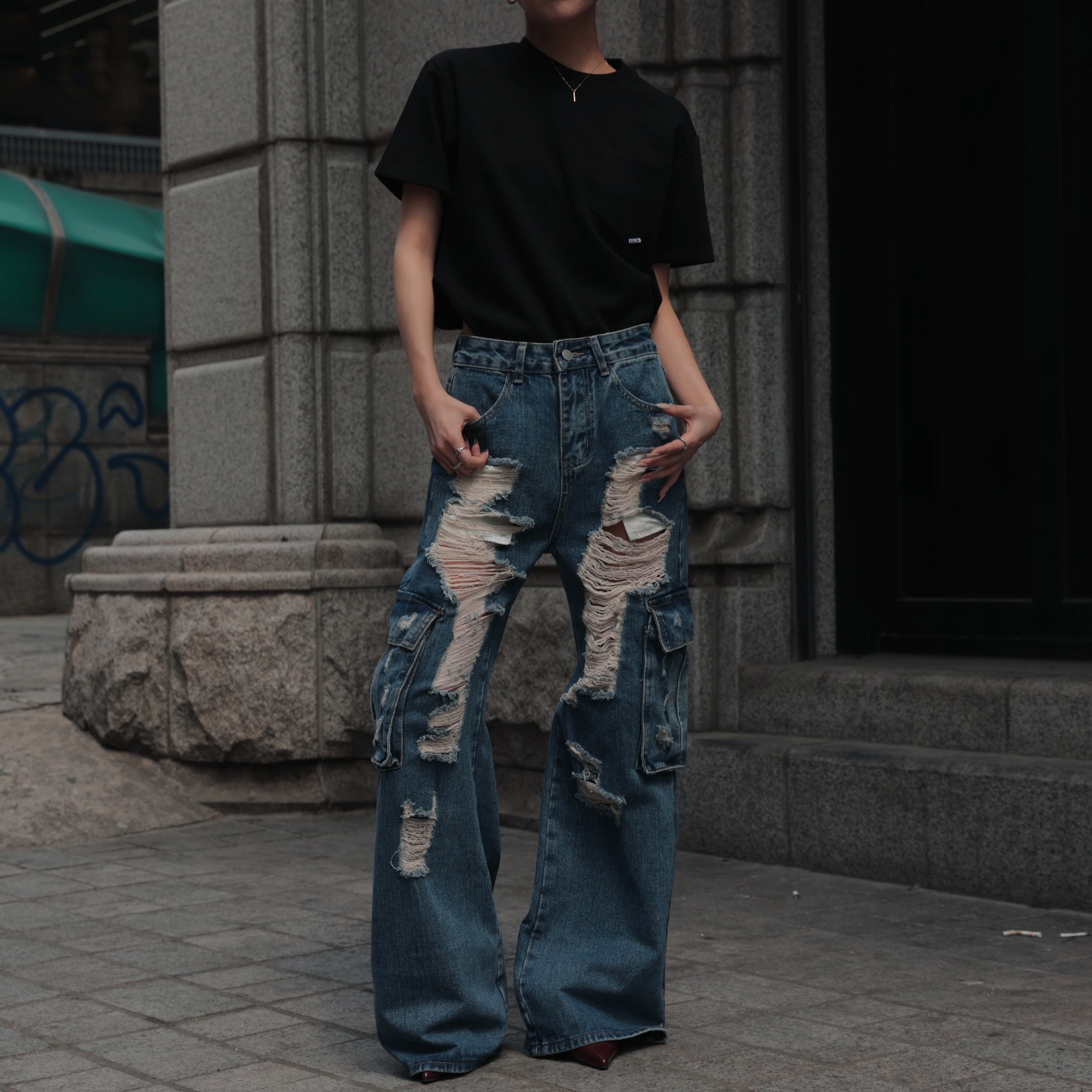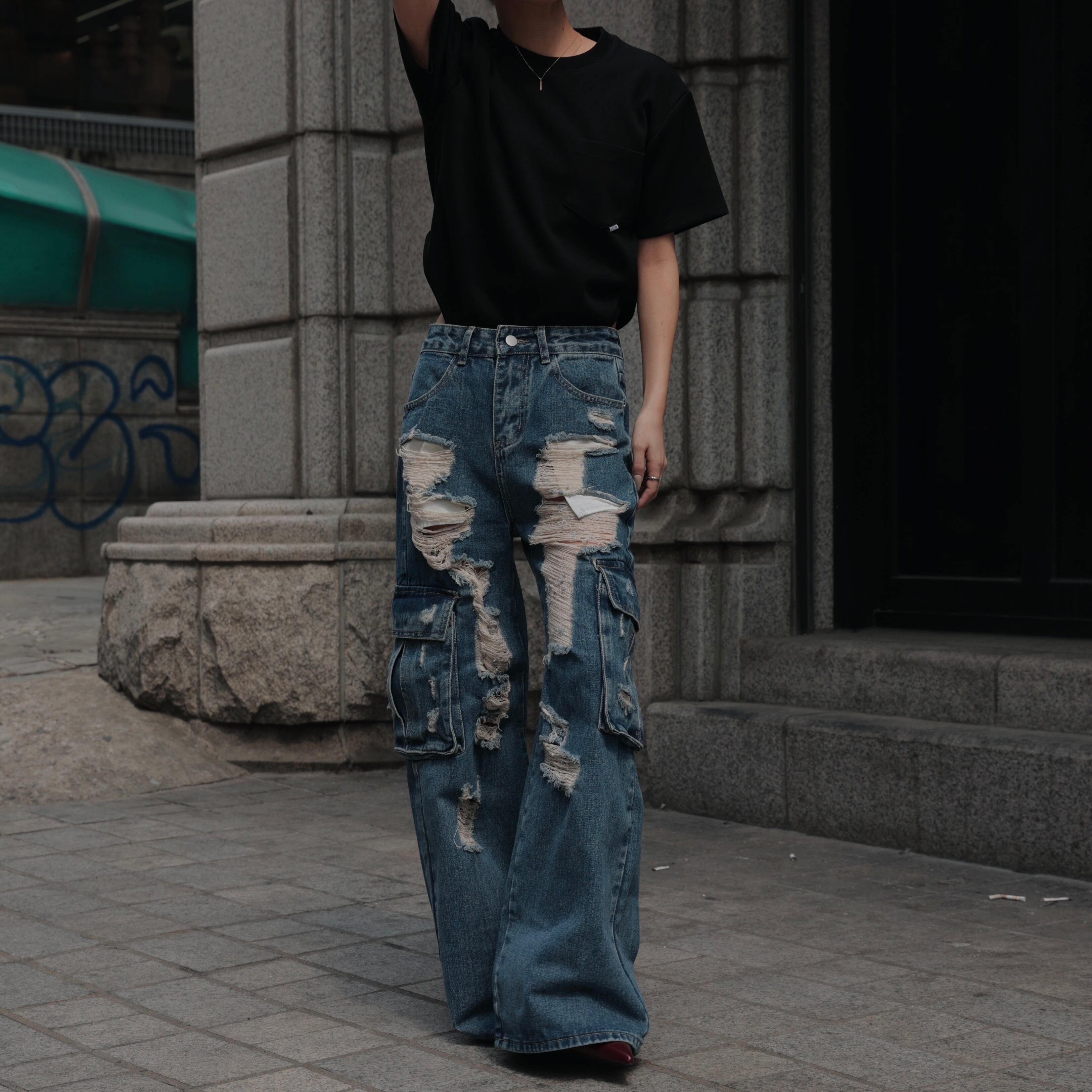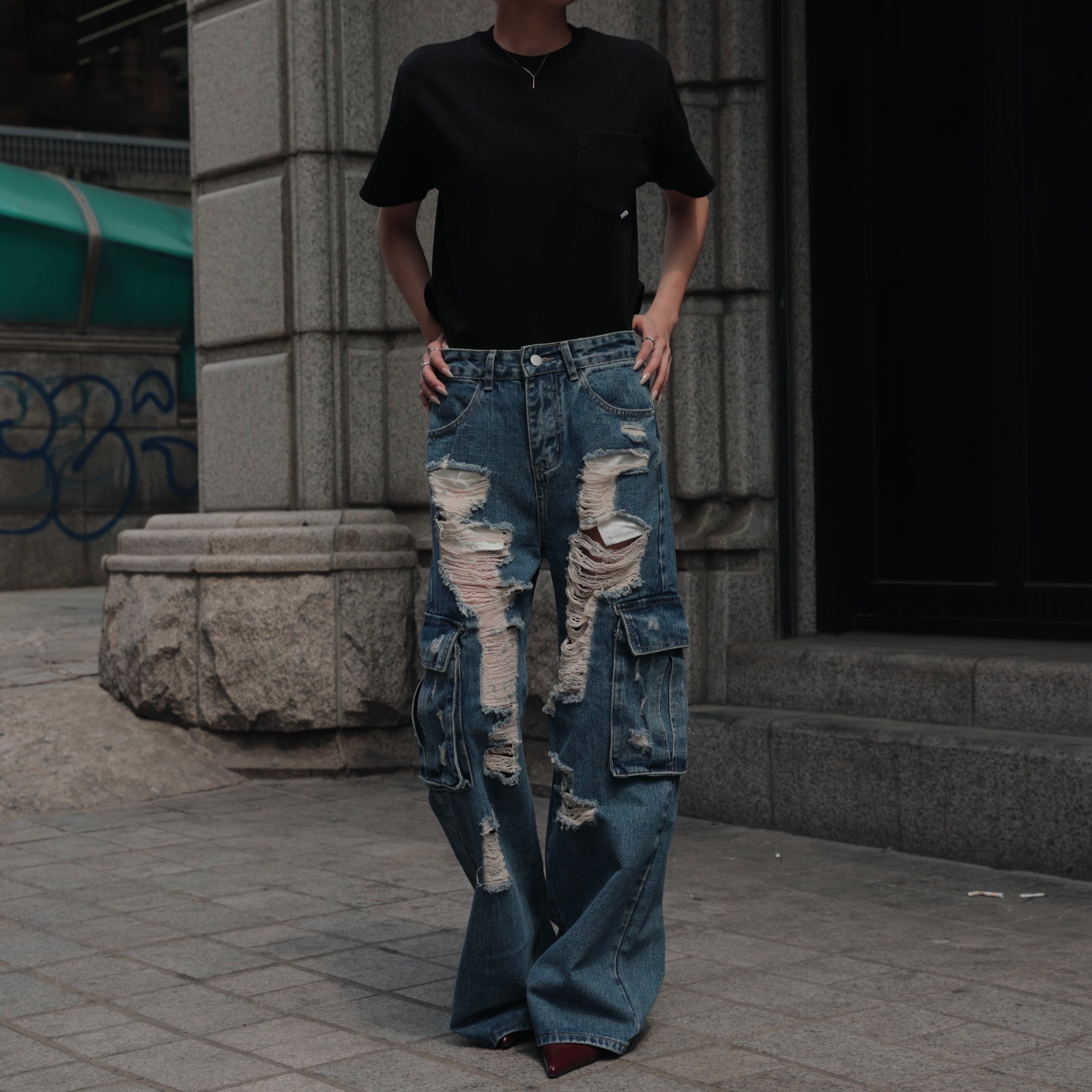 ざっくりとした大胆なダメージ加工にサイドの大きなフラップポケットがユニークなHARD TORN DENIM