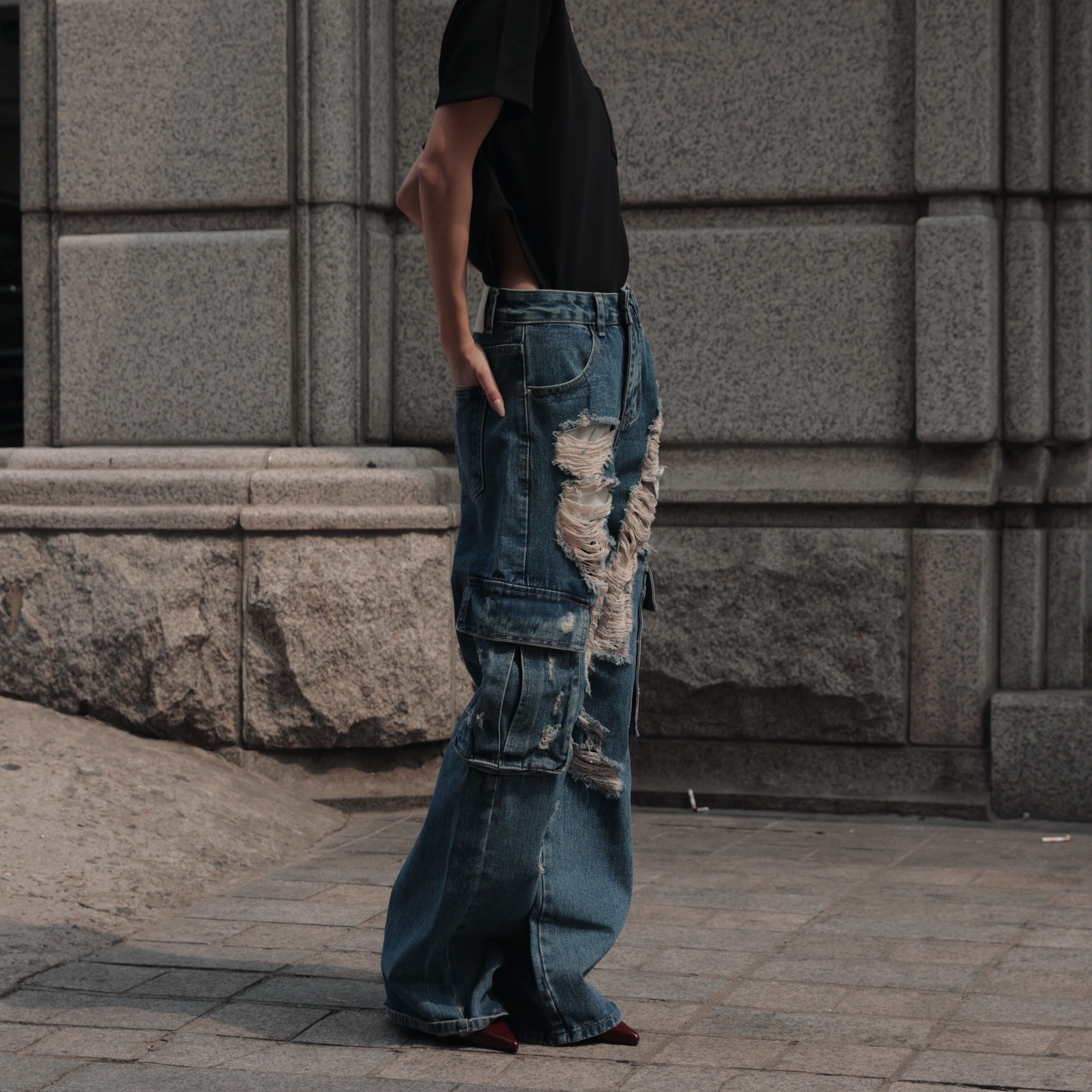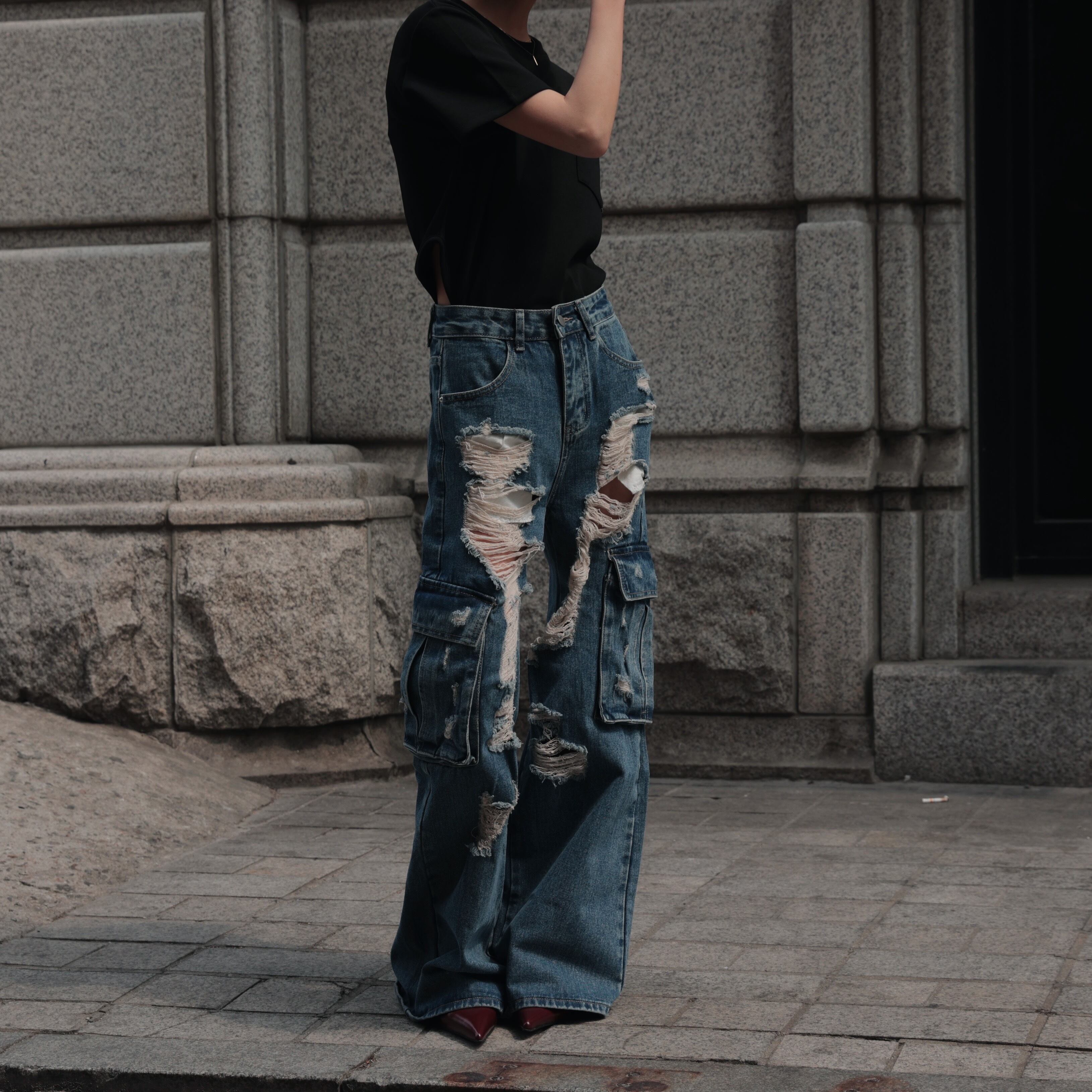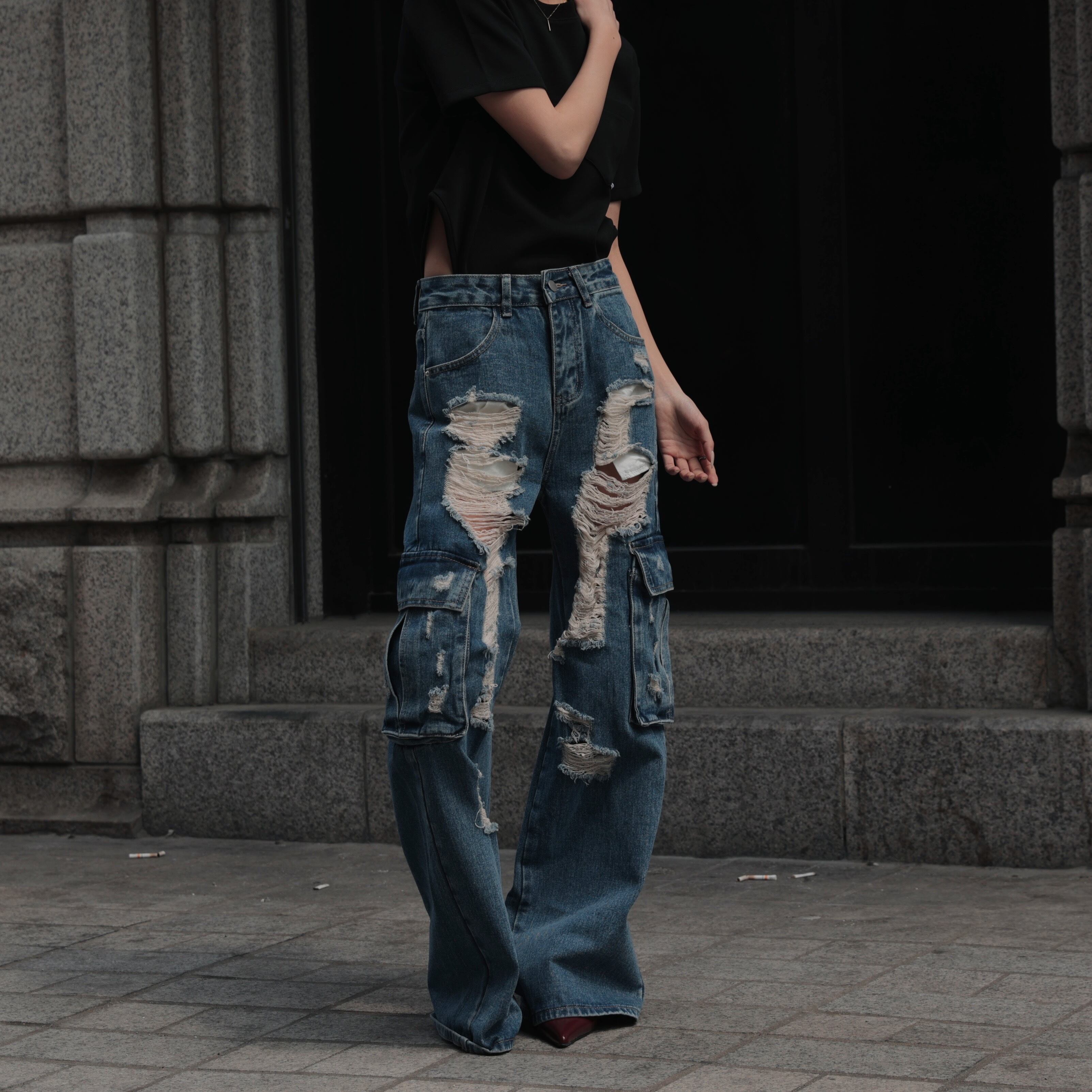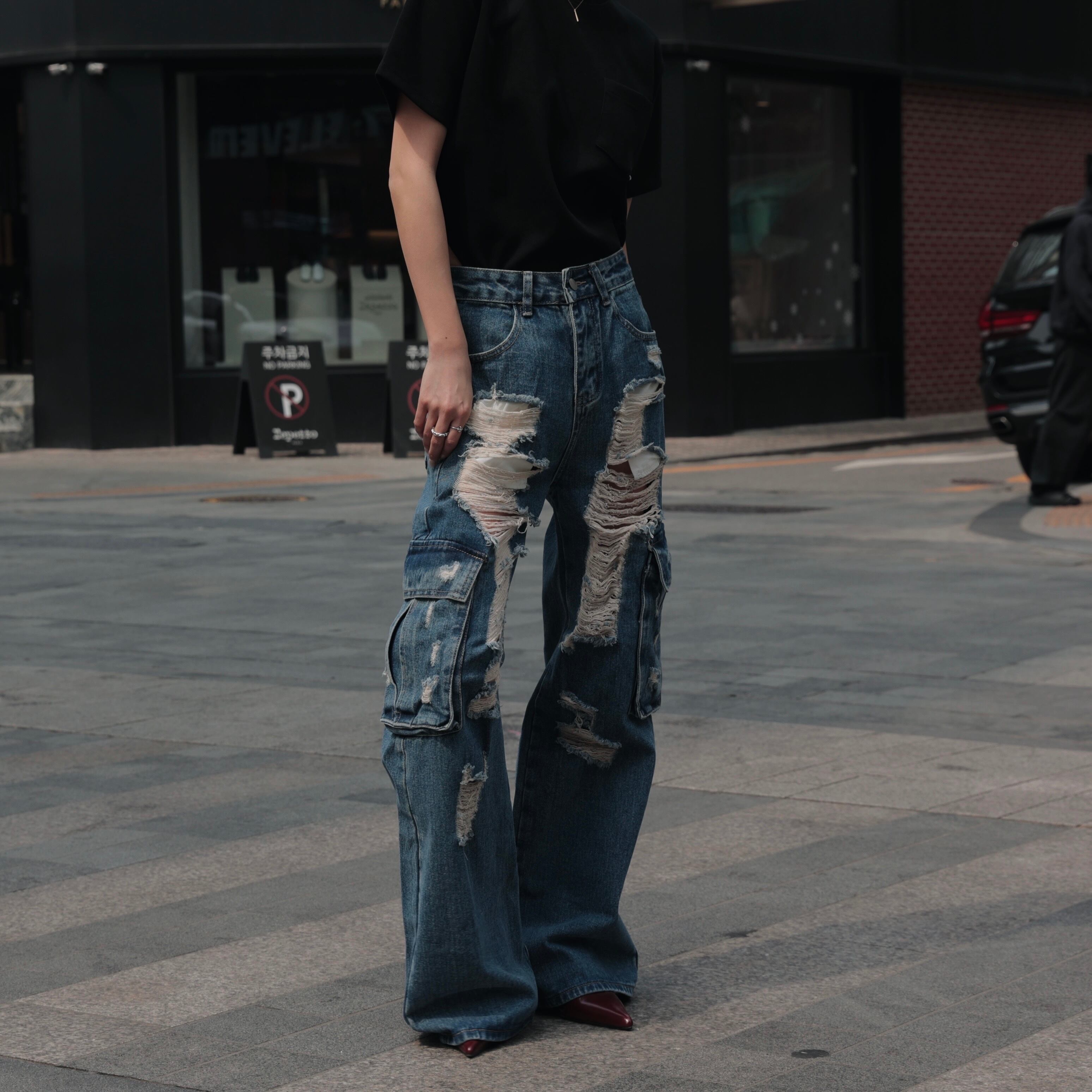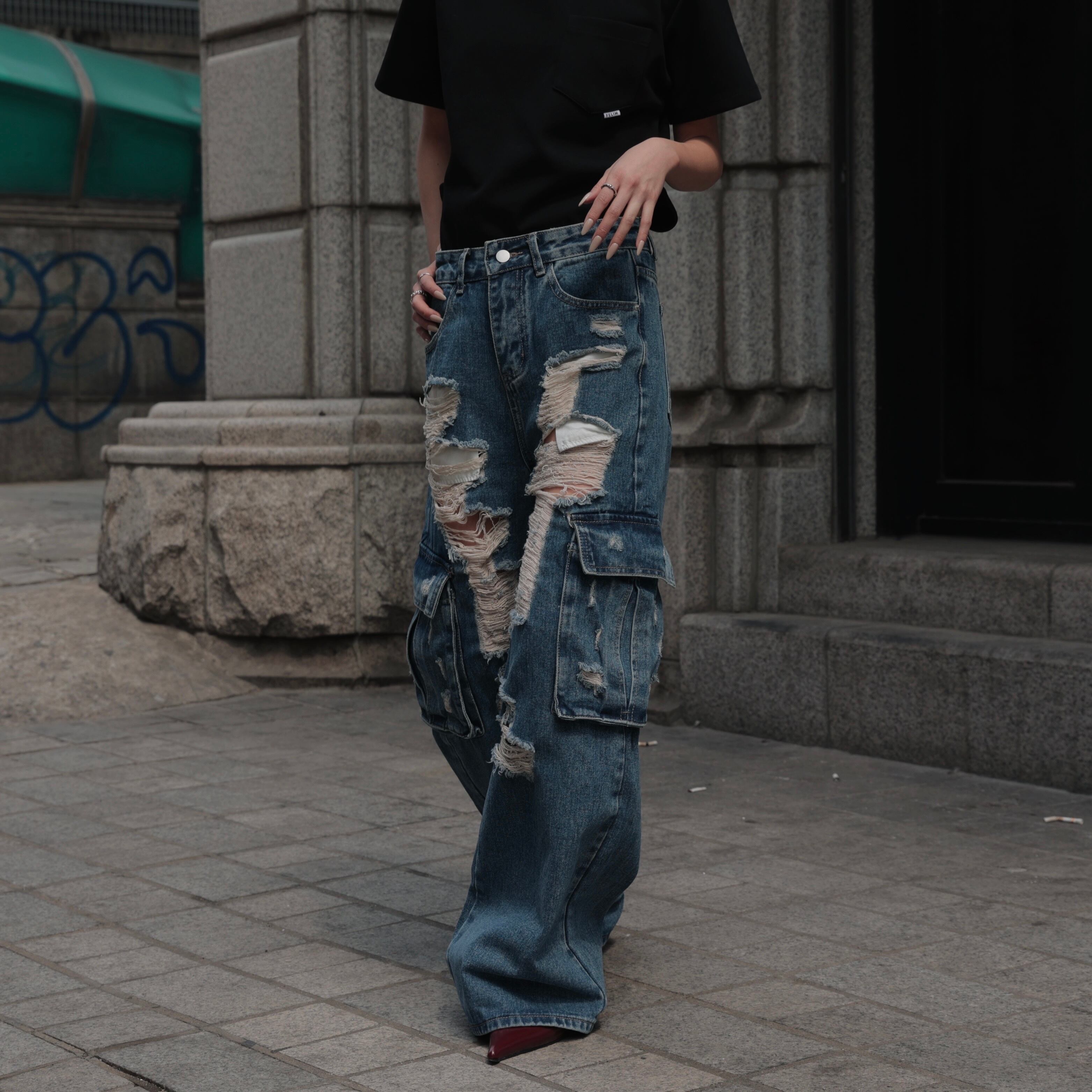 ざっくりとした大胆なダメージ加工にサイドの大きなフラップポケットがユニークなHARD TORN DENIM