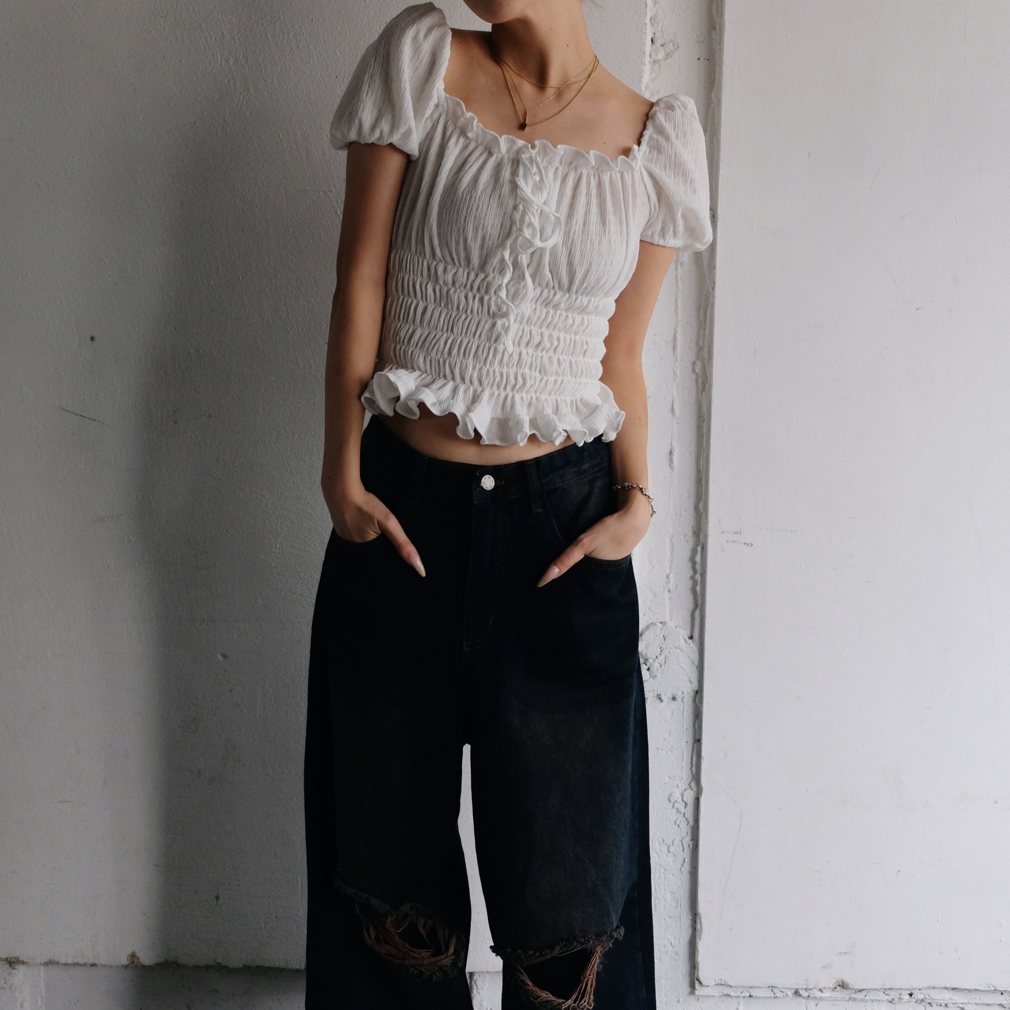 フェミニンムードなパフスリーブのシャーリングトップス。