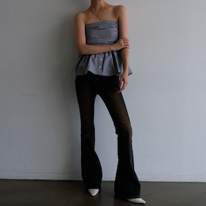 胸元にクシュっと生地を寄せたバックシャーリングのベアトップス。