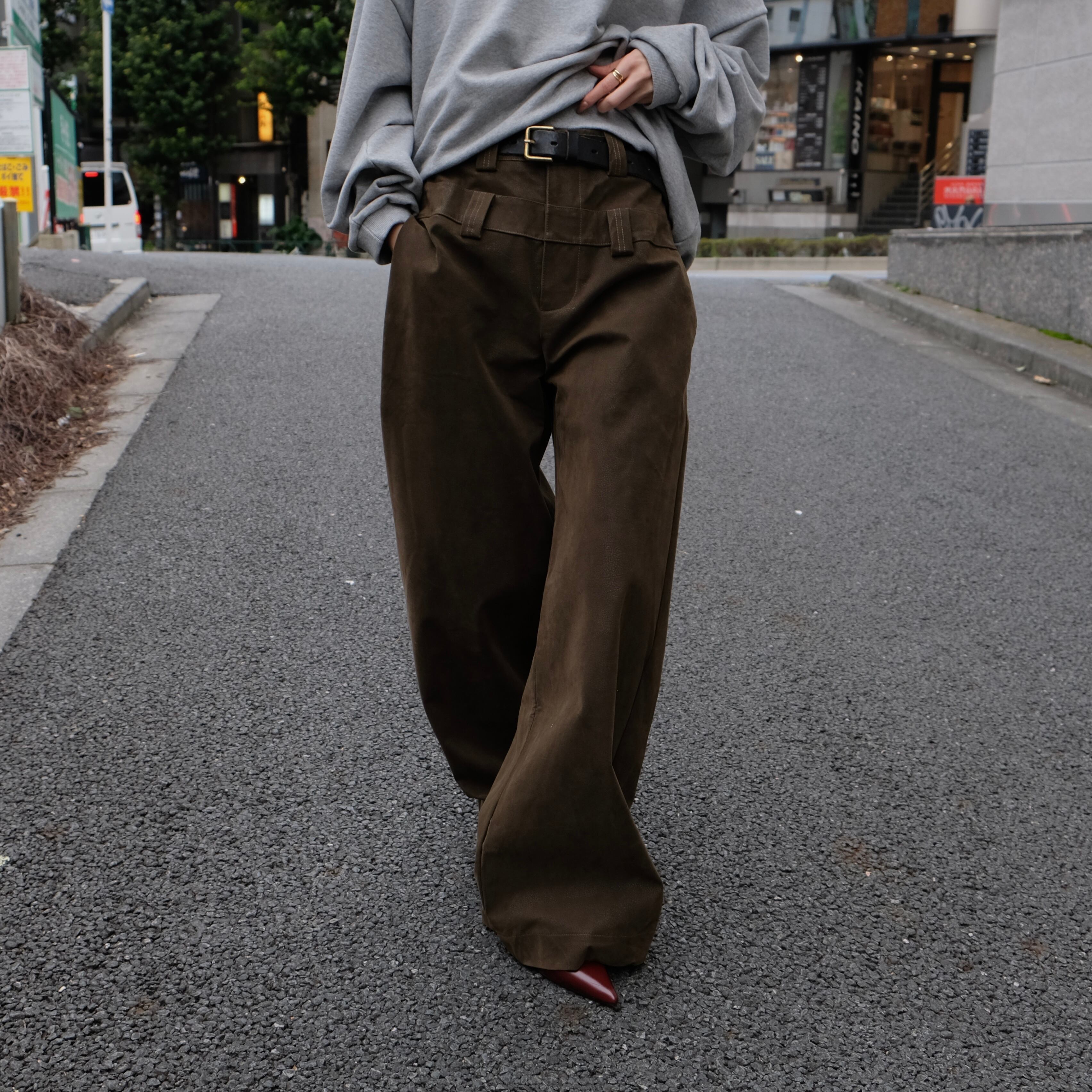 ベルトループが2段階でデザインされたカーキカラーの秋冬らしいワイドパンツ。