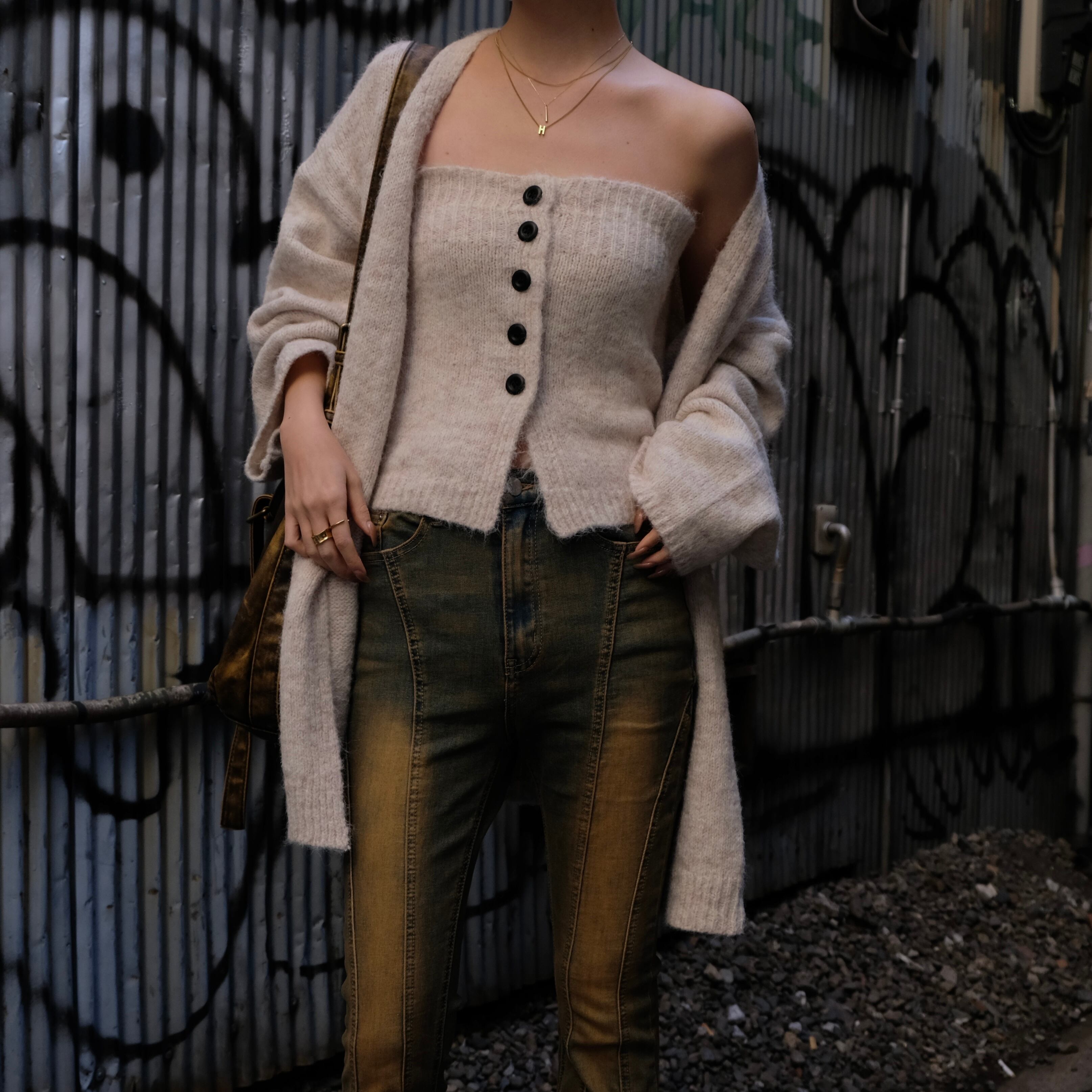 コンパクトなベアトップスにゆったりとしたオーバーサイズのカーディガンがバランスよく、女性らしい雰囲気のセットです。