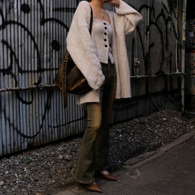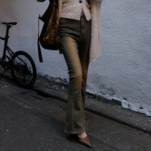 ヴィンテージムードを醸す独特なカラーが目を惹くフレアデニムボトム。