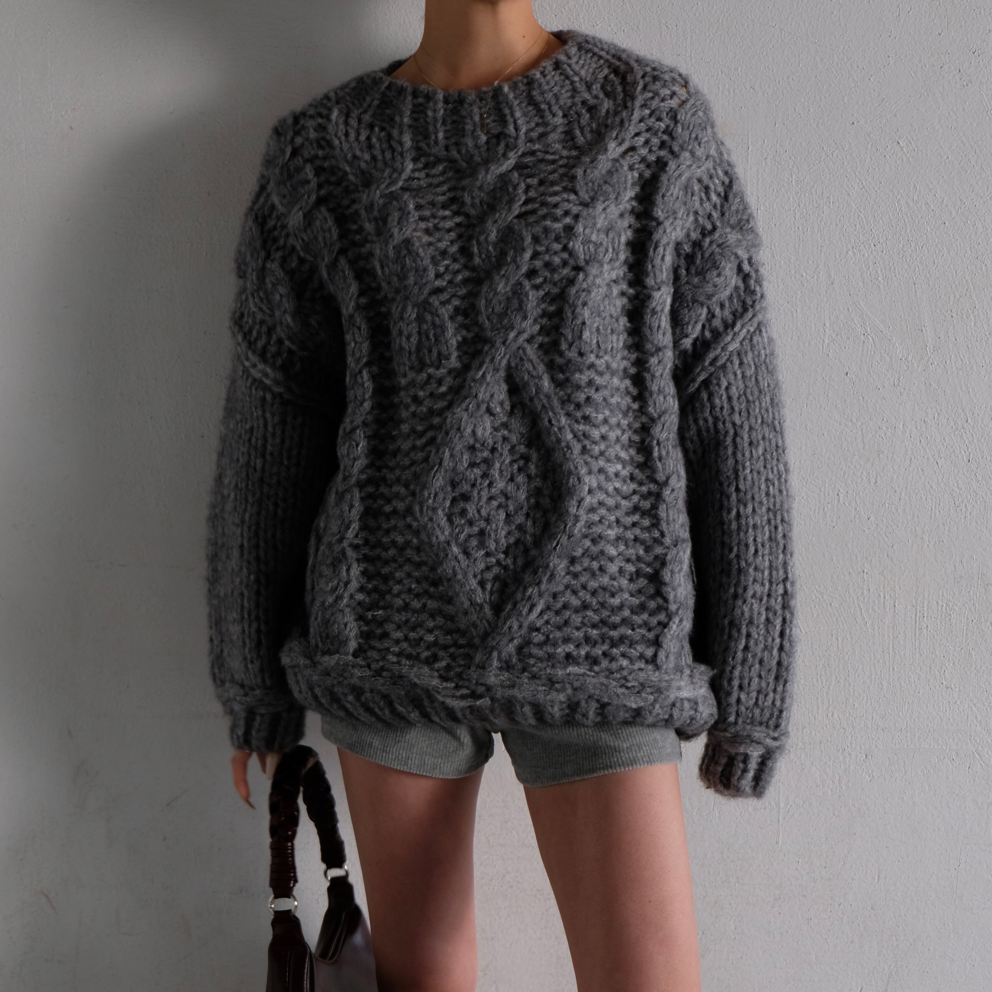 ケーブルの切替デザインが目を惹くボリュームたっぷりのオーバーニット。